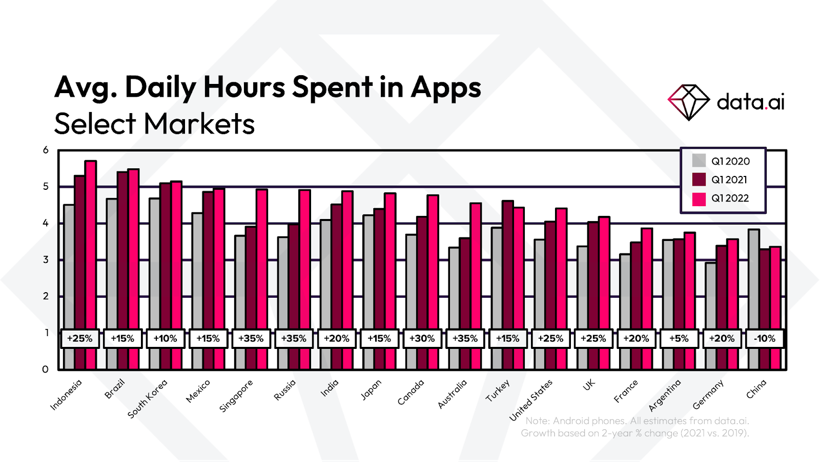 Аналитики сделали график сравнения с первым кварталом 2020 и 2021 года. Как видно на изображении, время в 2022 выросло почти на всех рынках, за исключением Китая. И это только на Android, как говорит дисклеймер внизу инфографики.