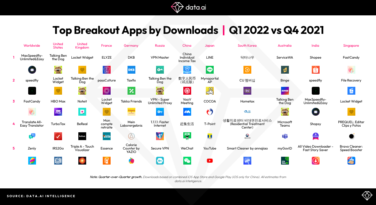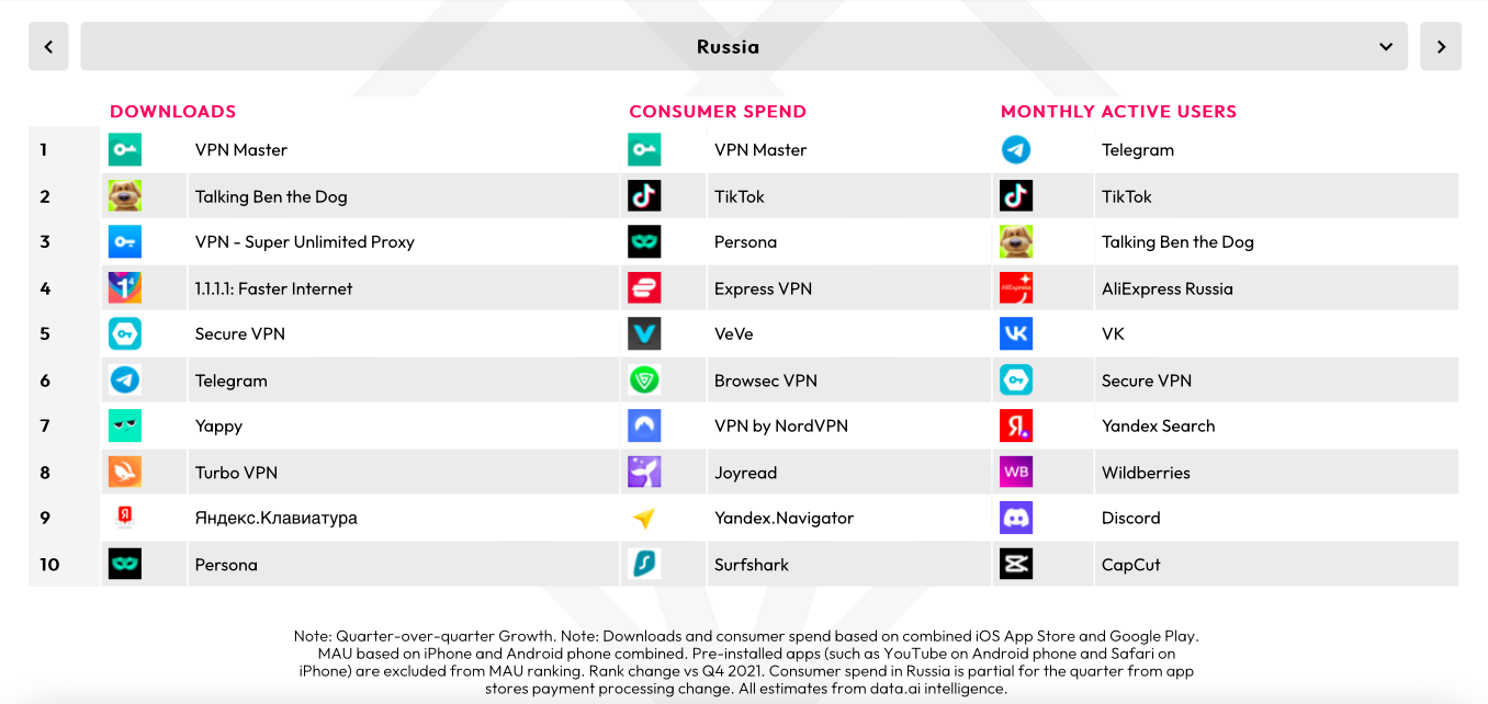 До этого момента большинство статистических фактов были посвящены итогам 2021 года и прогнозам на этот год. Но у Data.ai (экс-App Annie) уже появились данные по первому кварталу 2022. Не можем обойти стороной.