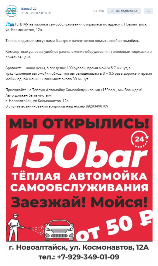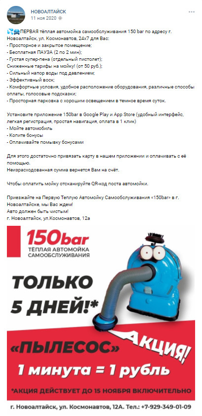 Мойку попросту не видно с проезжей части. Зато нет конкуренции, а рядом жилые дома — источник потенциальных клиентов. Здание под автомойку мы заприметили давно — увидели его на «Авито» за два месяца до открытия. Помещение из двух боксов. Первый пост — действующая автомойка. Второй пост был закрыт. Рядом располагается станция техобслуживания. Само помещение очень большое — около 250 квадратных метров. Высота потолков — 4,20 метров. Есть где разгуляться. В помещении сделали капитальный ремонт — оно совсем не было предназначено автомойки. Первый бокс — действующая автомойка. Он был неправильной Г-образной формы. Мы поставили перегородку, чтобы бокс стал соответствовать стандартам 150 bar. Второй бокс — закрытый. До этого бокс никогда не использовали в качестве автомойки. Поэтому его мы полностью переделали: Ещё одно преимущество помещения — высокие ворота. В одном боксе высота составляет 2,4 метра, в другом — почти три метра. Они позволяют принимать даже небольшие грузовые автомобили — маршрутные и строительные газели, микроавтобусы. Это значительно расширяет клиентскую базу. Станция тоже приносит небольшой доход — её мы тоже сдаём в аренду. СТО приносит нам одну четвёртую выручки. Подрядчиков нам искать не пришлось — у нас уже был пул электриков, сантехников и слесарей, с которыми мы работали ранее при запуске другой автомойки. Мы их пригласили поучаствовать и в этом проекте. Специалисты уже в курсе, как готовить помещение под автомойку, знают специфику. Объяснения требовались минимальные — это значительно ускорило процесс. В здании уже есть большое подсобное помещение, куда можно спокойно установить всё оборудование. Так что тут ничего дополнительно придумывать не нужно было. Однако установка оборудования несколько затянулась. Она заняла месяц, а ещё полмесяца ушло на наладку. Дело в том, что возникли неполадки с частотными преобразователями. Из-за этого и всё остальное оборудование отказывалось нормально работать. Оказывается, не было должным образом сделано заземление электролинии. Как с этим разобрались, дело сразу пошло быстрее. Плюс возник форс-мажор — из-за ремонта энерголиний почти десять дней отсутствовало электричество. Без него мы ничего делать не могли, поэтому установку оборудования пришлось временно поставить на «стоп». Поставщика мы выбирали долго, потому что в Новоалтайске довольно жёсткая вода, которая становится причиной разводов на автомобиле. В итоге остановились на AVS-химии. Моющие средства этого производителя подошли нам и по цене, и по качеству, и нивелируют проблему. Как мы уже сказали, мойку не видно с улицы. Поэтому основная задача маркетинга здесь — показать клиентам, что мойка существует и как её найти. Соответственно, чтобы добиться цели и получить лучший эффект, решили задействовать как можно больше рекламных каналов. Вот какие каналы мы использовали. Реклама дала видимый эффект: в течение двух недель приезжало много новых клиентов, которые до этого никогда на мойке не были. Кешбэк через приложение. Ночью за каждую мойку через наше мобильное приложение 150 bar начисляли клиентам приличный кешбэк: 5% для всех пользователей, 10% для такси «Максим». Запустили аудиорекламу в торговых центрах. Около полугода в пяти или шести магазинах «Мария-Ра» каждые пять-десять минут крутятся ролики, призывающие