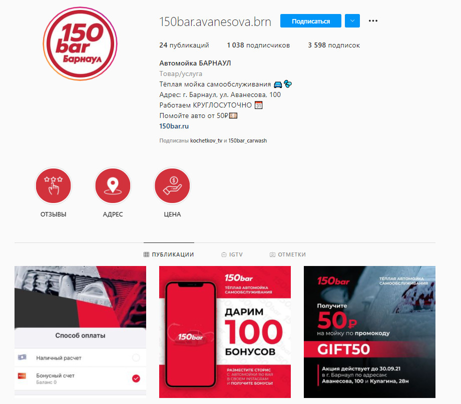 Раз помещение уже было автомойкой, то переделки требовались минимальные: Само помещение большое и просторное, состоит из двух боксов. На воротах заменили приводы, которые позволили им открываться автоматически. До этого ворота открывали вручную. С монтажом оборудования не возникло никаких сложностей: электричество уже было проведено, пол уже был залит. Опять же, дело в том, что раньше здесь уже была мойка, пусть и не самообслуживания. А значит, доделать нужно было по мелочи. Маркетинг, как и полагается на первоначальном этапе, был различным. Вот какие каналы задействовали. Листовки. На одной стороне листовок автомобилист мог оставить свой номер телефона, а на другой был указан адрес автомойки. Механика сработала хорошо и привела много новых клиентов. Акция с сетью заправок «Лукойл». Вместе с популярной сетью заправок провели акцию: тем, кто заправляется на 25 литров, выдают купон на 50 рублей на помывку машины. За счёт акции «Лукойл» повысил средний чек, а мы получили клиентов. Реклама в пабликах. Через паблики в социальных сетях мы сообщили об открытии мойки и рассказали о её преимуществах. Посты разместили в крупных барнаульских пабликах «ВКонтакте», «Одноклассниках» и Instagram: Barnaul22, «Я люблю Барнаул», barnaul.insta, «Чёрный список Барнаул» и др. Рекламная кампания оказалась очень успешной — после неё количество машин на мойке увеличилось. Помимо этого, ещё делали: Последние месяцы активно развиваем страницу мойки в инстаграме, который приносит хороший приток водителей. А сейчас ещё привлекаем таксистов через промокоды в мобильном приложении: за каждую помывку им начисляются баллы в виде денег. Таксистам это очень выгодно: они могут помыться за 100 рублей на 150 рублей. То есть 50 рублей уже лежит на счёте — надо доплатить только 100 рублей. С одной стороны, у мойки были хорошие стартовые условия: практически готовое помещение, требующее минимальных вложений. С другой, место не совсем удачное, без площадки для протирки автомобилей, удобного заезда и выезда и односторонним, хотя и плотным трафиком. В среднем в месяц автомойка принимает 1000-1200 машин. Со второго месяца она уже вышла в ноль — дополнительные инвестции больше были не нужны. Чистую прибыль мойка начала приносить только в июле 2021 года. До этого все доходы пускались на доработки. Сейчас оборот мойки составляет 100-150 тысяч рублей чистой прибыли в месяц. А это значит, что ей удалось выйти на окупаемость и достигнуть желаемых показателей.