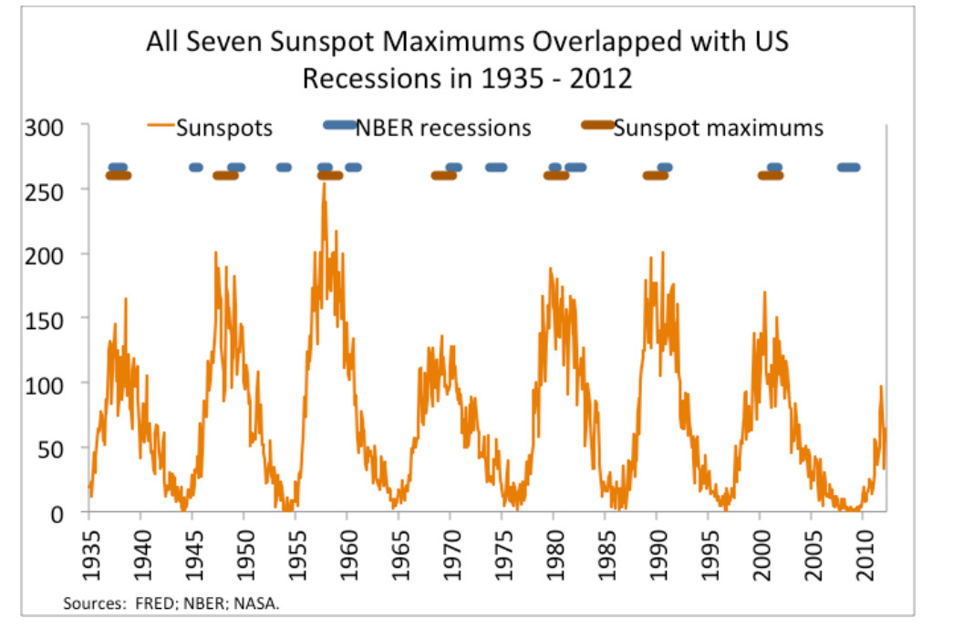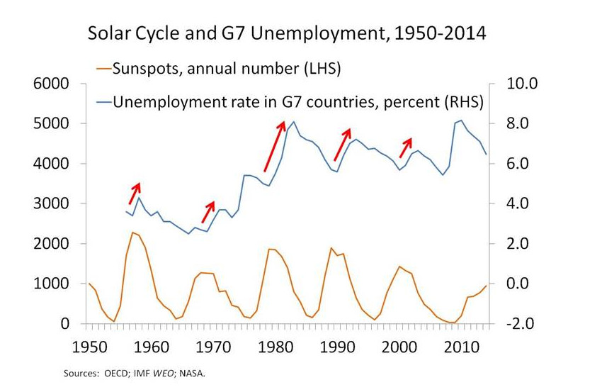 Статистика свидетельствует, что при достижении максимума вероятность рецессии почти гарантирована (синим). Почему рецессия в глобальной экономике происходит именно на максимумах солнечной активности? Возможно механизм такой же как и в революциях, когда экономическая активность в начале цикла дает развязку в конце максимума. Горбанев М http://www.gorbanev.com/ отмечает, что до великой депрессии включительно, депрессий было больше, они были длиннее (46% времени) . Возможно современная экономика это не только перепроизводство, но и просто цикл кредитных пузырей, но это трудно оценить поскольку общий долг, например в США, только растет (корпоративный и домохозяйств) . Я думаю где-то в недрах экономической науки это уже объяснено. Высокая инфляция, в худшей форме стагфляции тоже будет — поскольку невозможно хорошо бороться с немонетарной инфляцией (инфляция издержек) , монетарными методами. Если рост цен проник в производственные цепочки (сырье, зарплата, продукция передела), то фарш уже невозможно провернуть назад. В разных странах по разному. В США ФРС пытается ставкой сократить ликвидность по всем направлениям, но это тормозит всю экономику. Полумеры типа продажи нефти из запасов, приведут к необходимости опять ее закупать для пополнения. В РФ удлинение цепочек обхода санкций приведет к удорожанию импорта (в СССР было похожее). В общем сложнее найти сектор куда инфляция не распространится. Есть еще одна зависимость между уровнем безработицы и уровнем солнечной активности. Она уменьшается на максимуме, а потом резко растет к концу максимума. Видимо работают те же механизмы что и в рецессии. В нашем случае о повышении уровня безработицы стоит беспокоится в 2024 году, что косвенно подтверждается статистикой HH Таким образом, накладывая график солнечного цикла на разные экономические события можно найти много интересного. В приведенных ссылках есть исследования по композитному индексу CLI и некоторым другим, желающие могут ознакомится и сделать свои выводы. Как вы поняли ради этого все и писалось