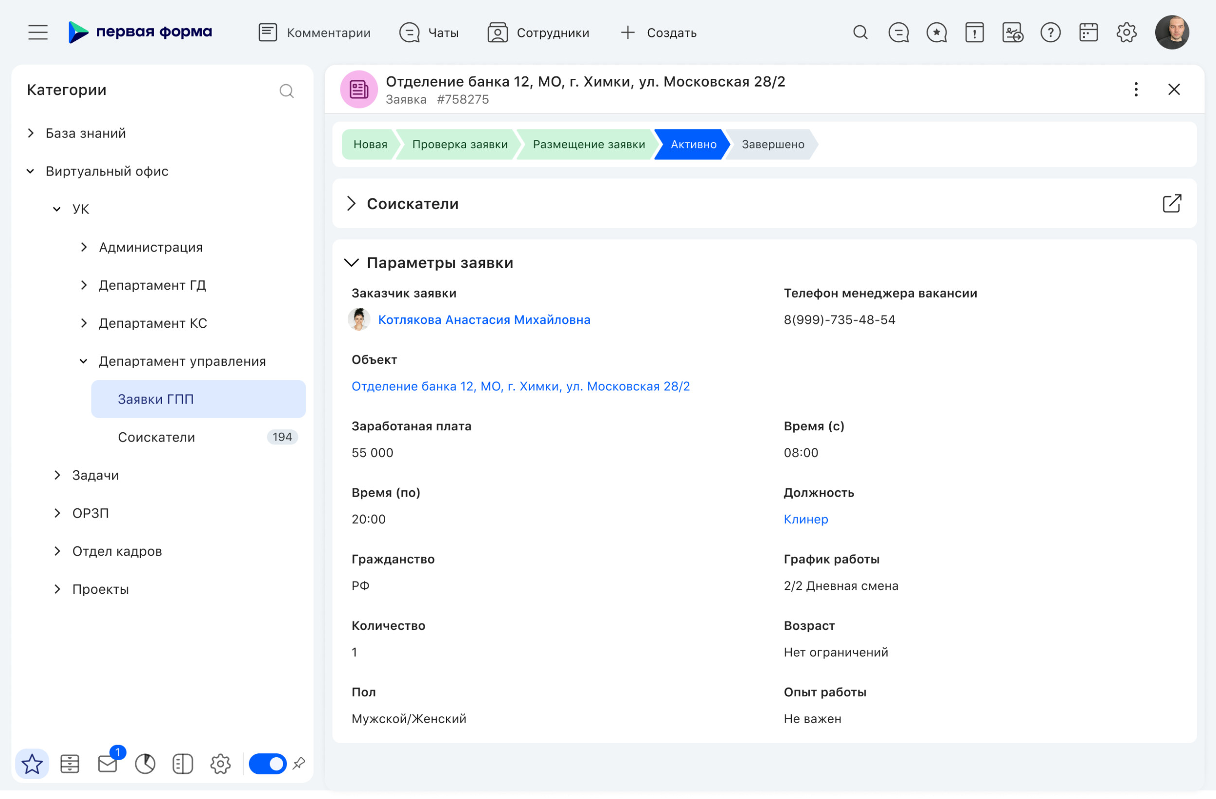 Теперь координатор указывает основные требования, HR-специалист добавляет информацию о зарплате, а все остальные параметры (адрес объекта, должность, график, требования) подтягиваются из справочников системы. Благодаря интеграции с платформами по поиску работы через API, рекрутер одним кликом размещает объявление сразу на HeadHunter, Авито и других джоббордах. Больше не нужно тратить время на переключение между разными аккаунтами — все действия выполняются в одном интерфейсе. Система подсказывает, какие данные нужны для каждой площадки. Отклики со всех площадок по поиску работы также собираются внутри системы. По каждому соискателю формируется задача с полной историей взаимодействия: звонки, сообщения, итоги собеседований. При положительном решении кандидат направляется к координатору объекта для финального собеседования. После собеседования кандидат может сразу заключить договор — он создает электронную подпись через Госуслуги, а координатор загружает его документы в систему. Договор подписывается с помощью ЭП Контур.Сайн. Информация автоматически передается в 1С: ЗУП для корректного учета и расчетов. Система самостоятельно распределяет задачи на онбординг между подразделениями: служба безопасности оформляет пропуск, АХГ готовит рабочую форму — без напоминаний. По такому же принципу происходит и увольнение: координатор только инициирует процесс, а система сама уведомляет ответственных за документы, аннулирование доступов и финальные расчеты. На объектах, обслуживаемых компанией внедрена СКУД BioTime с распознаванием лица. Благодаря интеграции со СКУД система фиксирует опоздания и прогулы работников, оповещая координатора. Обычно он находится на объекте или в пути, поэтому просмотреть уведомления и быстро найти сотрудника на замену может в мобильном приложении. В конце месяца данные о фактически отработанном времени загружаются из системы в 1С: ЗУП. На основе этих данных бухгалтер начисляет оплату. Координатор вносит отгул или больничный сотрудника в систему, где сразу видит лимит доступных ему выходных дней. Документирование всех отсутствий гарантирует корректное начисление оплаты и исключает риск ошибочных штрафов. Актуальный календарь отсутствий помогает руководителям заблаговременно планировать рабочую нагрузку и эффективно перераспределять задачи между доступными сотрудниками. Теперь все поручения клиенты компании оставляют прямо в системе. К задаче они могут прикрепить фотографии, схемы или инструкции. Такой подход обеспечивает полную сохранность истории поручений, исключает потерю информации и позволяет контролировать статус в реальном времени. Вся коммуникация ведётся в одном месте, что упрощает контроль качества и планирование работ. Подробнее о том, как автоматизировать полный цикл кадровых и HR-процессов в BPM-системе →