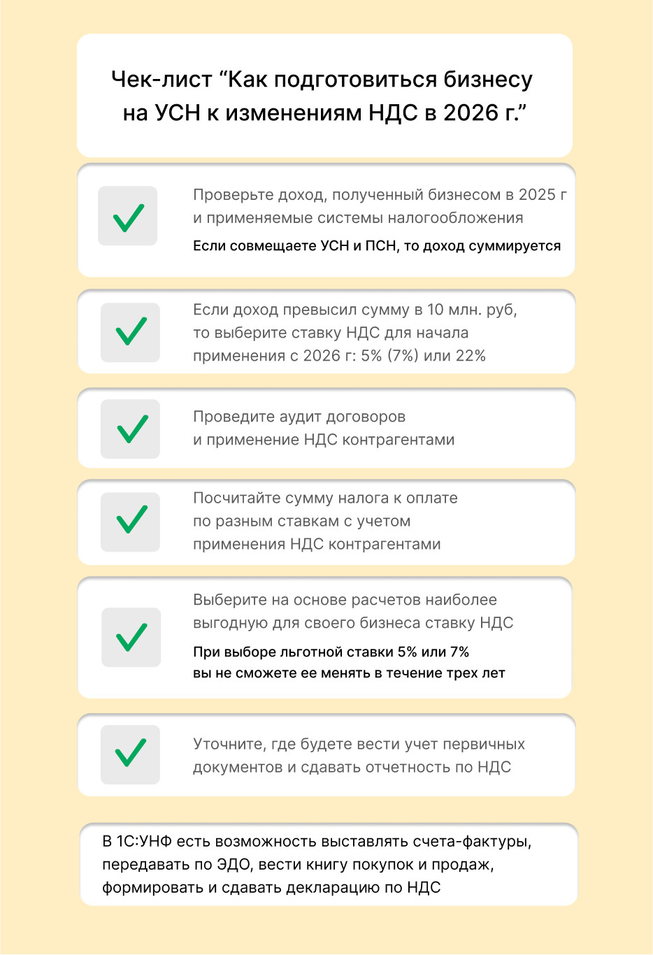 Подготовили для вас чек-лист для бизнеса на УСН по тому, что лучше сделать сейчас, чтобы быть готовым к работе по новым правилам в 2026 году. 1.Посчитайте доход за 2025 год, проверьте систему налогообложения. Помните, что при совмещении УСН и ПСН доход суммируется. 2. Если ваши доходы уже превысили 10 млн руб., то начинайте подбор наиболее выгодной ставки: НДС: 5%, 7%, 22%.