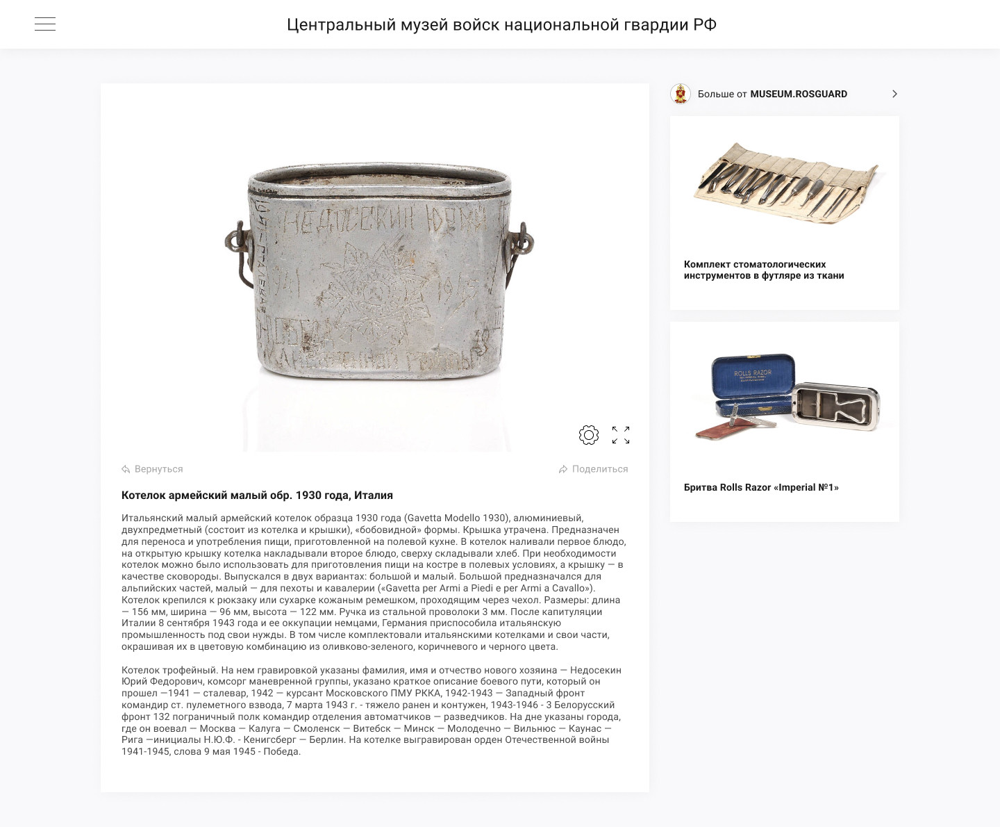 Одним из уникальных экспонатов является полевой котелок красноармейца Юрия Федоровича Недосекина. Предмет примечателен своей текстовой гравировкой, отражающей хронику важнейших событий 1940-х годов. С первых дней войны Юрий Федорович выбивал на котелке записи о разных этапах фронтового периода своей жизни. По географическим названиям можно отследить движение полка в западном направлении до конечной точки его пути к столице фашистской Германии.
