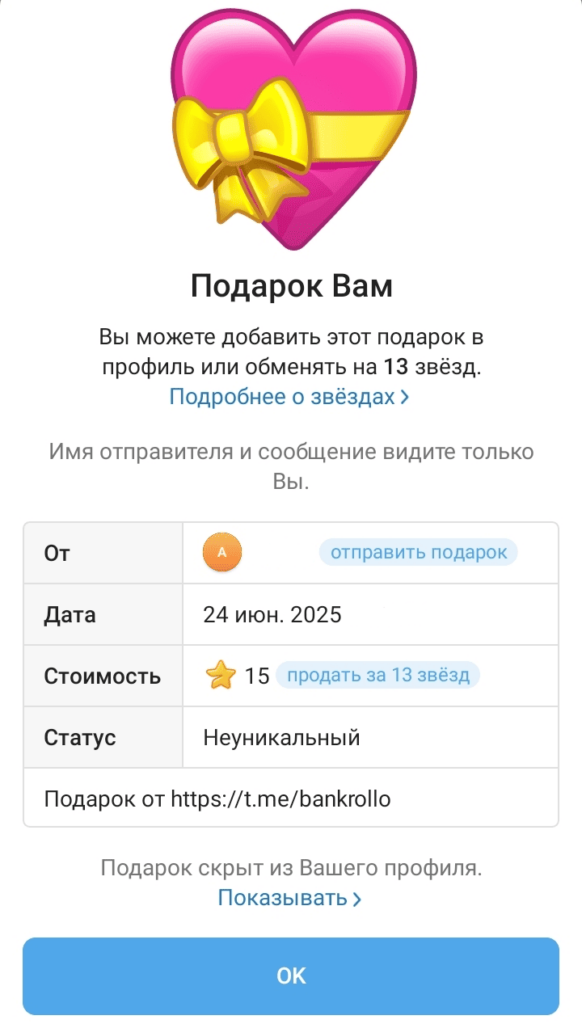 Эта механика имеет самую высокую конверсию, но вместе с тем имеет и самую высокую себестоимость. Каждый подарок стоит 15 Telegram Stars, и чтобы отправлять подарки, нужно сначала купить Telegram Stars