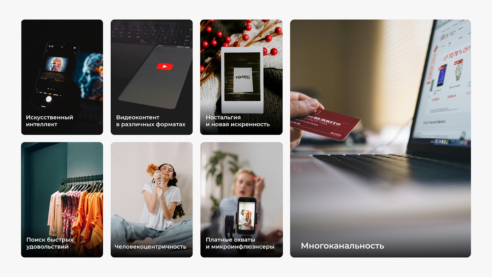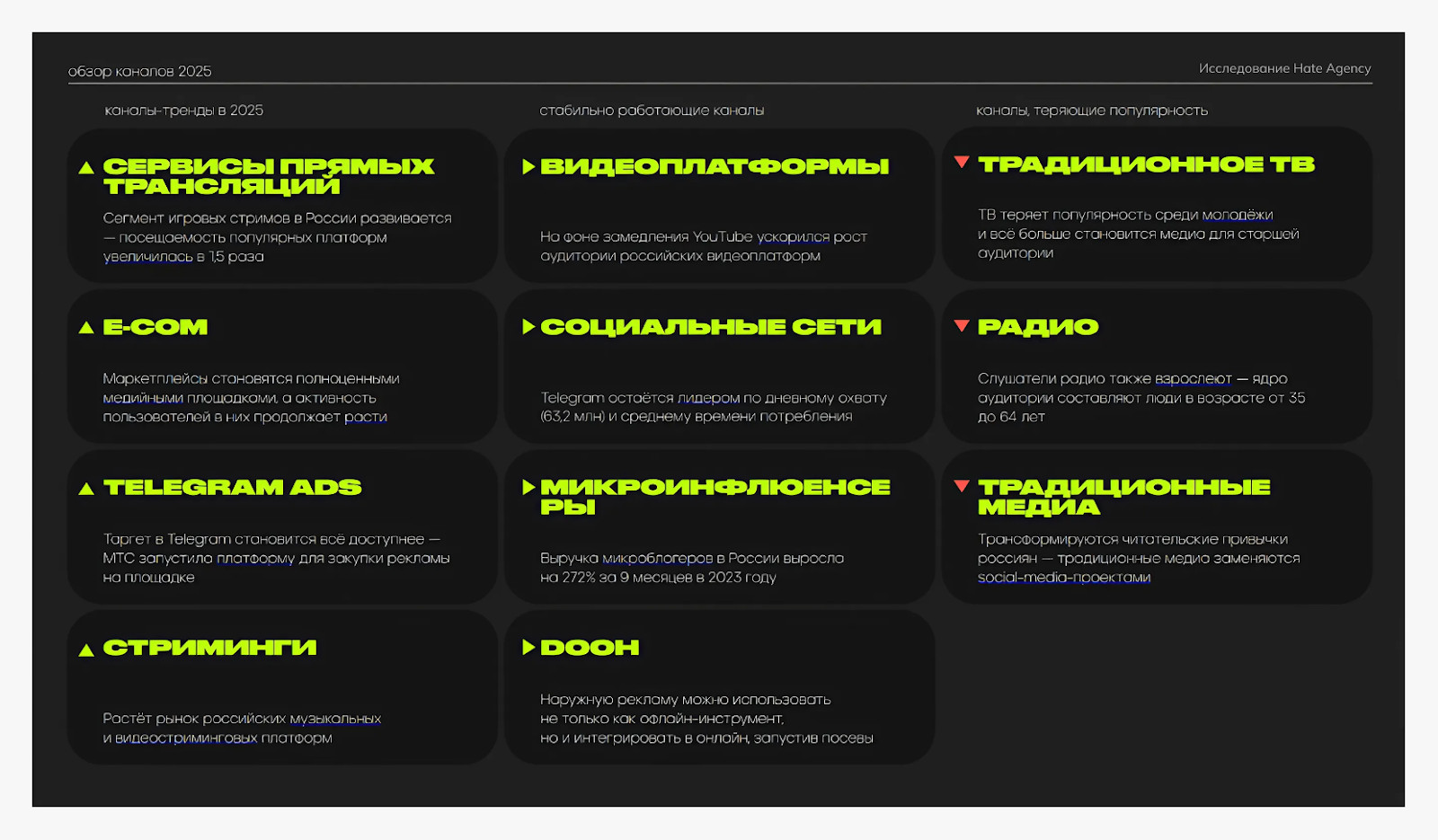 Безусловно, совместить все тренды в своем контенте возможно. Но зачем? Оставайтесь актуальными для вашего читателя. Оставайтесь настоящими для вашей аудитории. Появившийся скорее как игрушка для широкой публики, сейчас ИИ занимает подавляющий объем рынка контента. И не только контента: визуал, текст, код, презентация, музыка — с этими задачами нейросети справляются на потоке. В активной работе находятся уже нейропомощники и их младшие братья — чат-боты сервиса и поддержки. Однако по данным диджитал-агентств Hate и Socialist — аудитория начинает уставать от ИИ-тренда, искать и двигаться в сторону более искреннего и настоящего контента. Что не нравится пользователям? Когда ИИ пытается заменить их. Как родителя, работника, личность. Обученные людьми, нейросети часто очень стереотипны в своих изображениях и задают нереалистичные стандарты красоты. Чтобы нативно внедрить в свой бренд — равно контент — нейросети, задайте себе несколько вопросов: Короткий видеоконтент продолжает набирать обороты со времен взлета вайнов. Все сейчас снимают клипы или собираются начать. Однако не только короткие ролики заслуживают внимания. Видеоподкасты, шоу и интервью остаются востребованными форматами, успешно конкурируя с клипами. Отражая общее стремление к живому, настоящему общению, продолжает расти интерес к Live-стримингам. Однако успех прямой трансляции зависит от многих факторов, включая качество видео и занимательность контента. Спрос на высококачественный монтаж и визуальный сторителлинг продолжает расти. Завоевать внимание аудитории с помощью сырого контента станет еще сложнее. Несмотря на популярность клиповости и возможность попасть в топ с видео, сделанном «на коленке», качественное видео с продуманным сценарием и профессиональным монтажом будет привлекать внимание гораздо эффективнее. Настоящие отзывы о вашем продукте или услуге — это всегда хорошо. Если люди не готовы о вас рассказывать и советовать, то точно стоит пересмотреть подход к работе. Вместо тысячи слов — давайте посмотрим на цифры статистики разных исследований и опросов. Исследования Анкетолога утверждает, что при выборе бренда поколение Z обращает внимание на: * Гарантию качества — 54%. * Отзывы — 44%. * Цену — 32%. По исследованиям агентства «Ашманов и партнеры», репутация — ваш лучший продавец. Но отзывы в ней решают не все. Информационный вакуум вокруг вашего товара или услуги рождает жажду отзывов. Необходимо работать над созданием бренда, быть понятным для аудитории — в этом случае личная рекомендация клиентов станет лишь вишенкой на торте. Доверие покупают не отсутствием критики, а сильным информационным полем вокруг вашего бренда. Выстраивайте свою историю, и клиенты выберут вас, без сомнений. Пусть ковид и времена локдауна были в уже далеком 2020 году, но мы все еще продолжаем ощущать их влияние. В онлайн сейчас всё: от знакомств и заказа продуктов до работы и общения с друзьями. Концепция идеального баланса между работой и личной жизнью давно подвергалась критике. В 2025 году она окончательно теряет свой лоск: мы отвечаем ночью по рабочим вопросам, закрываем задачи по выходным, вносим правки прямо в вагоне метро, участвуем в созвоне из самолета. В таком ритме постоянное стремление к «балансу» будет восприниматься как еще один источник стресса и чувства вины. П