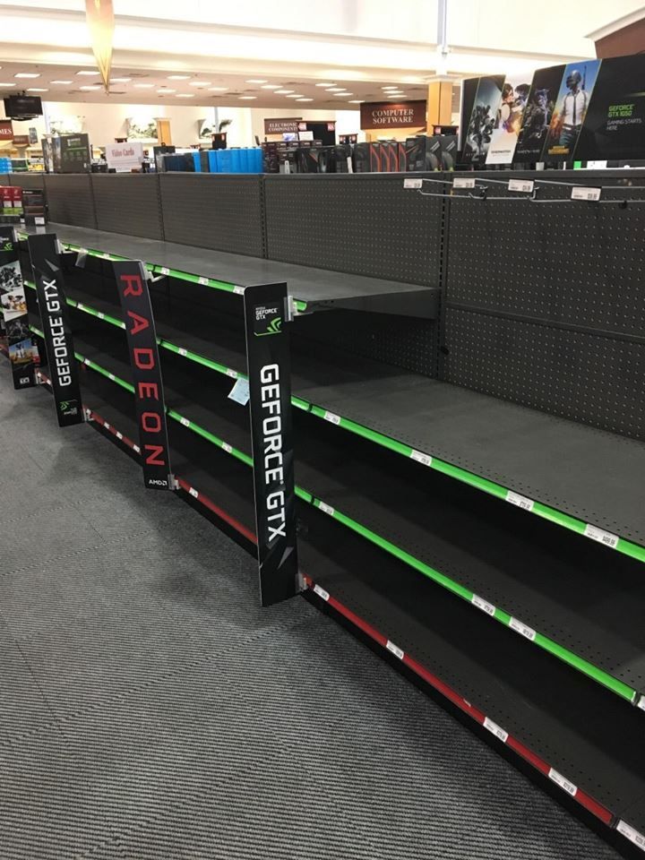 Каждый раз рост курса эфира провоцирует ажиотаж вокруг видеокарт NVIDIA. Это стало поводом для забавных постов в сети. Так один из пользователей reddit опубликовал фото из «горячей точки» - отдела продаж видеокарт супермаркета. Майнеры смели прилавки подчистую как только 9-го января эфир подскочил вверх. Кто как, а вот NVIDIA точно получает прибыль от крипты.Подписывайтесь на наш канал https://t.me/AraneoBit_Ru и будьте в курсе всех новостей