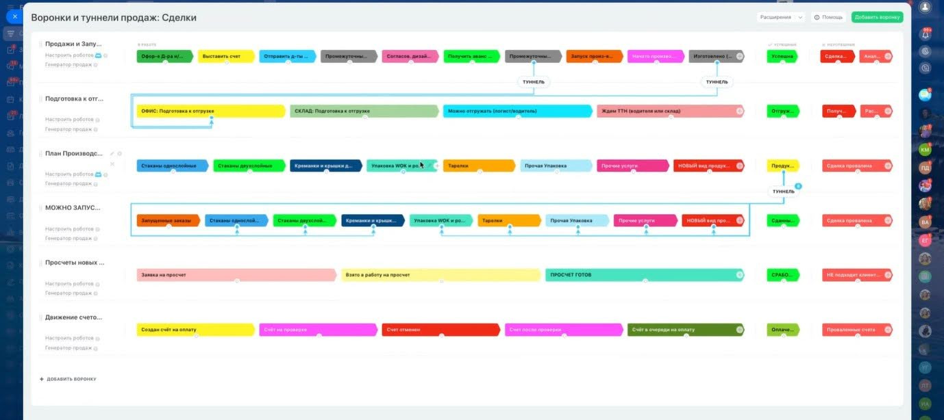 Заглянули за кулисы food-face.ru: записали классное интервью с руководителем об управленческих решениях и оцифровке. Советуем посмотреть! За четыре года мы превратили CRM в рабочий корпоративный портал — теперь через него проходят абсолютно все бизнес-процессы и работают основные отделы компании. Ниже разберем, почему выбор пал именно на эту платформу и как мы адаптировали ее под специфические задачи производства. Основной риск бизнеса без CRM — отсутствие актуальных данных для принятия управленческих решений. Без объединения всех каналов в единую среду руководство лишается возможности объективно оценивать финансовую картину и эффективность подразделений. Внедрение CRM позволило получить точные ответы на ключевые вопросы: Систематизация этих данных позволила минимизировать вероятность кассовых разрывов и оптимизировать график закупок сырья, что напрямую повлияло на исполнение обязательств перед крупными контрагентами и государственными службами. Когда бизнес-процессы выходят за рамки классических продаж, стандартные CRM пасуют. Обычно они предлагают лишь работу с лидами и сделками, в то время как нашему клиенту требовалась масштабная цифровизация: от склада до бухгалтерии. Чтобы объединить все подразделения в едином контуре, мы внедрили корпоративный портал Битрикс24. Это решение позволило выйти за границы просто CRM и настроить систему под специфические нужды производства food-face.ru. Стандартная модель CRM, состоящая из воронок «Лиды» и «Сделки», для нашего проекта была недостаточной. Для food-face.ru мы постепенно создавали архитектуру, которая сейчас включает 7 специализированных воронок для разных участков производственной цепи. Прежде чем настраивать софт, мы создаем карту бизнес-процессов. Наша задача — всесторонне изучить бизнес клиента, чтобы понять, как превратить хаос в систему. Воронка «План производства» Производственный цикл в food-face.ru стартует с этапа предварительных расчетов. Основная сложность здесь — работа с сырьем: на склад поступают массивные рулоны картона весом до 400 кг. Специалистам необходимо оперативно распределить их по категориям изделий, учитывая сорт материала. Параллельно отдел анализирует технологические риски, такие как специфика состава красок или наличие примесей в партии. Мы интегрировали эти процессы в отдельную воронку Битрикс24. Это позволило оцифровать работу отдела планирования: теперь в системе наглядно отображается объем продукции в работе, остатки сырья и расчетный выход изделий из каждой партии. Воронка «Просчеты новых видов продукции» Помимо стандартного каталога, компания создает упаковку сложной геометрии (например, в форме ромбов или треугольников). Прежде чем попасть в цех, такой индивидуальный заказ проходит стадию инженерной проработки и согласований. Специально для работы с нестандартными запросами мы внедрили свою воронку «R&D». Она превратила творческий процесс в четкий алгоритм: от создания первичного эскиза и тестового образца до запуска полномасштабного тиража. Воронка «Движение счетов на оплату» В структуре крупного предприятия финансовые потоки часто пересекаются, создавая избыточную нагрузку на бухгалтерию. Ранее хаотичная подача заявок от разных отделов приводила к путанице в приоритетах. Мы систематизировали этот хаос, создав воронку для контроля п