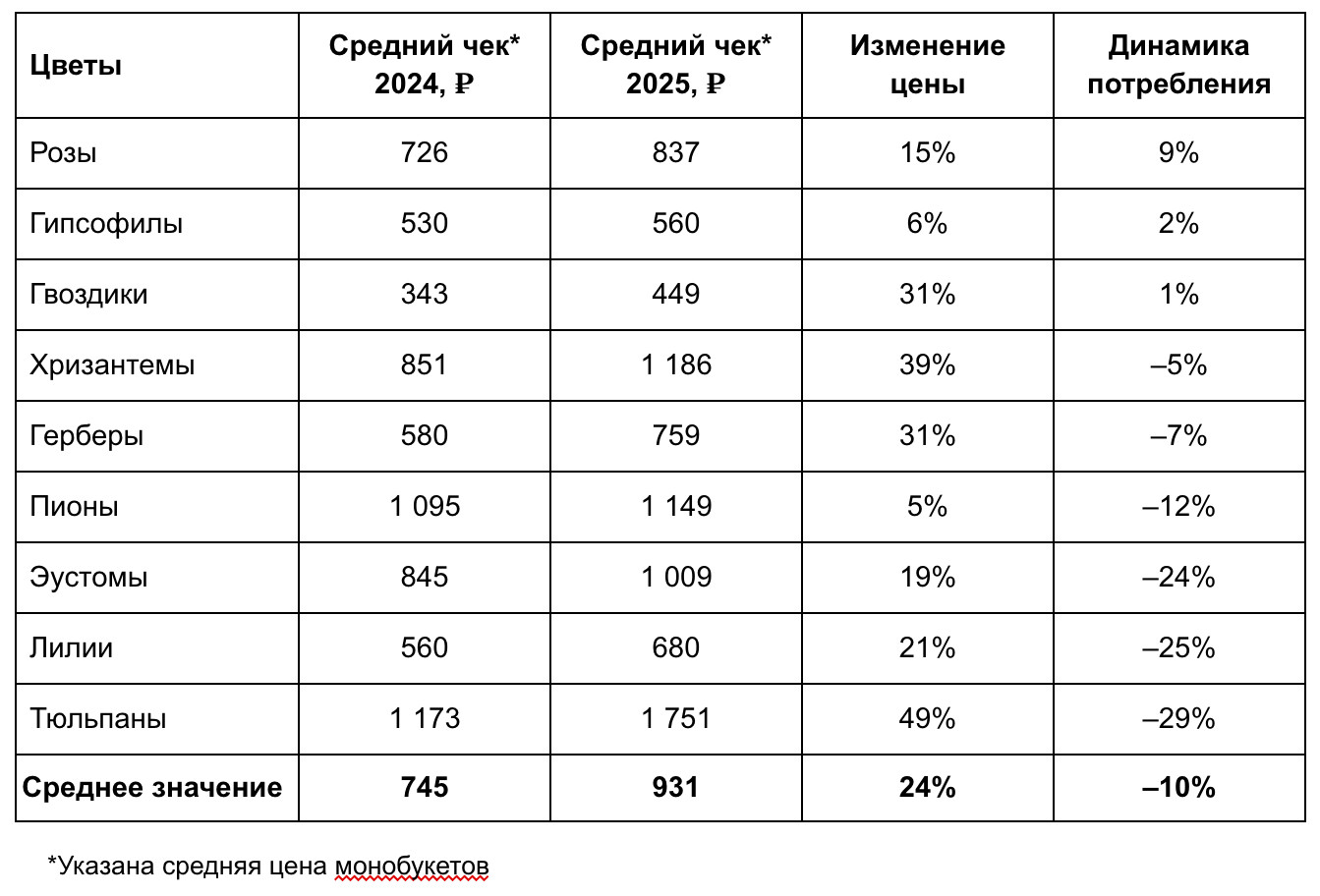 В 2025 году россияне стали чаще покупать розы — спрос вырос на 9%. При этом значительно сократились продажи тюльпанов и лилий: на 29% и 25% соответственно. Возможно дело в том, что тюльпаны подорожали почти в два раза, на 49%, а цены на лилии выросли на 21%.