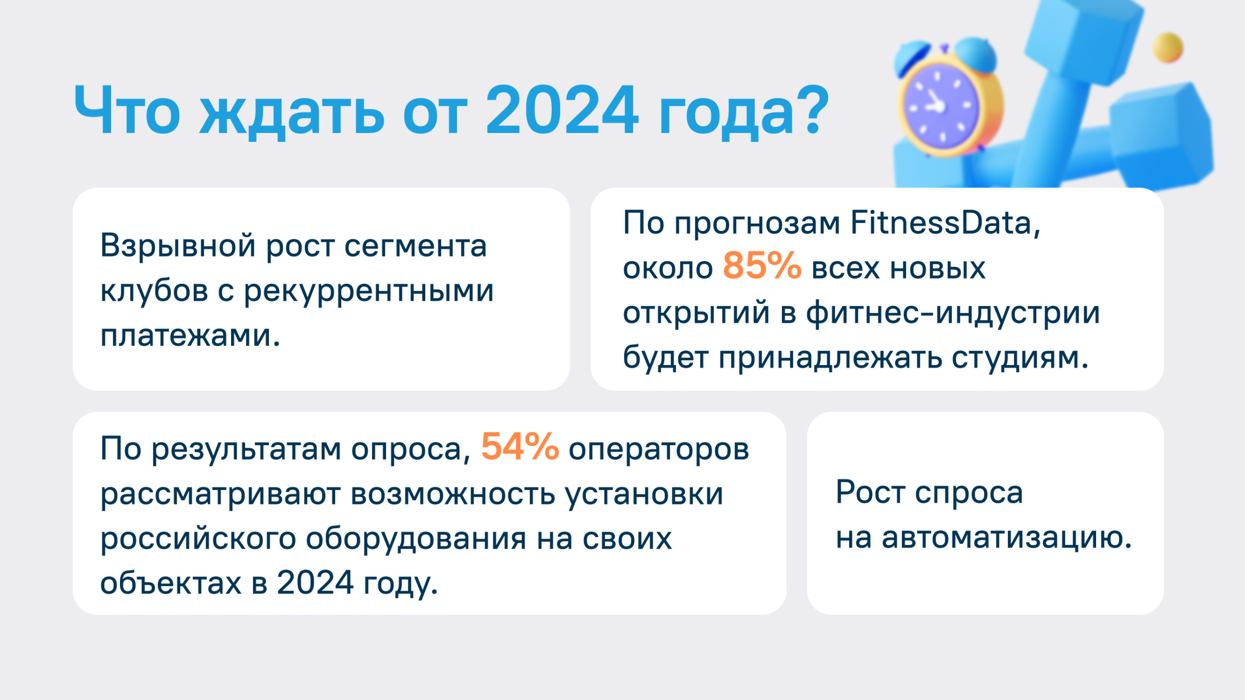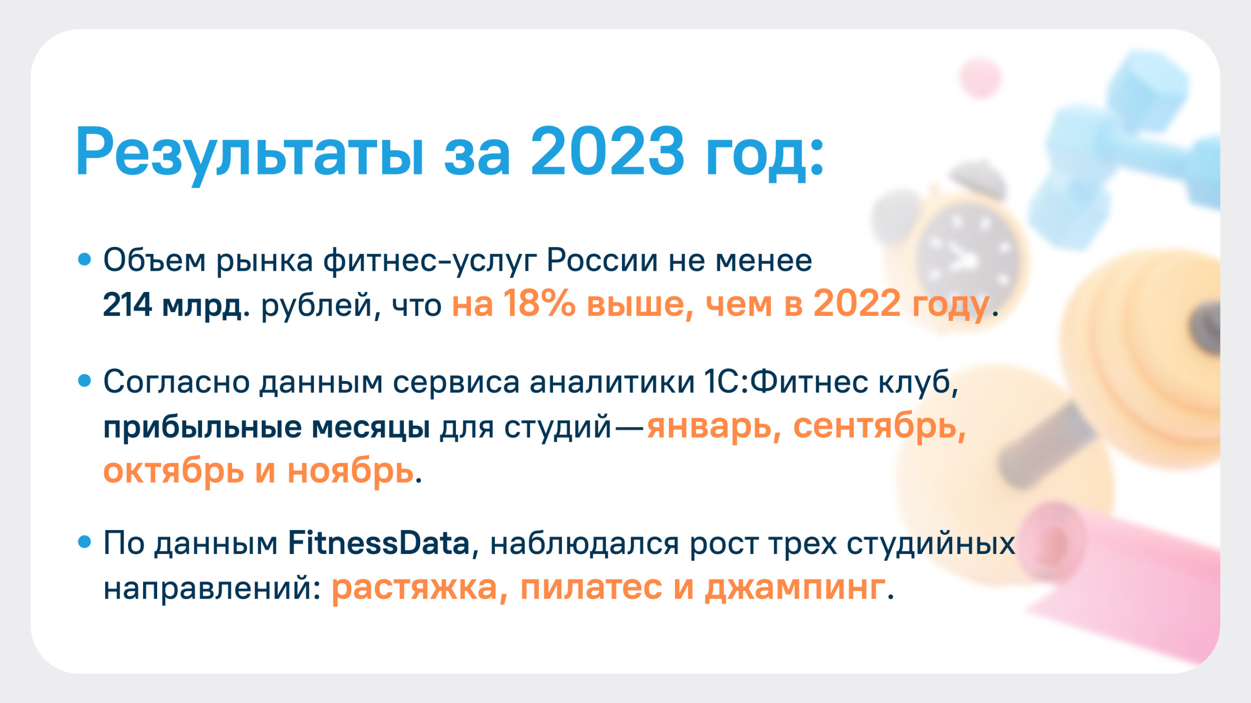По данным сервиса аналитики 1С:Фитнес клуб, в 2023 году чаще всего открывались следующие направления: школы танцев, студии растяжки и йоги, школы единоборств. Снижение сезонности. Ранее спад в летние месяцы достигал 25-30%, а в 2023 году он сократился. В некоторых регионах, например на юге России, в летний период показатели стали лучше, чем в осенний. Активное повышение цен в фитнес-клубах и студиях. Повышение цен связано с инфляцией, увеличением стоимости аренды и ростом заработной платы сотрудникам фитнес-объектов. По данным FitnessData прирост цен составил 12%. Рентабельность и расходы. Увеличение затрат в первую очередь связано с курсом доллара США, что привело к росту расходов в клубах на 20-30% к середине года. Капитальные затраты на строительство новых объектов выросли на 30-35%. Увеличение количества фитнес-объектов, которые внедряют автоматизацию. Большинство студий стали отказываться от ведения базы клиентов в Excel и теперь выбирают специализированные программы для автоматизации бизнес-процессов. Так как они сокращают время для выполнения рутинных задач, и повышают общую производительность. Рост сегмента клубов с рекуррентными платежами. Такая система удобна как для фитнес-объектов, так и для самих клиентов. Теперь средства автоматически списываются с банковской карты клиента, что упрощает процесс оплаты и снижает нагрузку на персонал. Тенденция к открытию студий сохранится. FitnessData предполагает, что около 85% от общего количества новых открытий в фитнес-индустрии будут принадлежать студиям. Это связано с тем, что для студий не требуются большие пространства, а инвестиционные затраты ниже, чем на открытие полноценного клуба. Растет спрос на автоматизацию. Благодаря программам автоматизации бизнеса фитнес-объекты могут сократить расходы на персонал, уменьшить время на выполнение рутинных операций и сосредоточиться на повышении качества предлагаемых услуг. Увеличение спроса на оборудование отечественного производства. В ноябре 2023 годаFitnessData провели опрос среди операторов фитнес-объектов и выяснили, что 54% из них рассматривают возможность установки российского оборудования в 2024 году. Российский рынок фитнес-услуг переживает период активного роста и развития. С каждым годом все больше людей осознают важность регулярных физических нагрузок и здорового образа жизни. Однако наряду с растущим спросом на фитнес-услуги растет и конкуренция между фитнес-клубами и студиями. Для того чтобы успешно конкурировать на рынке, фитнес-объектам необходимо предлагать клиентам не только широкий спектр услуг, но и высокое качество обслуживания, доступные цены и индивидуальный подход к каждому клиенту. Кроме того, необходимо следить за новыми тенденциями в сфере фитнеса и внедрять их в свою работу.