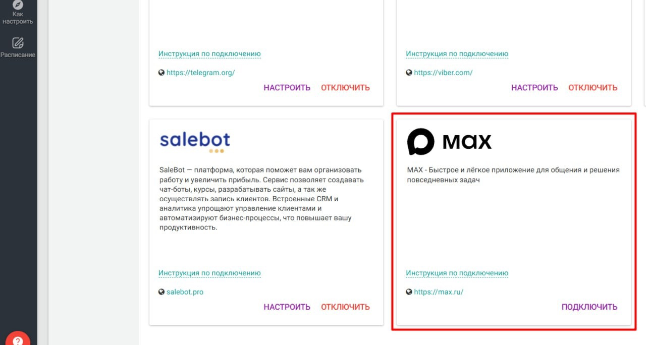 В настройках интеграции с соцсетями и мессенджерами вы найдете подключение к Max. С этой опцией вы сможете осуществлять переписку с клиентами, написавшими в чат-бот мессенджера, напрямую из EnvyCRM.