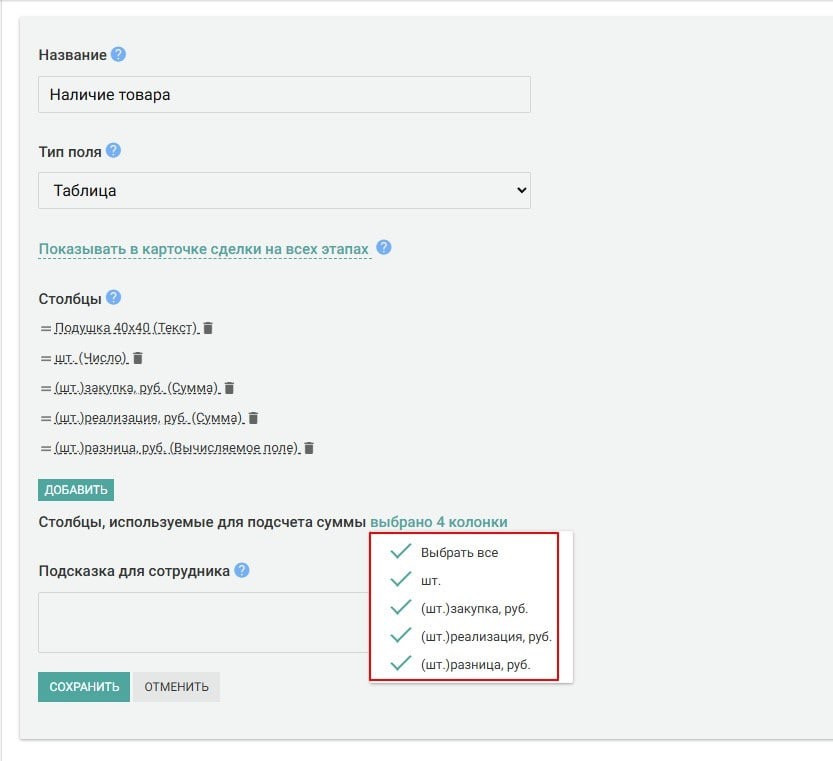 Подсчет суммы числовых значений столбцов в поле «Таблица»