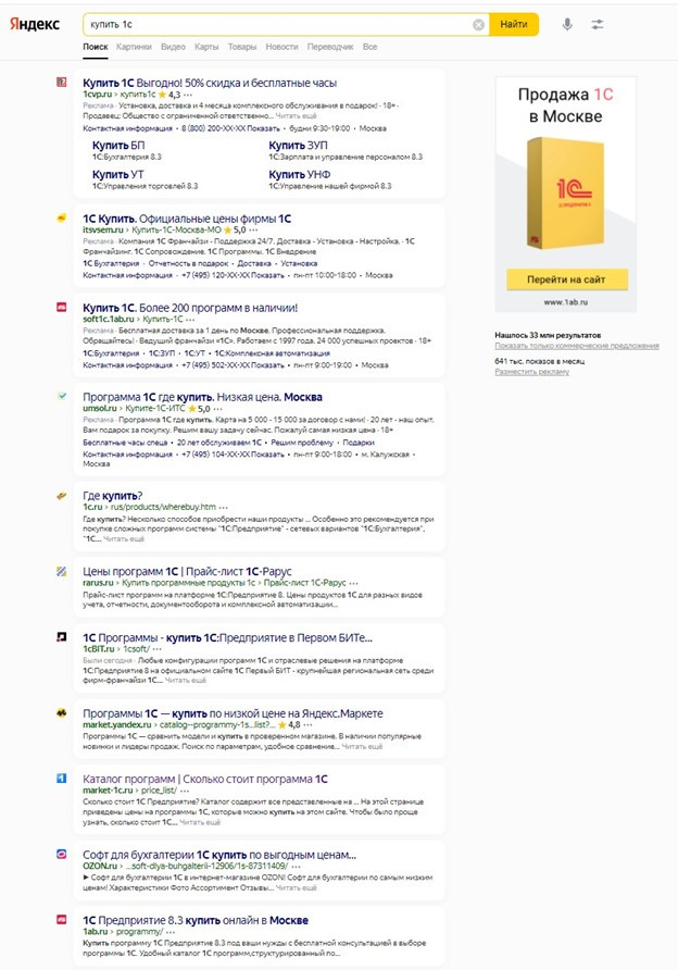 Более 630 000 пользователей в месяц вбивают в форму поиска Яндекса запрос «Купить 1С». Т. е. свыше полумиллиона человек ежемесячно находятся в поиске программы 1С.