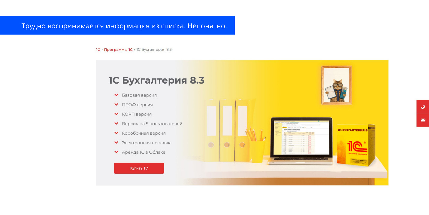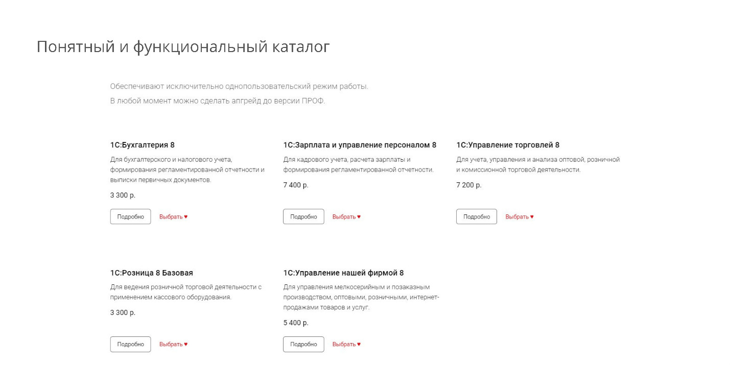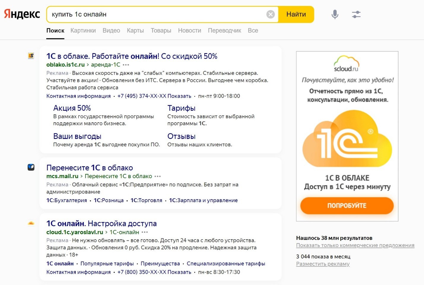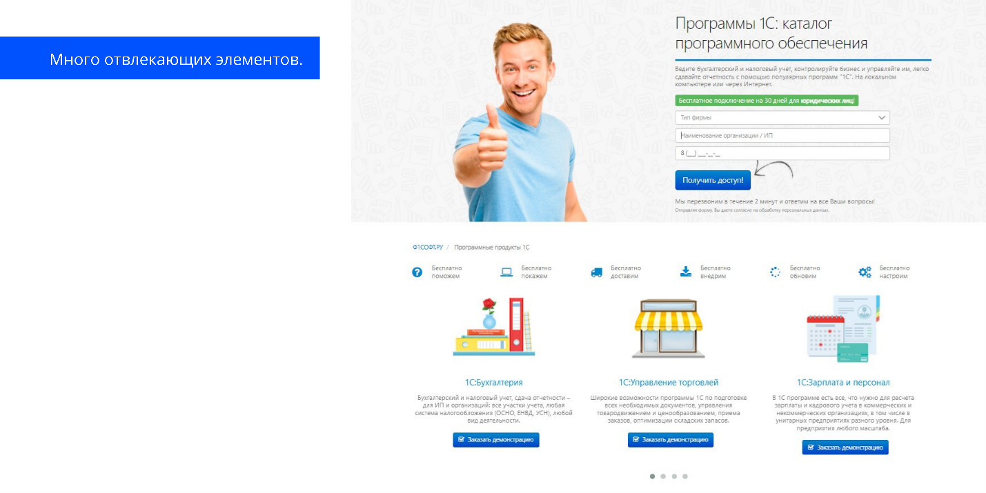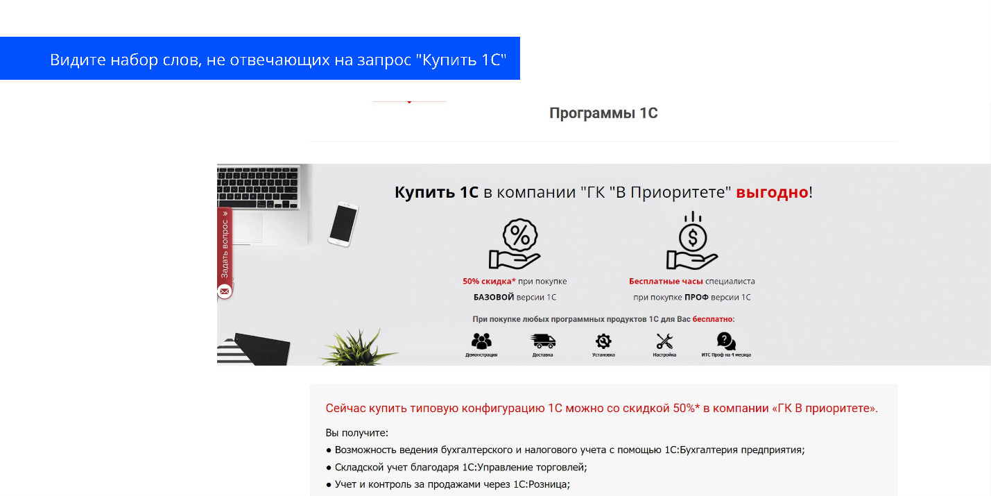 В итоге на сайтах первой выдачи Яндекса в ответ на запрос «Купить 1С» видим наборы непонятных слов (особенно для тех, кто впервые знакомится с «1С»), схожие преимущества, порядок работы и вечную акцию 50% скидки на базовые версии.