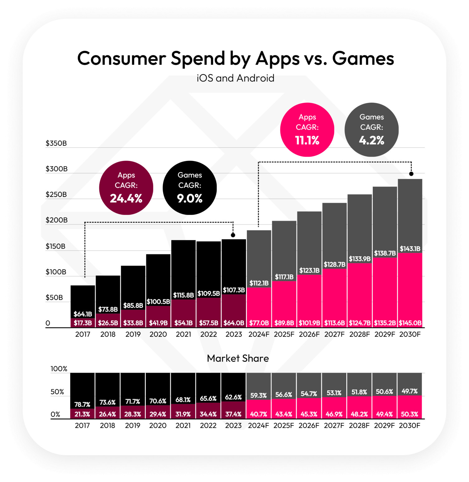 Аналитики ожидают, что среднегодовой прирост трат пользователей на мобильные приложения до 2030 года будет составлять 7,3%. Звучит довольно оптимистично — в период с 2021 до 2023 видим явное замедление. Темп роста доходов должен замедлиться: для игр с 24,4% до 11,1%, для приложений с 9% до 4,2%. Расходы пользователей на игры и приложения сравняются только в 2030 году. По мнению аналитиков Sensor Tower, в топ-5 категорий по тратам пользователей войдут «Развлечения», «Социальные сети», «Продуктивность», «Книги и справочники» и «Здоровье и фитнес». Это был краткий обзор главных выводов из нашего исследования, подробности про перспективные рынки и динамику доходов в мобайле читайте в статье. Ну а в 2030 году мы снова сравним предсказания аналитиков с реальностью. Подписывайтесь на наш телеграм-канал, чтобы не пропустить этот разбор и ключевые новости мобайла.