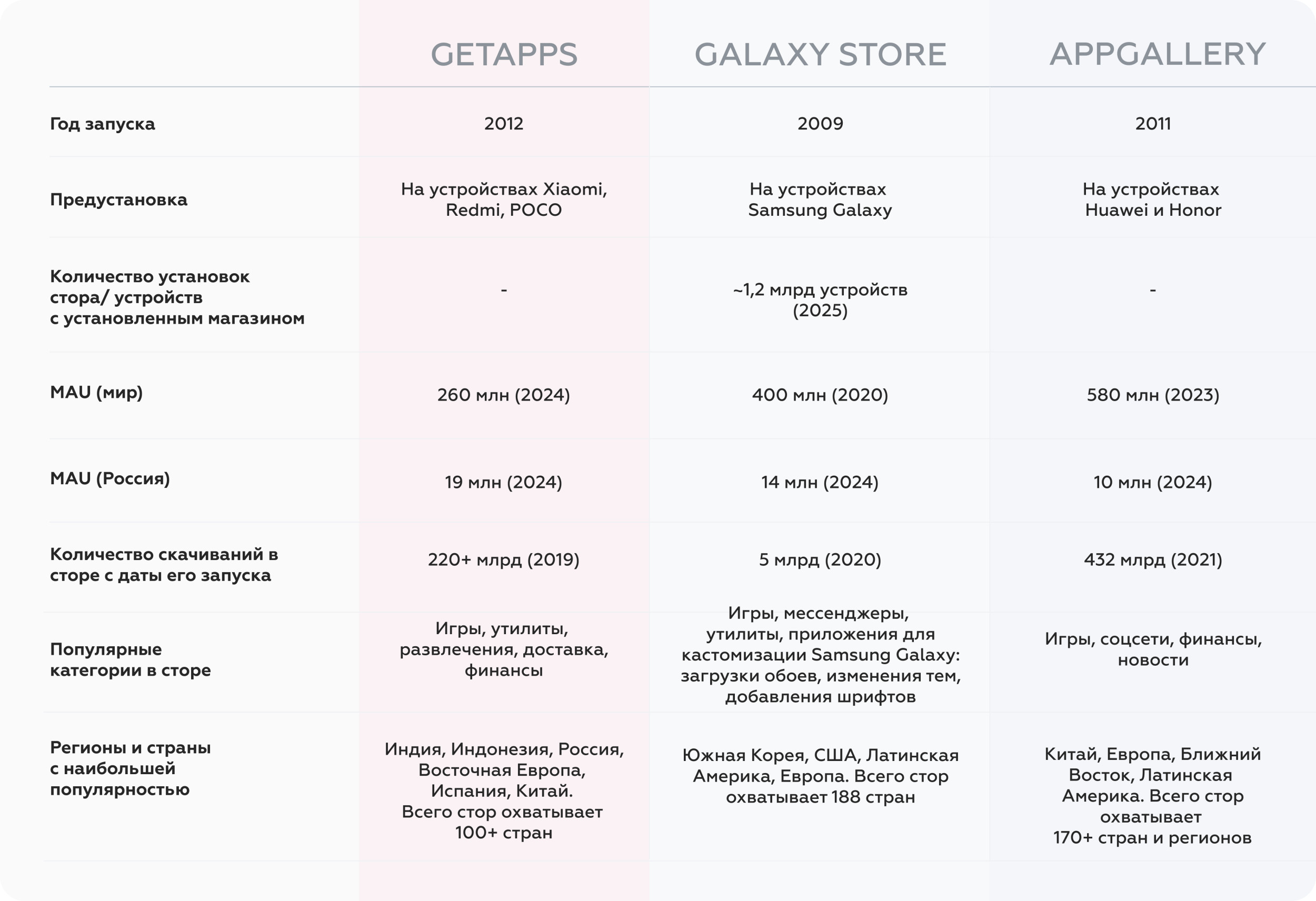 Они интегрированы в экосистему сторов и позволяют быстро запустить кампанию с доступом к их немалой аудитории (по открытым данным, например, у GetApps уже больше 200 млн пользователей, а у AppGallery — почти 600 млн).