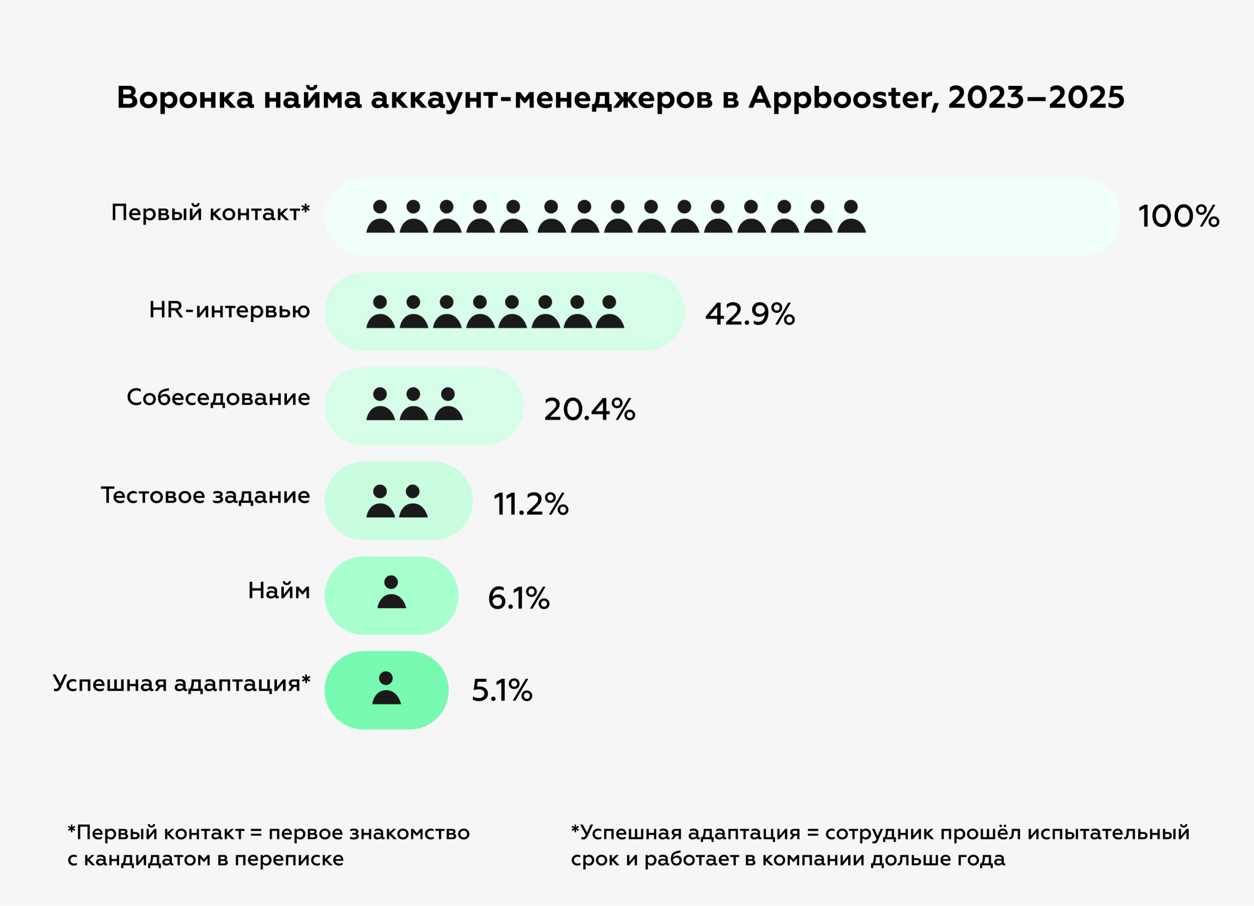 У нас есть портрет идеального кандидата, но при этом мы понимаем: редко все желаемые качества и навыки сходятся в одном человеке. Поэтому если у кандидата есть необходимая база, и он легко учится новому, то мы готовы дать ему шанс. Нам важно понять, подойдём ли мы друг другу: по ценностям, стилю общения и атмосфере в команде. В HR это называют culture fit. Сотрудник, с которым происходит мэтч, обычно быстрее адаптируется, более продуктивен и, скорее всего, останется в агентстве дольше. Мы в Appbooster ценим проактивность, открытость и считаем, что ошибки — нормальная часть работы. Поэтому на собеседовании вне зависимости от позиции всегда спрашиваем про прошлые ошибки и факапы. Всего один вопрос, а сколько можно понять о человеке из его ответа: Аккаунт-менеджерам мы задаём вопрос похожего формата: просим рассказать о каком-то сложном или негативном опыте взаимодействия с клиентом. Из ответа понимаем, как человек реагирует в сложных ситуациях, как рефлексирует и решает проблемы. Бывает, что кандидат волнуется. Тогда можем подать ему пример: поделиться историей собственного факапа, вспомнить случай с требовательным клиентом. Что в итоге отвечает большинство? «Не могу вспомнить сложных клиентов» или «Вроде всё было хорошо». Хотя если работаешь с людьми, конфликтные ситуации не редкость. Ещё один частый тип ответов — когда кандидаты начинают рассказывать не о собственном промахе, а об ошибке команды или коллеги. Раньше мы давали кандидатам довольно сложный кейс в качестве тестового задания. Нужно было решить конфликтную ситуацию с клиентом, который недоволен результатами рекламной кампании. Для этого — разобраться в отчётах и специфике продукта. На первый взгляд задание казалось подходящим, но с ним было сразу несколько проблем: Получается, тестовое задание не отражало то, с чем по факту предстояло работать. Поэтому от него отказались и сделали новый вариант. Наш текущий формат тестового отличается от принятого на рынке. Сначала даём кандидату задачу — подобрать поисковые запросы для продвижения конкретного приложения. Нанимающий менеджер предоставляет все необходимые материалы и список сервисов. Этой информации достаточно, чтобы новичок мог выполнить задание. Когда всё готово, следующий этап — созвон один на один. Кандидат презентует своё решение, тимлид даёт обратную связь, разбирает ошибки и удачные моменты. Так мы проверяем самые важные хард- и софт-навыки аккаунт-менеджера. Например: Тестовое с онлайн-встречей полезно для обеих сторон. Тимлид может оценить совместимость с потенциальным сотрудником. С другой стороны, и кандидат успевает присмотреться к будущему руководителю. Комфортно ли с ним общаться, произошёл ли мэтч? В результате каждый может сделать осознанный выбор о дальнейшей работе. Каким бы ни было финальное решение, каждому кандидату мы направляем подробный фидбэк. Отмечаем положительные моменты и то, над чем стоит поработать. Может показаться, что объёмное тестовое задание сильно увеличивает срок найма. Но это не так: в среднем мы нанимаем нового аккаунт-менеджера за 39 дней. Это попадает в мировые и российские бенчмарки, хоть и по верхней планке. Главный минус нашего подхода очевиден — это ресурсозатратно. Тимлид должен потратить много своего времени на общение с кандидатом. Но в итоге эти усилия окупаются: мы полу