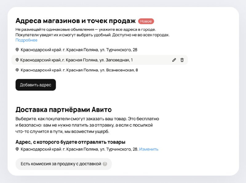 Таким образом профессиональные продавцы смогут указывать сразу несколько точек продаж в рамках одного города, что позволит не упускать потенциальных клиентов и сократить бюджет на продвижение. На текущем этапе опция доступна в категориях «Запчасти», «Мебель», "Ремонт и строительство".У многих продавцов на Авито есть несколько точек продаж в одном городе, но, чтобы рассказать об этом раньше, им приходилось создавать дополнительные объявления с тем же товаром. Нововведение позволит указать в объявлении до 10 адресов магазинов и точек продаж в одном городе. Продавцам новая функция даст возможность не упускать клиентов из-за особенностей поиска по карте, а также быстрее размещать объявления с разными адресами. Достаточно создать одну публикацию и добавить туда все точки продаж. Это также позволит сократить бюджет на продвижение — вместо нескольких объявлений с разными адресами можно продвигать одно.