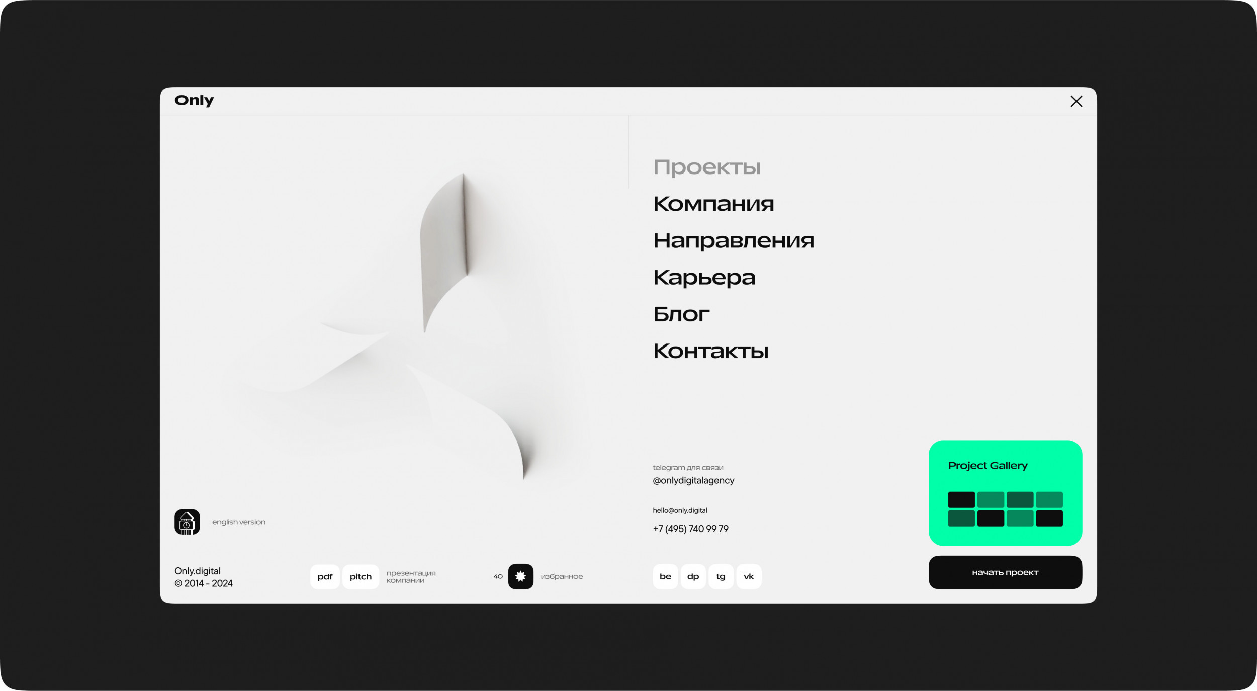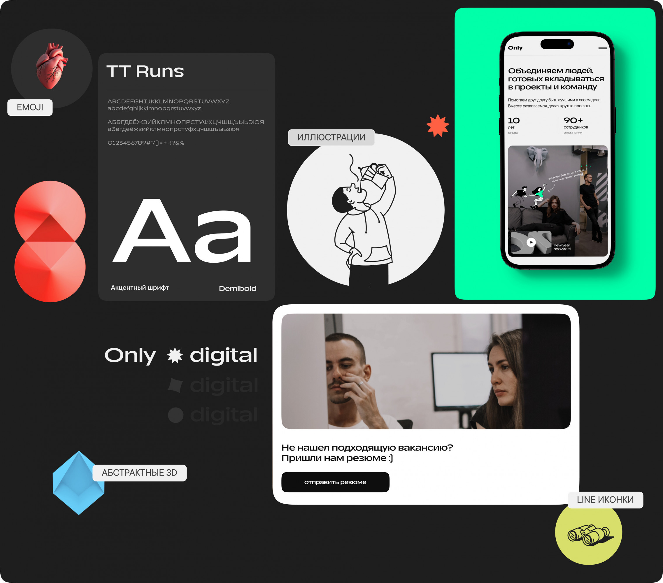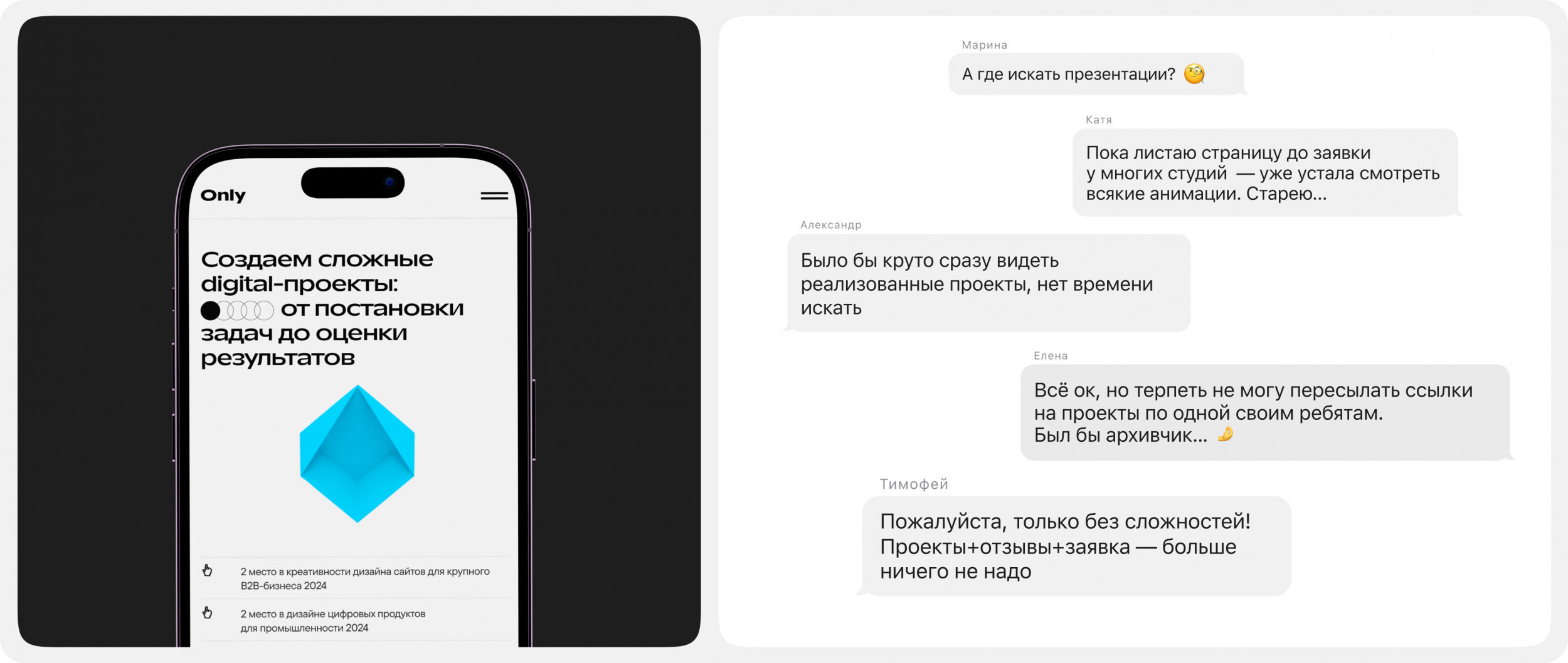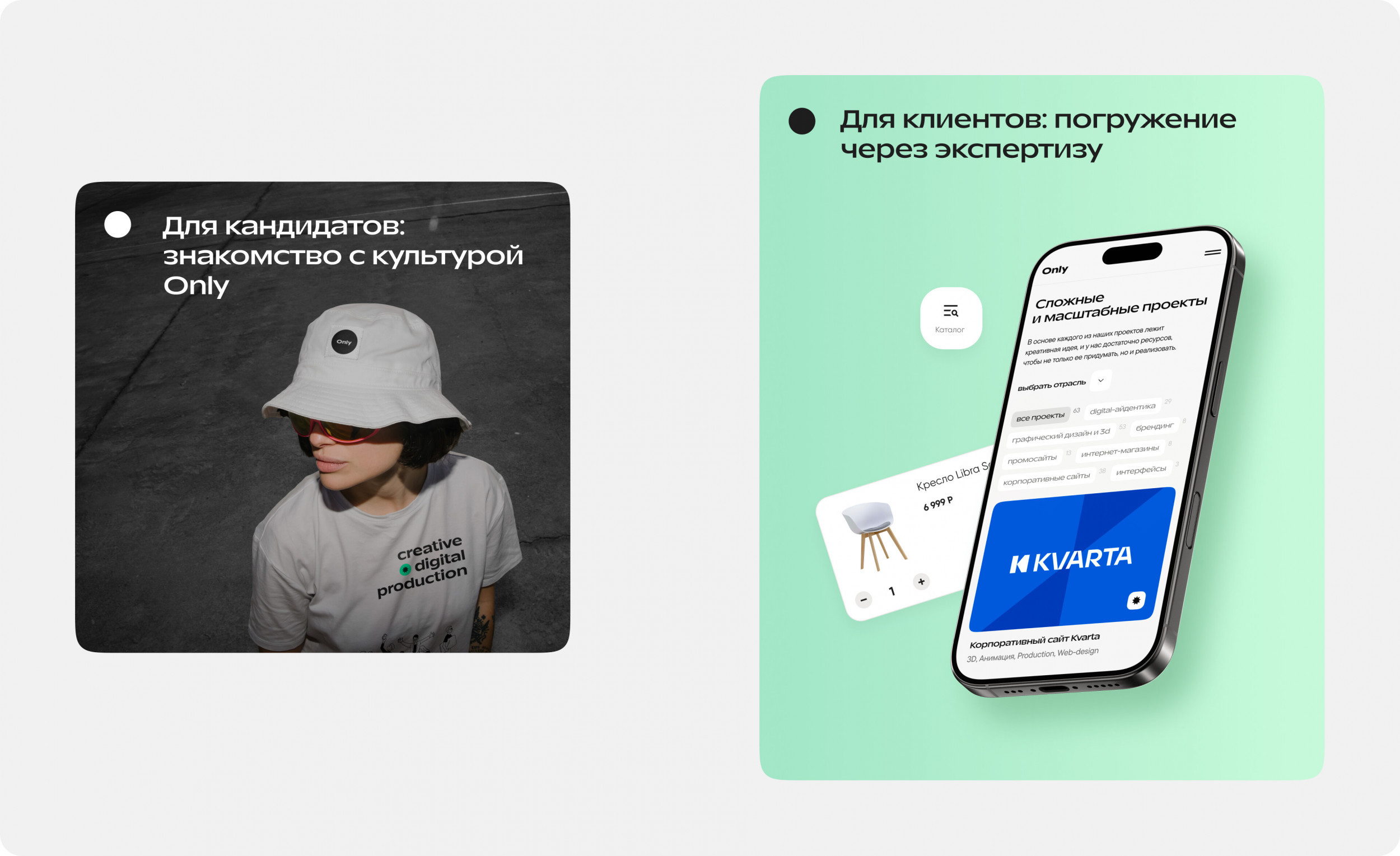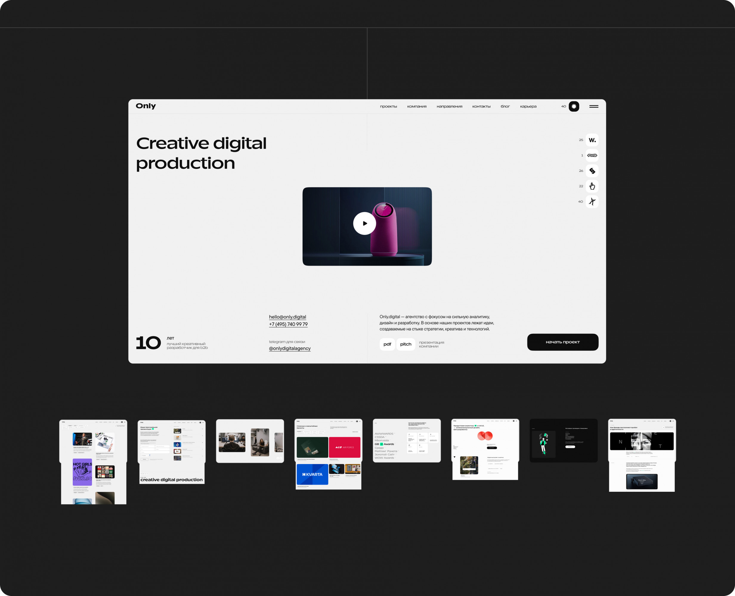 — Визуальный стиль адаптирован под разные аудитории: он отражает наш профессионализм для клиентов, а для будущих сотрудников — передаёт атмосферу и ценности компании. Заново выстроили логику сайта, превратив его в инструмент, поддерживающий весь процесс принятия решений — от первого знакомства с агентством до отправки заявки. Быстрое понимание ценностей, атмосферы, ведение рабочих процессов приводит к отправке резюме в несколько кликов. Мы начали с изучения потребностей нашей аудитории и внутренних процессов компании. — Клиенты говорят — мы слушаем. Интервью с отделом продаж выявили несколько важных моментов: клиенты хотят быстрее находить примеры проектов, удобно сохранять информацию, получать презентации и сразу подавать заявку. — Данные веб-аналитики. Исследование старого сайта показало: ключевые страницы не удерживают пользователей, а формы заявок вызывают сложности. — Рынок и конкуренты. Анализ сайтов других агентств показал, что многие из них перегружены. Часто судии, в особенности молодые, делают ставку на визуальные эффекты, теряя в удобстве. Мы поставили перед собой цель — сделать сайт, который будет одновременно стильным и функциональным. При проектировании бизнес-логики мы стремились к тому, чтобы сайт стал не просто витриной, а настоящим инструментом для продаж. Он должен помогать клиентам понять наши возможности, погрузиться в проекты и принять решение о сотрудничестве. Обновление сайта совпало с еще одним масштабным процессом — формированием платформы бренда Only. За 10 лет на рынке мы пришли к осознанному позиционированию, которое отражает нашу корпоративную культуру и помогает привлекать именно «своих» клиентов. Мы детально изучили, как конкуренты выстраивают коммуникацию и презентуют себя. Провели глубинные интервью с ключевыми сотрудниками, а затем в ходе нескольких стратегических сессий сформировали основу платформы: суть бренда, миссию, видение, ценности, преимущества и приоритеты развития. Все выводы зафиксировали в презентации и впервые поделились ими с командой на новогоднем корпоративе. Атрибуты платформы также включили в описания на сайте. Теперь это не просто документ, а ориентир, который помогает нам двигаться в одном направлении. рынок говорит — мы слушаем Аналитика. Хотели сделать сайт настоящим инструментом продаж, поэтому изучили все данные из веб-аналитики и анализа конкурентов, и даже проводили интервью с отделом продаж. Платформа бренда. Рынок меняется и мы вместе с ним. За 10 лет работы на рынке пришли к осознанному позиционированию, что помогает привлекать именно «наших» людей. Изучаем все вводные Хотели сделать сайт настоящим инструментом продаж, поэтому изучили все данные из веб-аналитики и анализа конкурентов, и даже проводили интервью с отделом продаж. Внутренние изменения отразились в обновленном визуальном стиле. Мы пересмотрели приёмы, которые использовали ранее, и сформировали новые атрибуты визуальной идентичности. Они легли в основу не только нового сайта, но и других носителей внутренней и внешней коммуникации: соцсетей, презентаций, карьерных материалов и внутреннего HR-портала. — Логотип и типографика Сохранив содержание логотипа, мы изменили его начертание под новый шрифт и добавили вариативность для разных форматов. Шрифты выбраны с учётом позицион