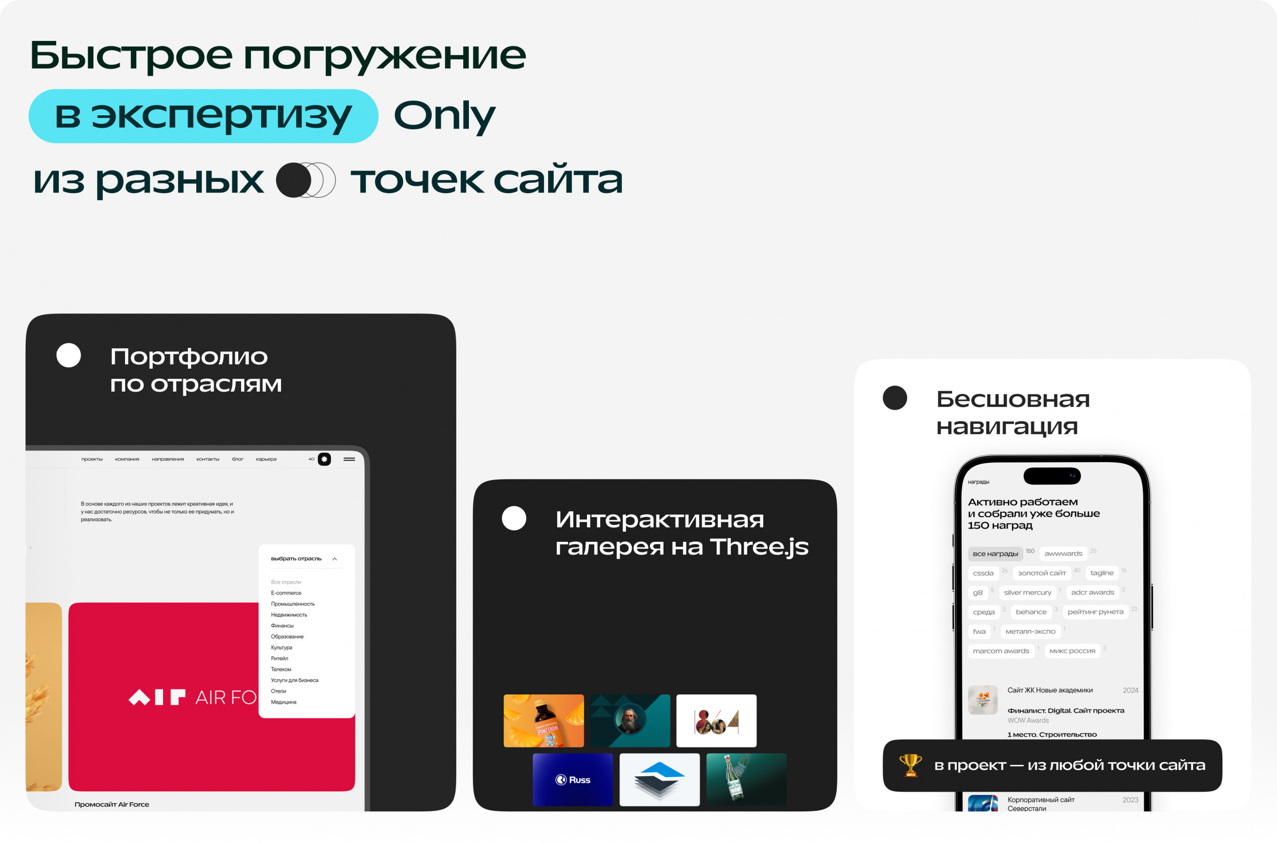 Просто обновить дизайн было недостаточно. Нам нужен инструмент, который будет поддерживать весь процесс принятия решений — от первого знакомства с агентством до отправки заявки. Новый сайт должен был не только продавать, но и вдохновлять, привлекать талантливых специалистов и визуально отражать философию компании.