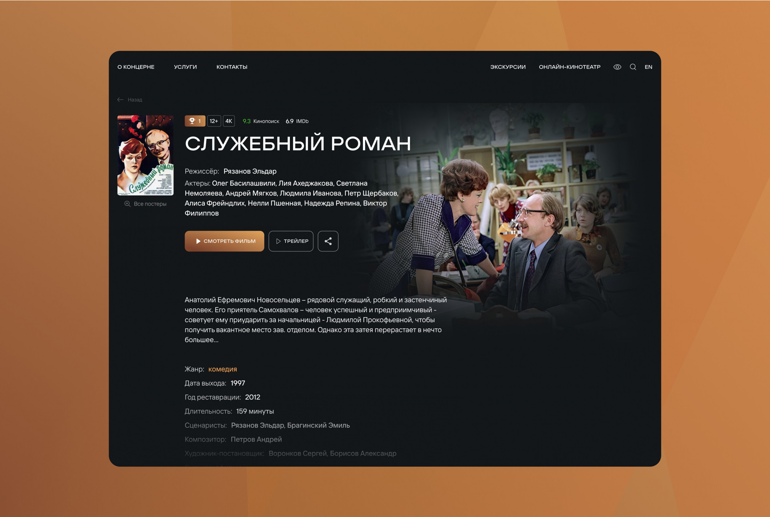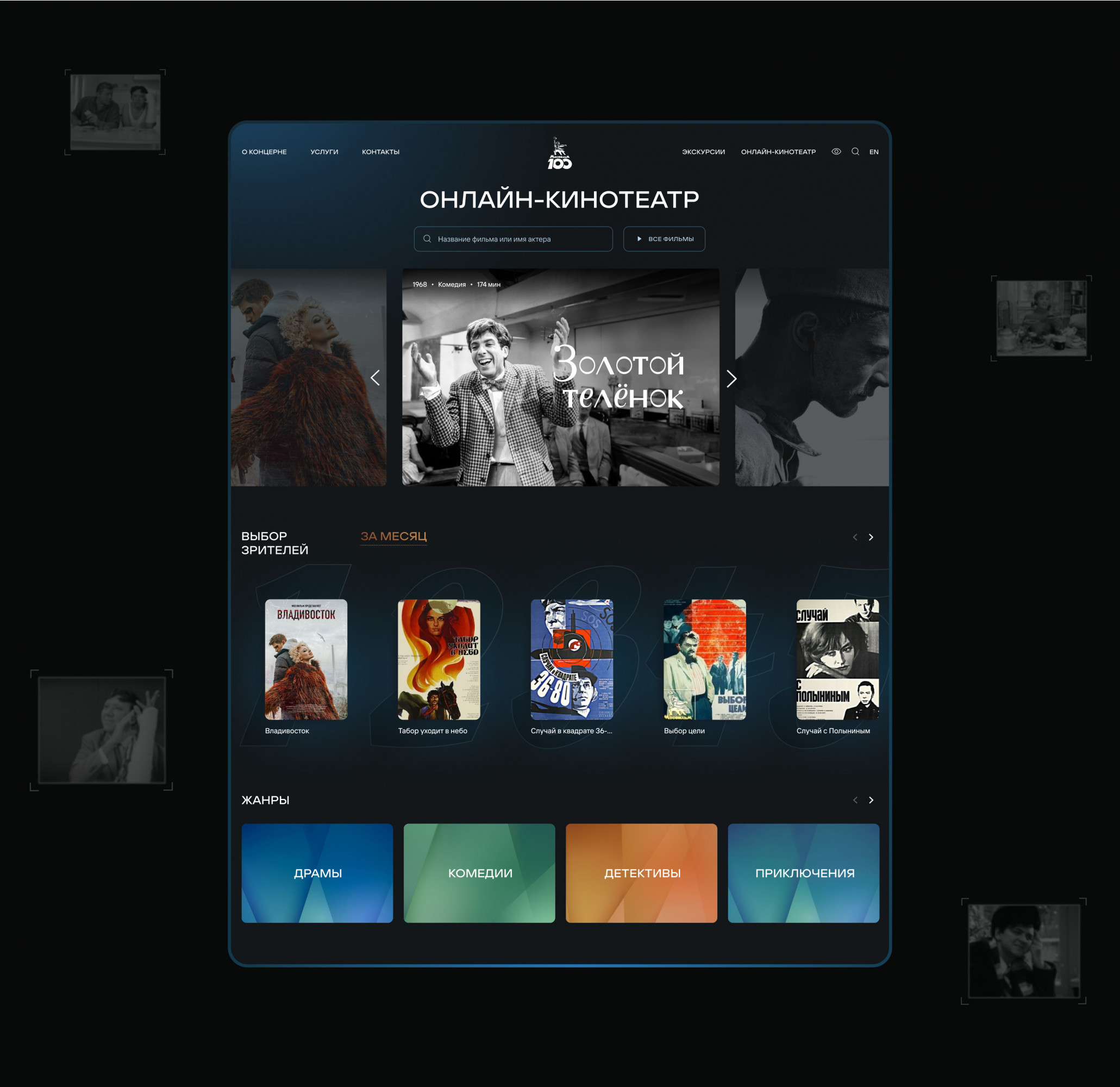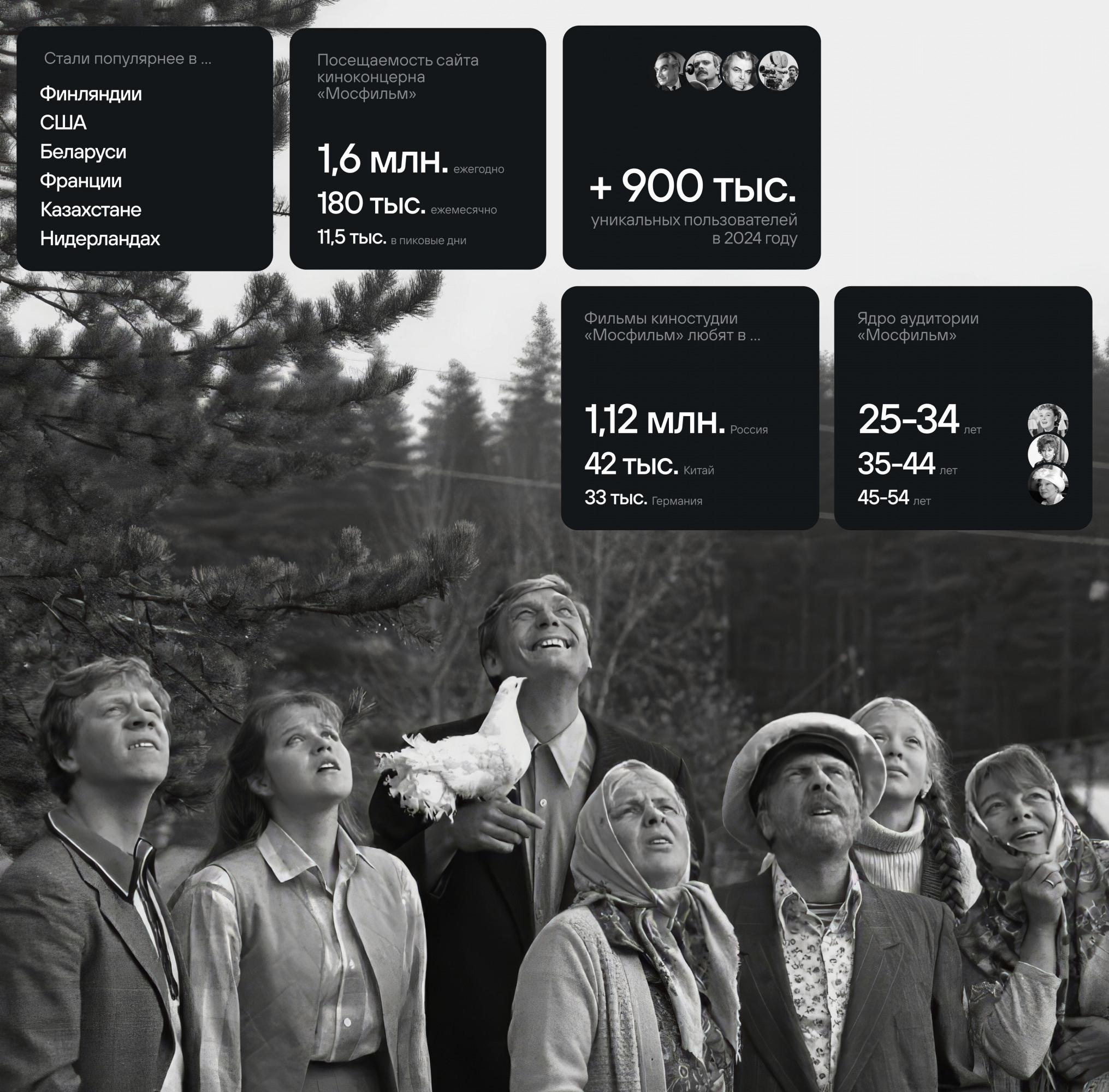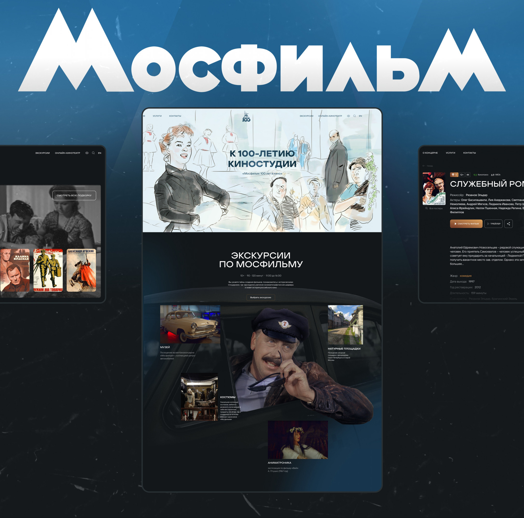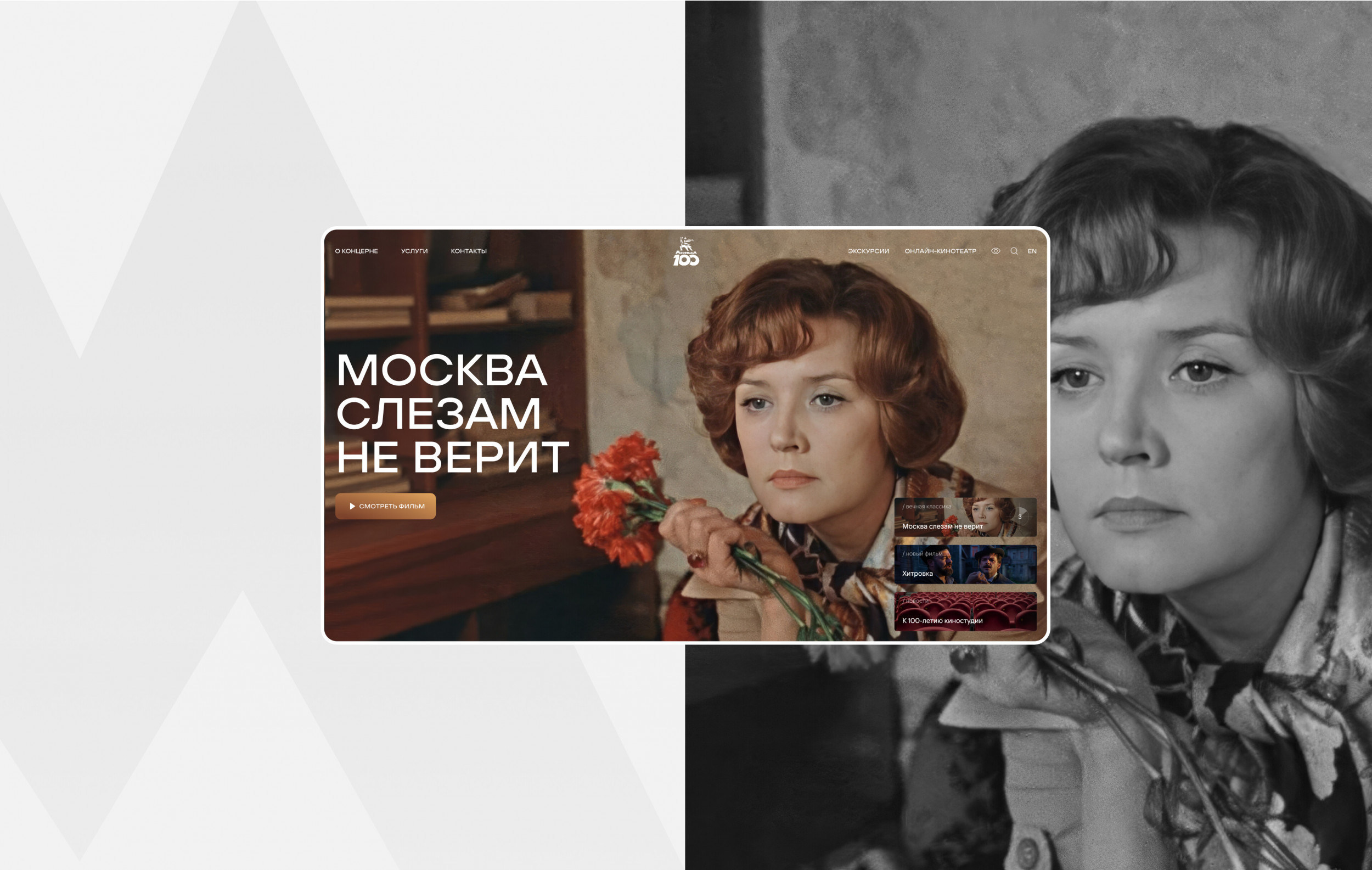 Сайт был запущен к 100-летнему юбилею. Это не просто новый ресурс, а цифровое воплощение «Мосфильма»: его масштаба и радости, которые он дарит зрителям на протяжении целого столетия. Мы стремились передать дух «Мосфильма» — студии, на которой создавалась история отечественного кино. Единственным строго заданным элементом брендбука был логотип, все остальное предстояло придумать. Мы погрузились в архивы: изучили старые афиши, культовые кадры, фотографии павильонов, чтобы прочувствовать то самое наследие, которое мы все знаем, любим и ценим. Сайт стал воплощением гармоничного соединения традиций и современных трендов. Мы разработали интерфейс, который соответствует актуальным стандартам, но при этом сохраняет уникальную самобытность киностудии. Главная идея — подчеркнуть, что «Мосфильм» был и остается одним из ведущих игроков в мире отечественного кинематографа. Ключевой идеей новой айдентики стало использование света, который занимает центральное место как в кино, так и в визуальной идентичности студии. Цвета, паттерны, градиенты и анимации софитов отсылают к свету съемочных прожекторов и культовым кинозаставкам. На страницах фильмов анимации карточек при наведении создают эффект освещения, что дополнительно подчеркивает атмосферу кинопроизводства. Обложки фильмов оформлены с использованием цветовых решений афиш, а при их отсутствии используются заглавные буквы из названия фильма. Это решение сохраняет эстетичность и делает каждую обложку визуально цельной. Особое внимание мы уделили наследию киностудии. Иллюстрации с культовыми кадрами и цитатами из фильмов напоминают о легендарных моментах отечественного кино. Блок титров подитоживает главную страницу, давая отсылку к достижениям великих режиссеров, таких как Сергей Эйзенштейн и Андрей Тарковский, как часть достижений Мосфильма. Интерактивность и киноэстетика стали ключевыми аспектами проекта. Экран с обратным отсчетом при загрузке страниц создает атмосферу ожидания начала фильма. Для B2B-клиентов разработали 2D-карту съемочных площадок Центрального производственного управления с указанием точных размеров, что упрощает поиск локаций в ходе съемок и их планировании. Раздел с экскурсиями дополнен фотографиями. Новая айдентика формирует эмоциональную связь с аудиторией, отражая историческую значимость киностудии и внося её в современную digital-среду. Широкая сетка, крупные заголовки, удобная навигация — всё это работает на ощущение легкости. Сайт стал не просто проектом, а цифровым воплощением культурного кода страны, соединяющим прошлое и настоящее. При создании самого посещаемого раздела мы проанализировали лучшие мировые платформы (Apple TV, Amazon Prime Video, Universal Studio, Lionsgate, Okko, Kion, Kinopoisk, Ivi, Wink и т. д.). Сохранили привычные элементы интерфейса: анонсы премьер и популярных фильмов, строку поиска, баннеры с лаконичной информацией и карусель тематических подборок. Контент стуктурировали по жанрам и коллекциям. Особое место занимает блок «Фильмы после реставрации». Настоящая «лепота»: здесь киношедевры обретают вторую жизнь, а зрители получают возможность насладиться восстановленным качеством легендарных картин. «Я требую продолжения банкета!» или настоящая кладезь фильмов для киноманов. Чтобы объединить богатейшее наследие «Мосфильма», мы создали систему
