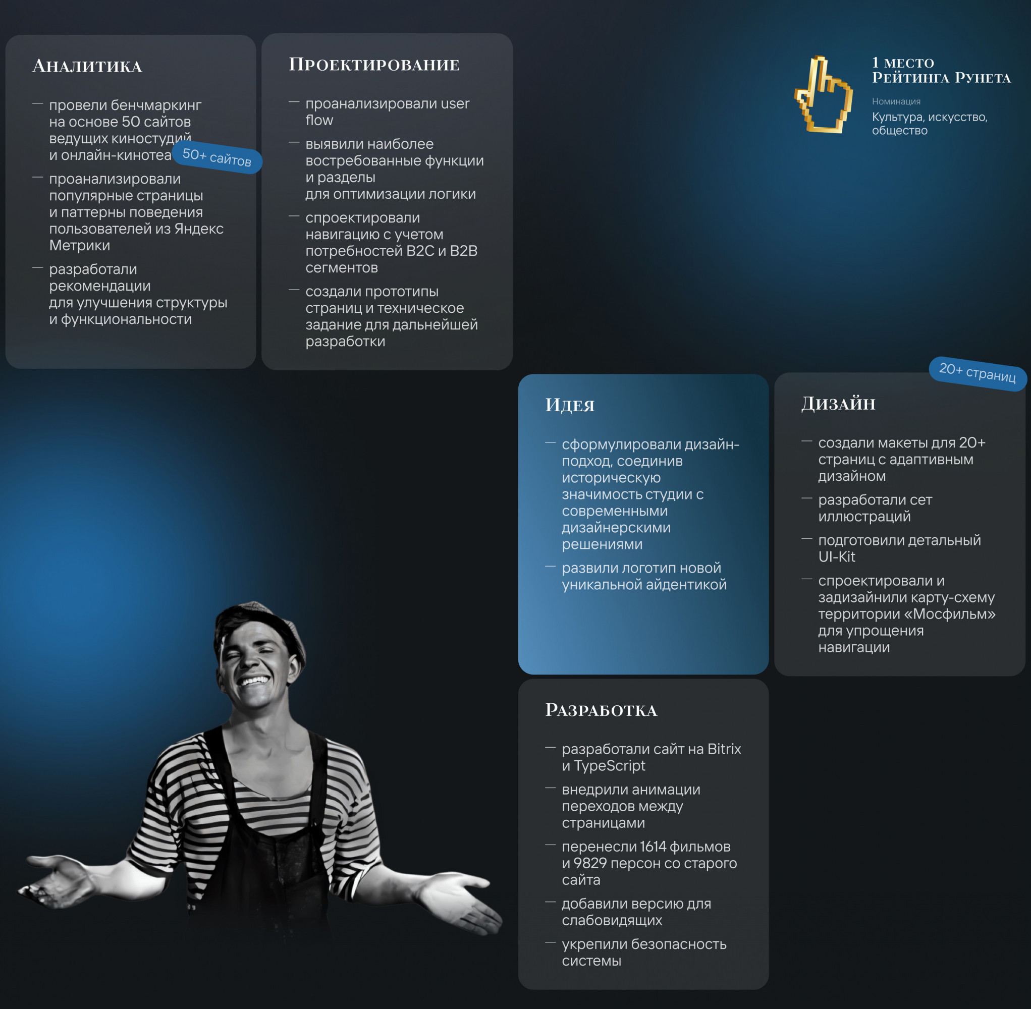 Мы переработали структуру сайта и упростили навигацию: теперь все просто, логично и удобно. Независимо от того, ищете ли вы пресс-материалы, информацию о партнерстве или просто хотите узнать больше о любимом актере, сайт устроен так, чтобы всё необходимое было под рукой.