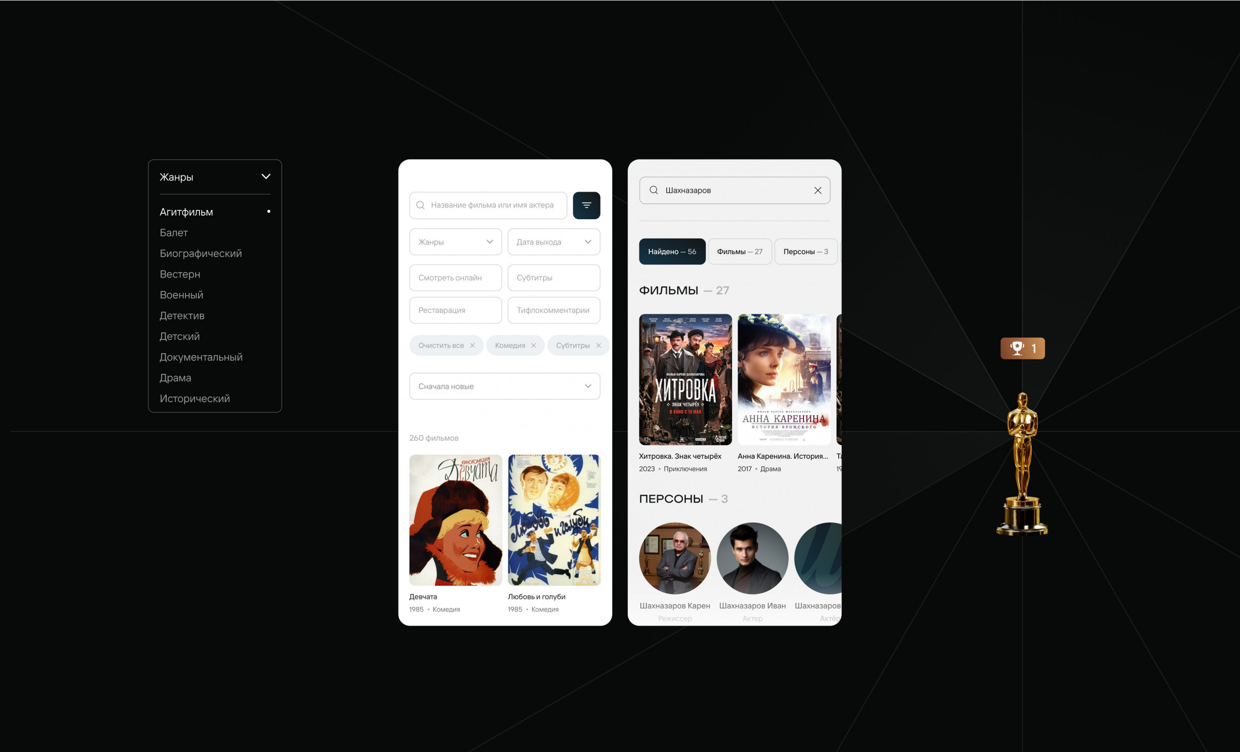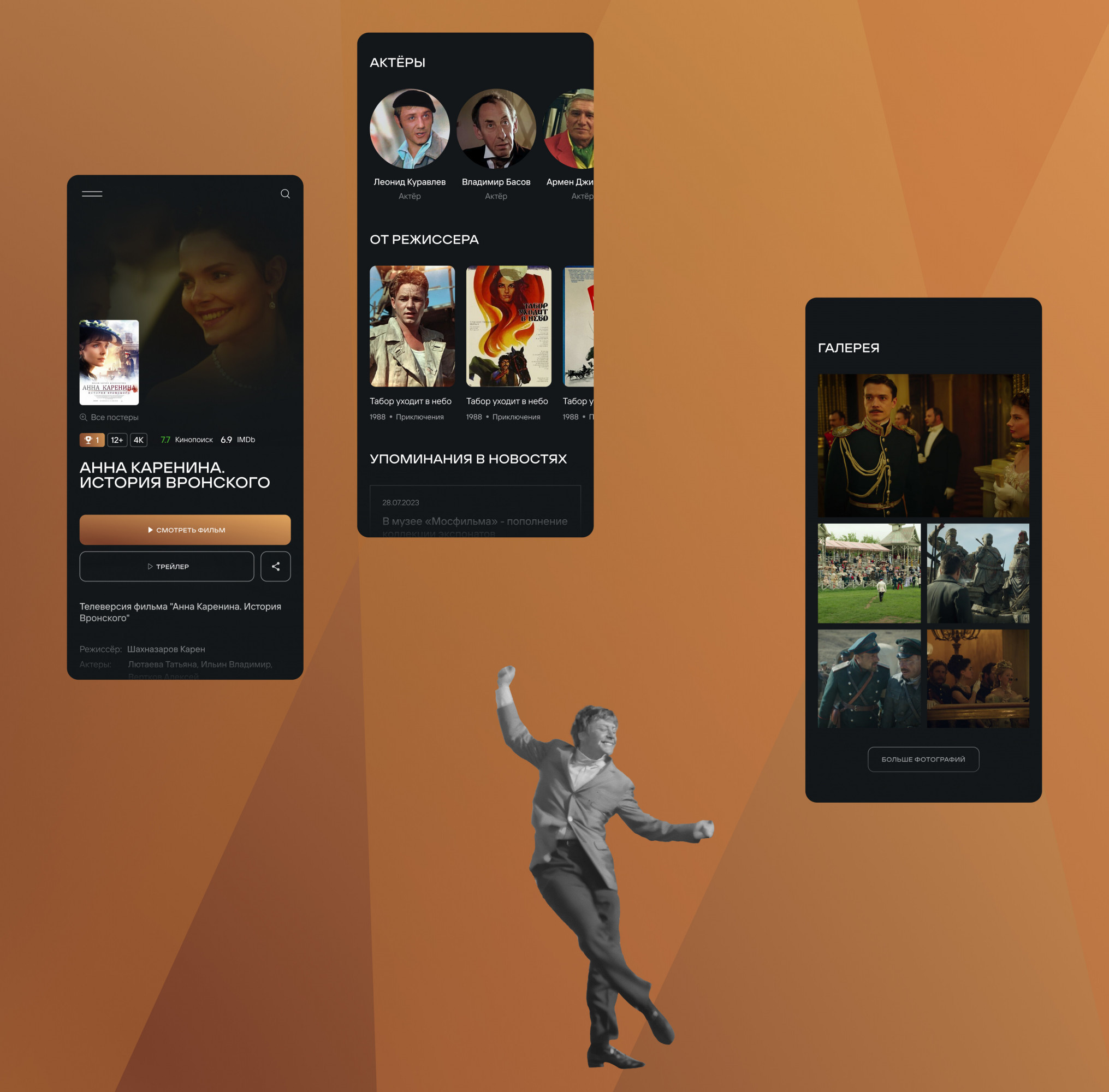 Мы создали гибкую дизайн-систему, которая объединила современные стандарты с уникальным фирменным стилем «Мосфильма». Получился баланс между современностью и тем самым образом, который невозможно спутать ни с чем другим.