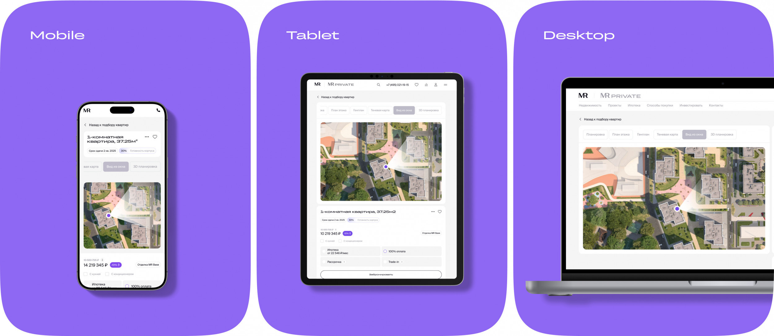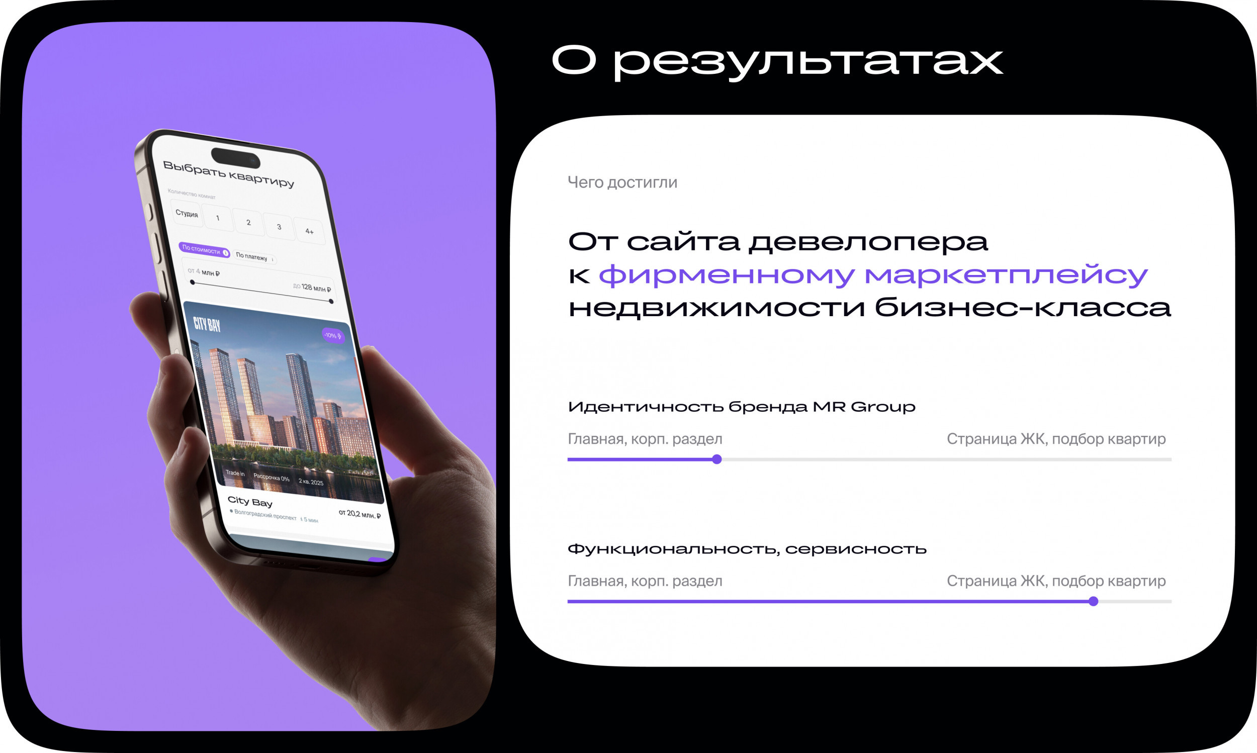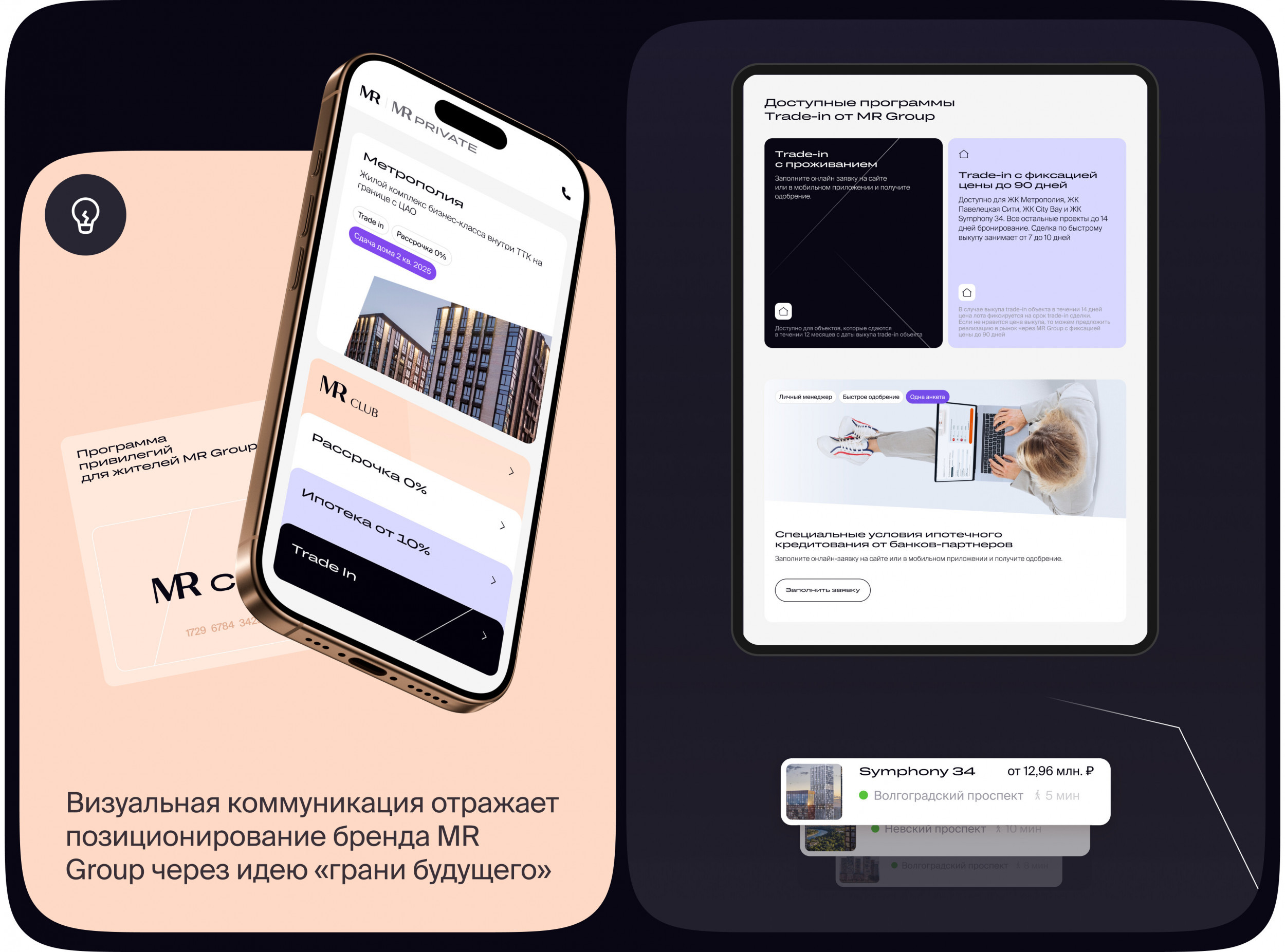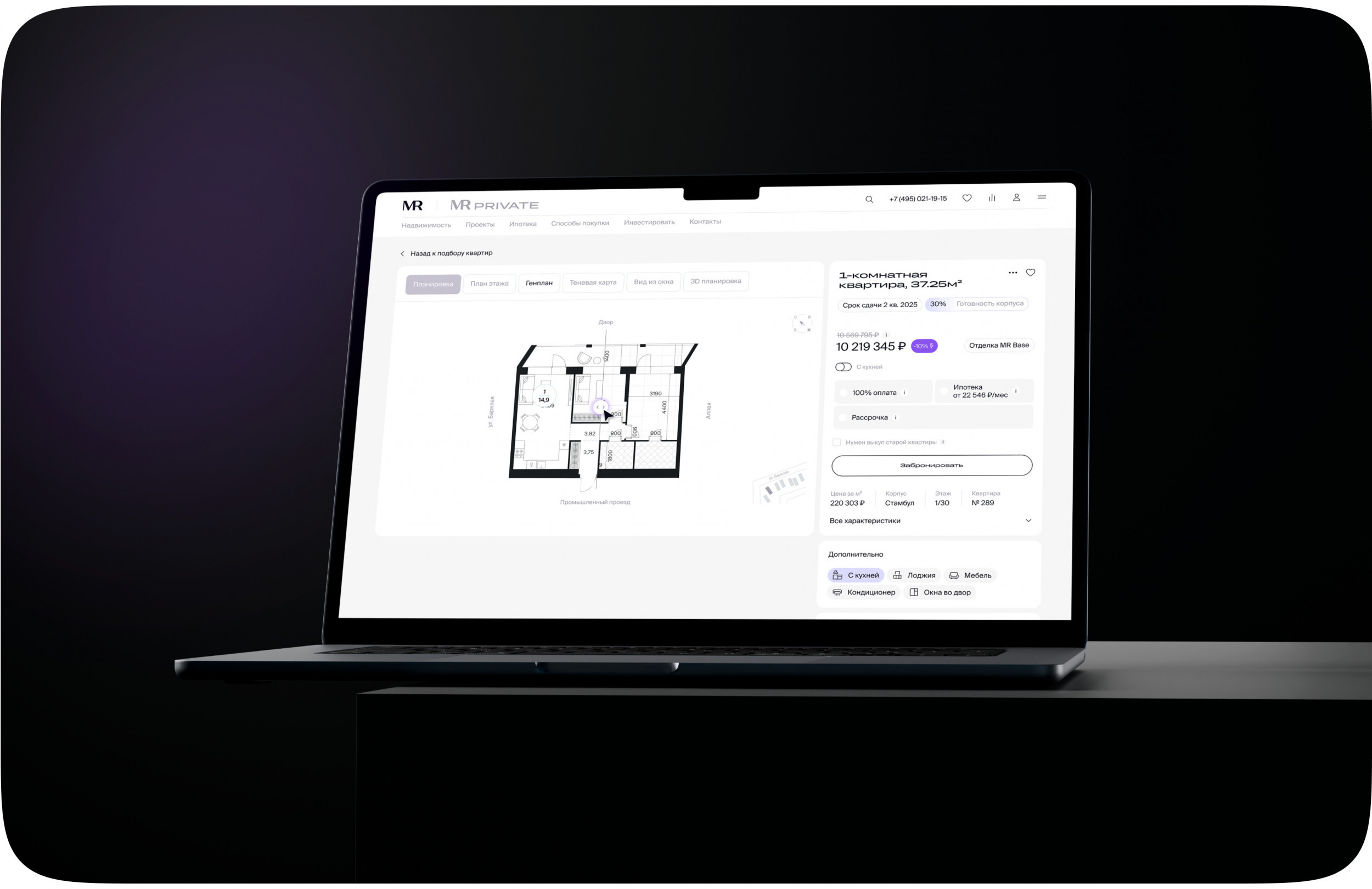 Мы начали с составления Use Cases по целевым действиям и путям. Затем подготовили интерактивные макеты в Figma для десктоп и мобильной версий, для того чтобы оценить удобство и интуитивность решений. Совместно с MR организовали персональные онлайн-встречи с респондентами и провели модерируемое тестирование на прототипах. По результат тестов был подготовлен отчет с пулом необходимых уточнений и корректировок в макеты. Карточка лота. Вариант после анализа результатов Провели тестирование на кликабельных прототипах. Проанализировали результаты и составили отчет, где отметили необходимые корректировки в макеты. При создании дизайна сайта мы опирались на обновленный брендбук компании. Визуальная коммуникация отражает позиционирование бренда MR через идею «грани будущего». Сайт преподносит MR как визионера, который смотрит за грань будущего. При этом нам удалось найти баланс между эмоциональным и рациональным в дизайне в зависимости от назначения страницы. Акцент на идентичности с основой в качественном взаимодействии Мы провели «цифровизацию» айдентики, учитывая особенности диджитал-пространства, и поддержали ее реализованным UI-дизайном. Работу с интерфейсом облегчили с помощью визуальных акцентов и микровзаимодействий, направляющих пользователя к целевым действиям. Тщательно проработали UI-kit, в результате чего получился гибкий и масштабируемый продукт. UX-дизайн одновременно дает и необходимые инструменты для дальнейшего поиска квартиры, и формирует представление о застройщике. Особое внимание уделили проработке навигационных и сложных функциональных элементов, расставляя необходимые интерфейсные акценты. Нам удалось создать полноценный digital-продукт, который одновременно решает задачи бизнеса и помогает пользователю в принятии решения о покупке квартиры. Сайт предусматривает масштабирование и гибок на изменения при корректировке стратегии. Мы подготовили макеты и UI-kit для поэтапного запуска и развития продукта. После окончания основных работ по корпоративному сайту, мы продолжили сотрудничество с MR. Спроектировали и задизайнили макеты для следующих сервисов: — Оценить квартиру; — Рассрочка; — Подбор объектов недвижимости по параметрам; — Доплата за метры; — Настройки профиля; и прочие. Нам удалось создать полноценный digital-продукт, который одновременно решает задачи бизнеса и помогает пользователю в принятии решения о покупке квартиры. Еще больше идей, кейсов и новостей от Only — на сайте, в Dprofile и Telegram