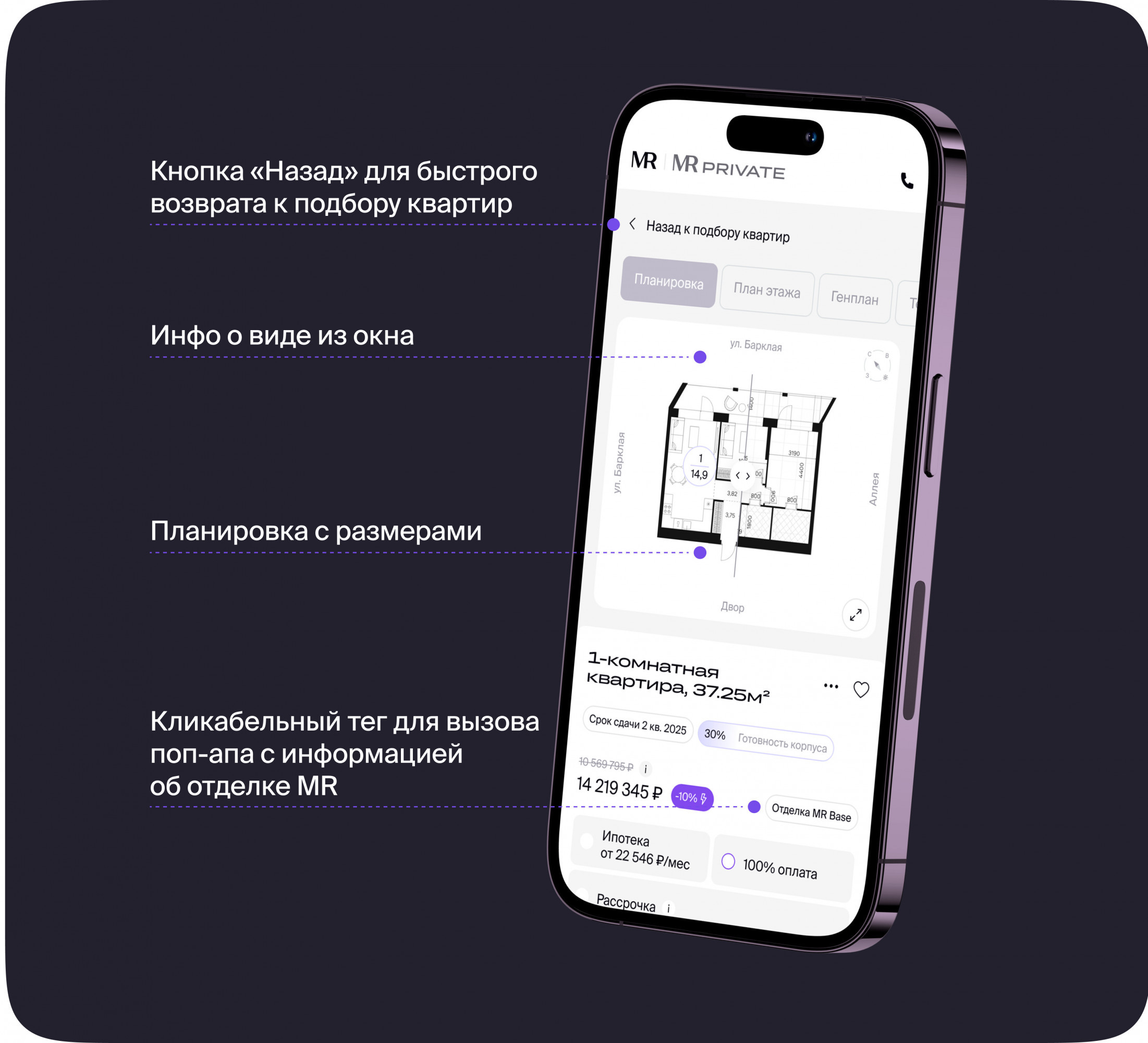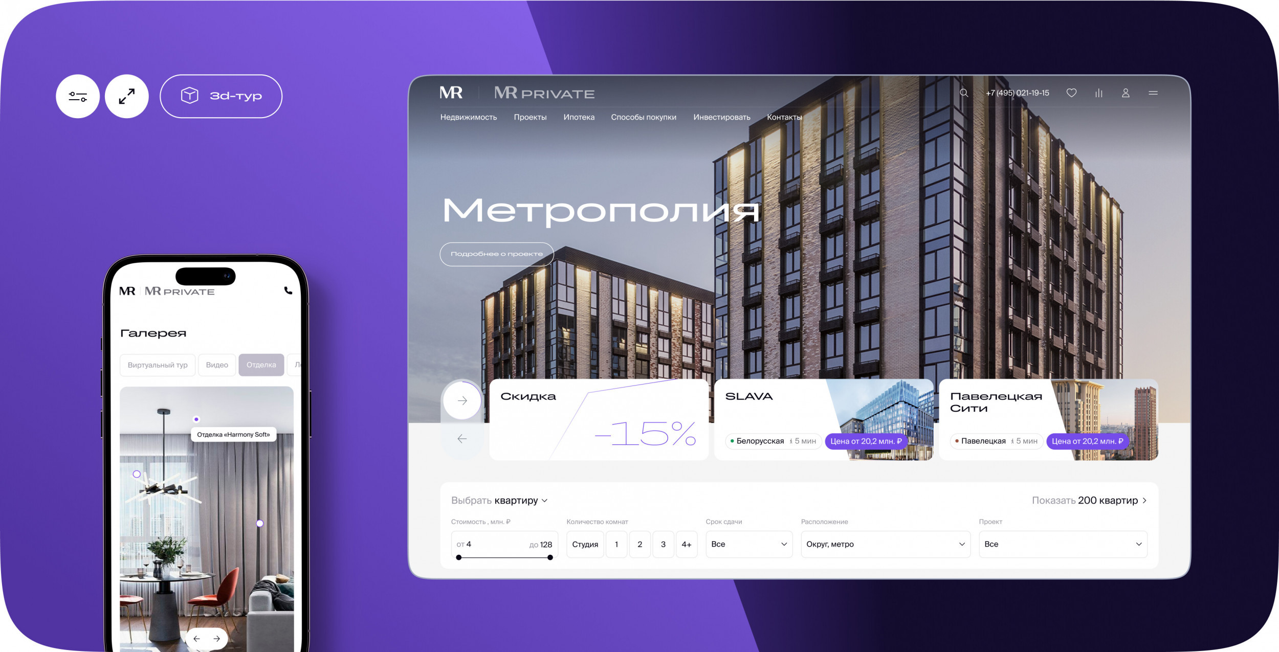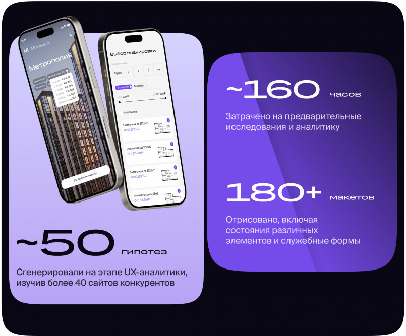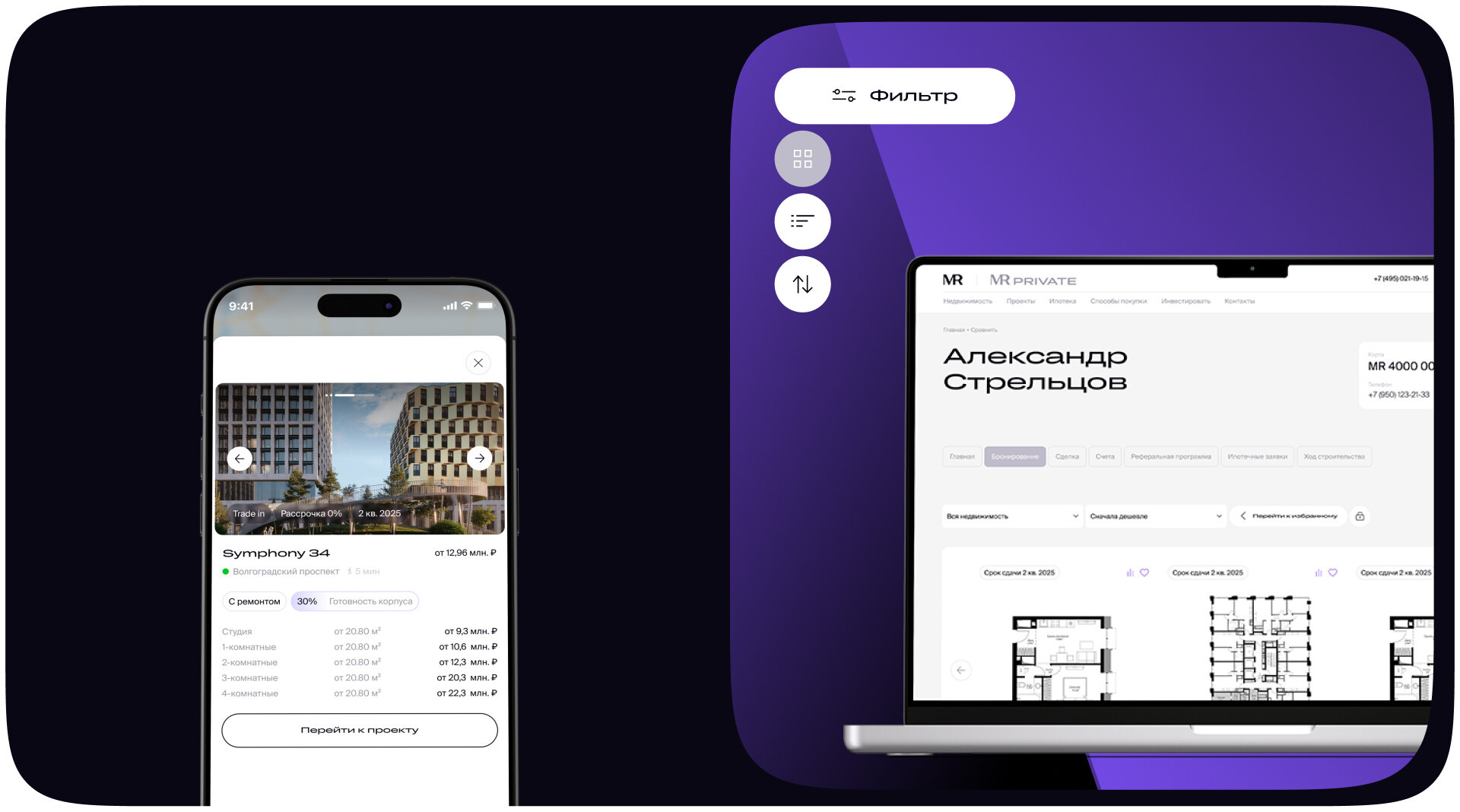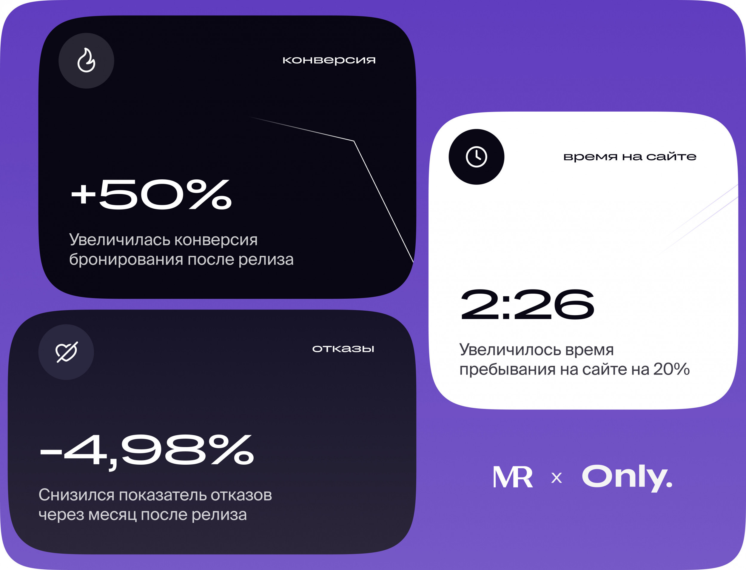 Мы начали с составления Use Cases по целевым действиям и путям. Затем подготовили интерактивные макеты в Figma для десктоп и мобильной версий, для того чтобы оценить удобство и интуитивность решений. Совместно с MR организовали персональные онлайн-встречи с респондентами и провели модерируемое тестирование на прототипах. По результат тестов был подготовлен отчет с пулом необходимых уточнений и корректировок в макеты. Карточка лота. Вариант после анализа результатов Провели тестирование на кликабельных прототипах. Проанализировали результаты и составили отчет, где отметили необходимые корректировки в макеты. При создании дизайна сайта мы опирались на обновленный брендбук компании. Визуальная коммуникация отражает позиционирование бренда MR через идею «грани будущего». Сайт преподносит MR как визионера, который смотрит за грань будущего. При этом нам удалось найти баланс между эмоциональным и рациональным в дизайне в зависимости от назначения страницы. Акцент на идентичности с основой в качественном взаимодействии Мы провели «цифровизацию» айдентики, учитывая особенности диджитал-пространства, и поддержали ее реализованным UI-дизайном. Работу с интерфейсом облегчили с помощью визуальных акцентов и микровзаимодействий, направляющих пользователя к целевым действиям. Тщательно проработали UI-kit, в результате чего получился гибкий и масштабируемый продукт. UX-дизайн одновременно дает и необходимые инструменты для дальнейшего поиска квартиры, и формирует представление о застройщике. Особое внимание уделили проработке навигационных и сложных функциональных элементов, расставляя необходимые интерфейсные акценты. Нам удалось создать полноценный digital-продукт, который одновременно решает задачи бизнеса и помогает пользователю в принятии решения о покупке квартиры. Сайт предусматривает масштабирование и гибок на изменения при корректировке стратегии. Мы подготовили макеты и UI-kit для поэтапного запуска и развития продукта. После окончания основных работ по корпоративному сайту, мы продолжили сотрудничество с MR. Спроектировали и задизайнили макеты для следующих сервисов: — Оценить квартиру; — Рассрочка; — Подбор объектов недвижимости по параметрам; — Доплата за метры; — Настройки профиля; и прочие. Нам удалось создать полноценный digital-продукт, который одновременно решает задачи бизнеса и помогает пользователю в принятии решения о покупке квартиры. Еще больше идей, кейсов и новостей от Only — на сайте, в Dprofile и Telegram