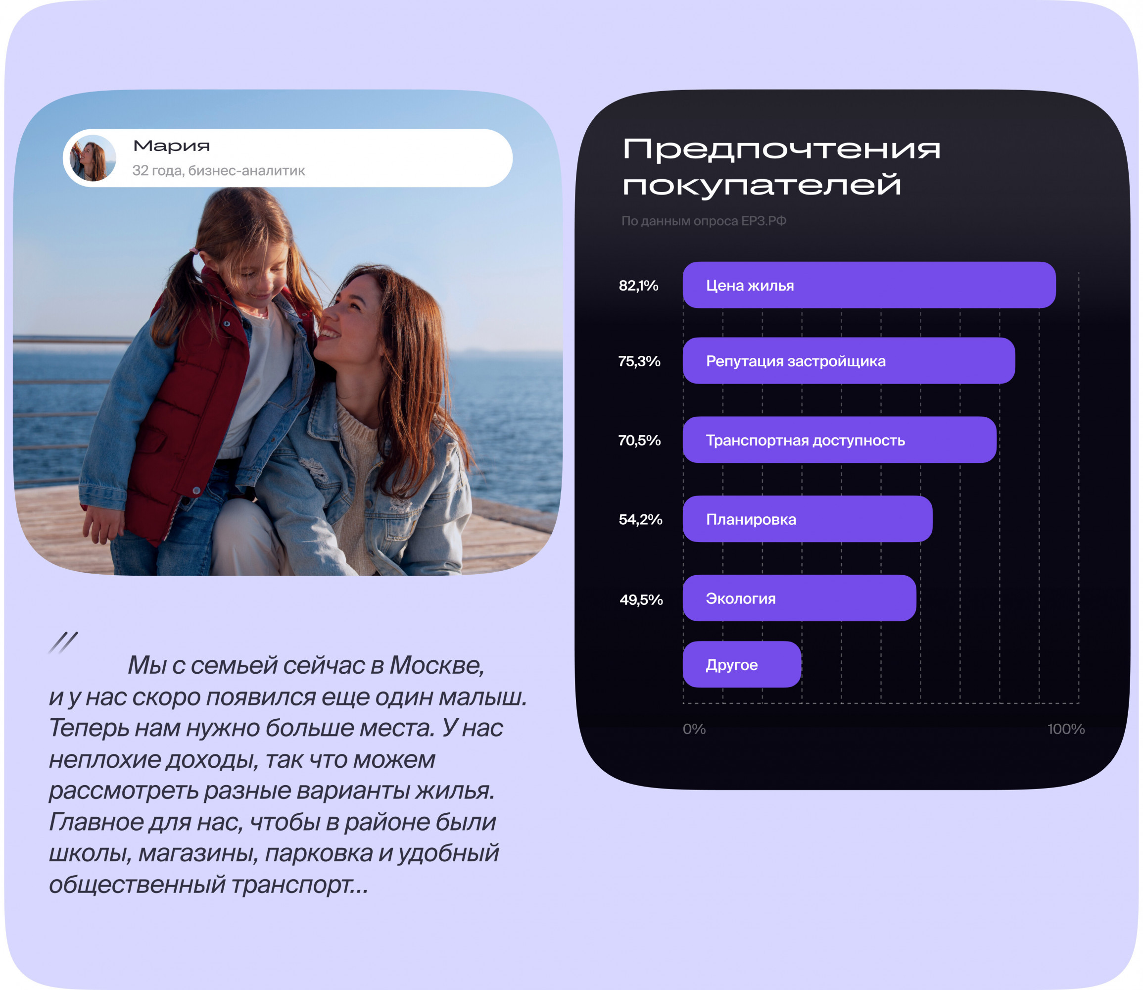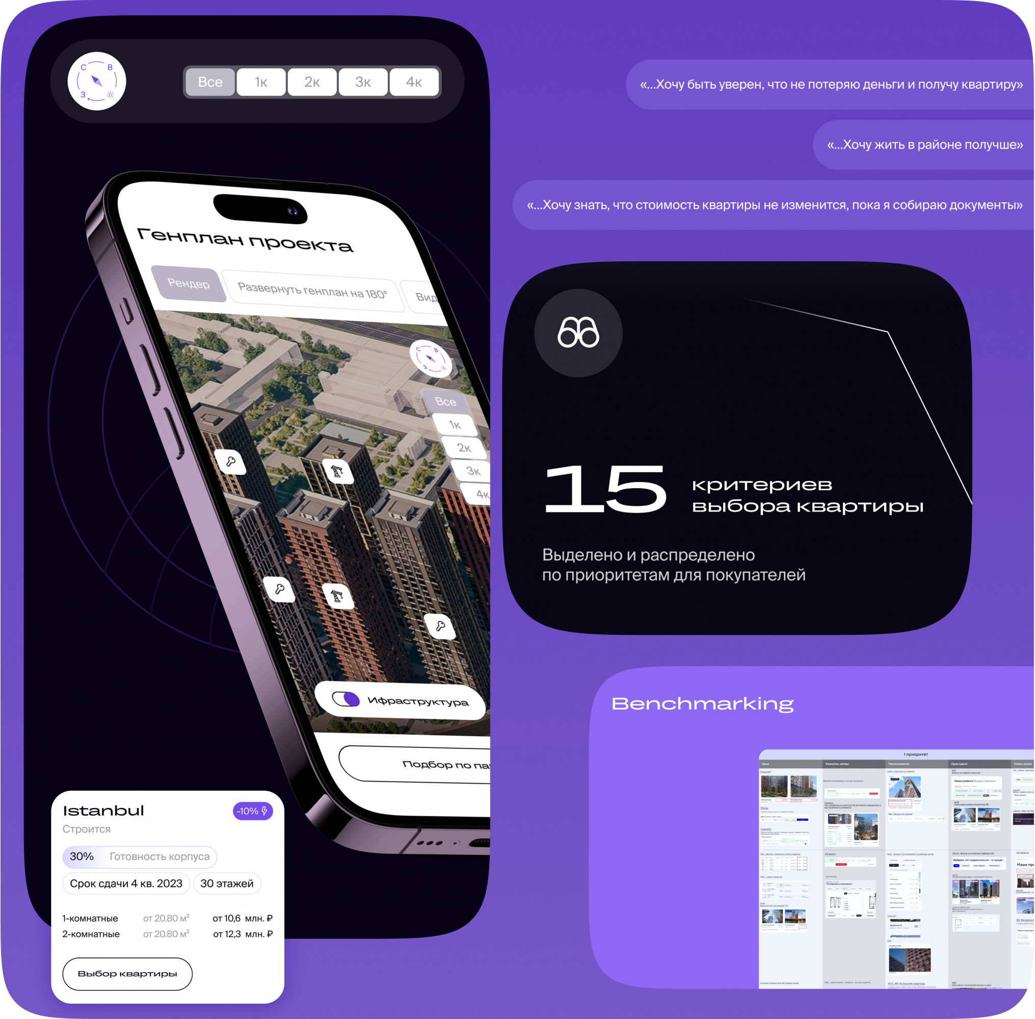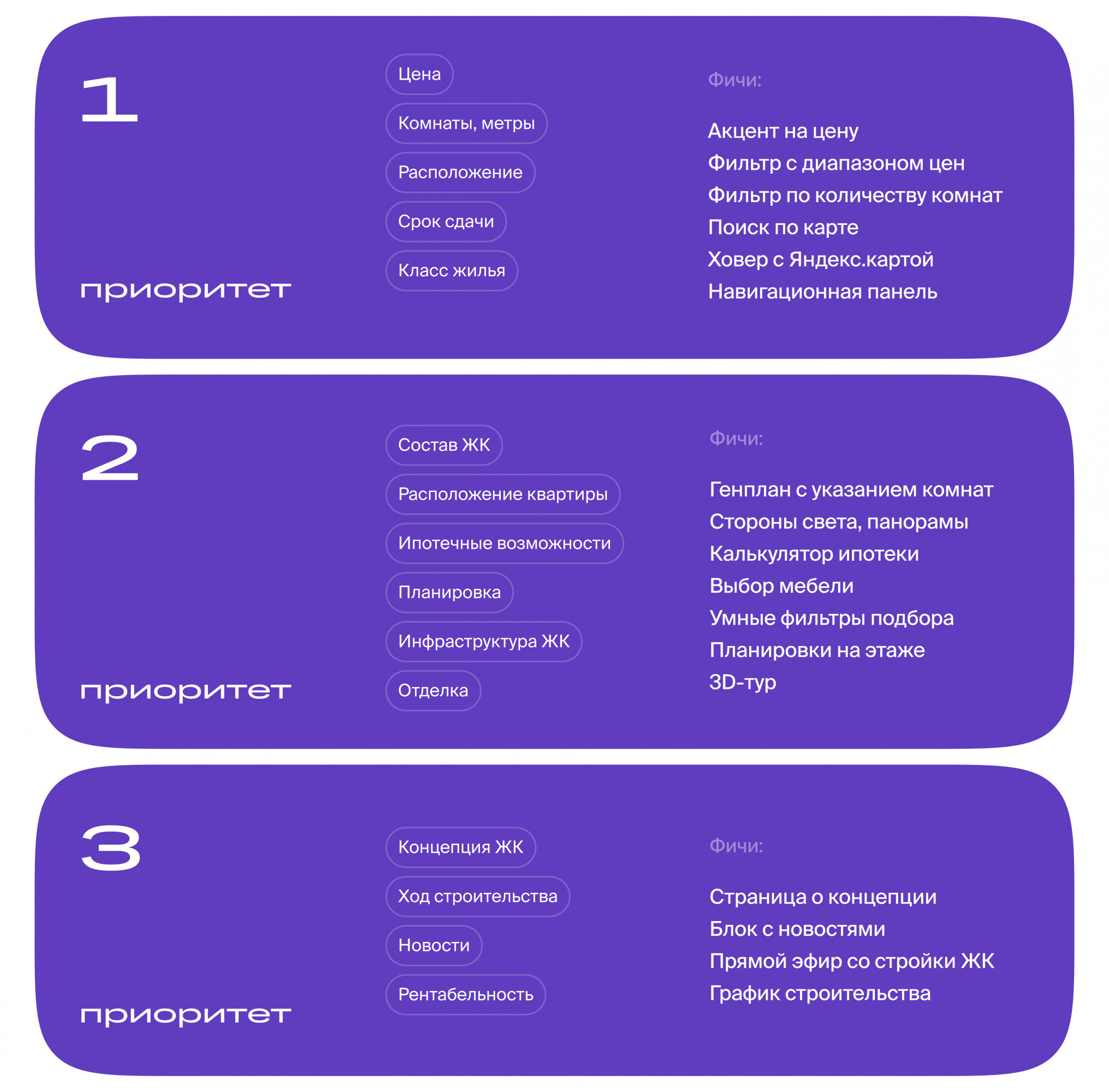 — Проанализировали 15 критериев выбора квартиры. Ядро целевой аудитории сервиса можно представить следующим образом: 1) Люди, ищущие квартиру для покупки: — для себя; — для родственников; — в качестве инвестиции (сдачи в аренду или дальнейшей продажи); 2) Люди, которые уже купили квартиру: — ждут заселения; — уже заселились и приходят на сайт за предложениями по бонусной программе; 3) Люди, которые уже покупали у MR и вернулись за новой квартирой/машиноместом/и т.д. В рамках этапа аналитики мы выработали методологию, в ходе которой проранжировали потребности пользователей по приоритетам. Для того чтобы выявить желания и боли пользователей, мы составляли портреты пользователей: моделировали и описывали конкретные ситуации. В рамках бенчмаркинга проанализировали реализацию критериев и целевых путей. А также создали базу лучших практик и удачных решений. Для каждого критерия мы составили пул фич (функциональных элементов) и информационных блоков, закрывающих тот или иной вопрос. С помощью обширного бенчмаркинга мы исследовали способы реализации выбранных критериев на различных сайтах застройщиков и ЖК. Проведенное исследование в сочетании с анализом метрик GA и ЯМ, данными сервиса UX Feedback и результатами опросов от отдела маркетинга MR помогло нам составить пул гипотез и фич, которые важно было отразить на новом сайте. Мы перешли к этапу составления структуры сайта, включая ЛК пользователя, и отрисовке прототипов страниц и меню. Параллельно проводили UX-тесты на клиентах, для того чтобы убедиться в удобстве функционала.