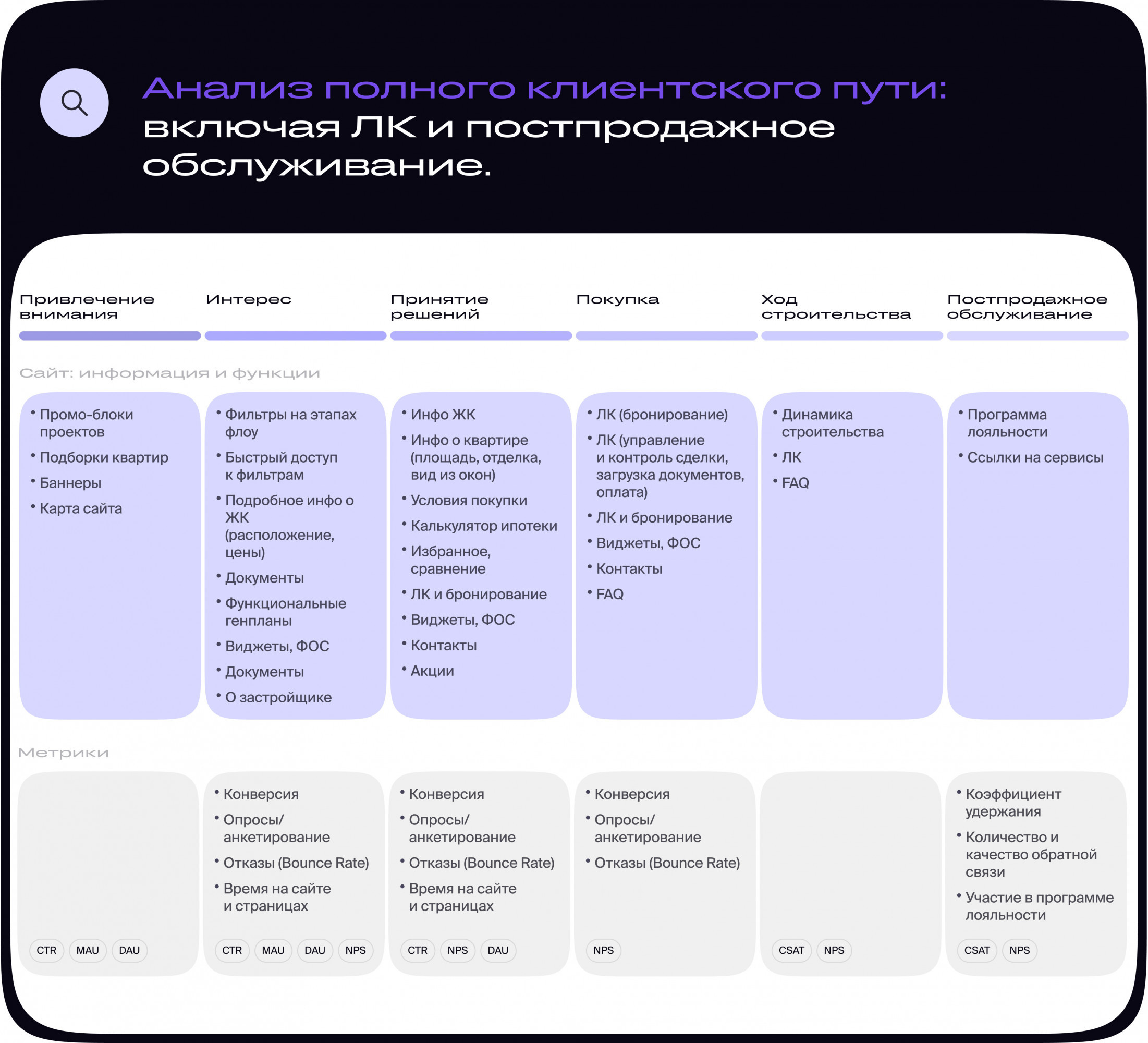 — Выделили все ключевые этапы воронки выбора, продажи и постпродажи лотов — Собрали инструменты для достижения бизнес-целей — Вынесли информацию и функциональность на сайте, необходимую пользователям и бизнесу на каждом этапе воронки — Обозначили метрики для проверки гипотез на сайте