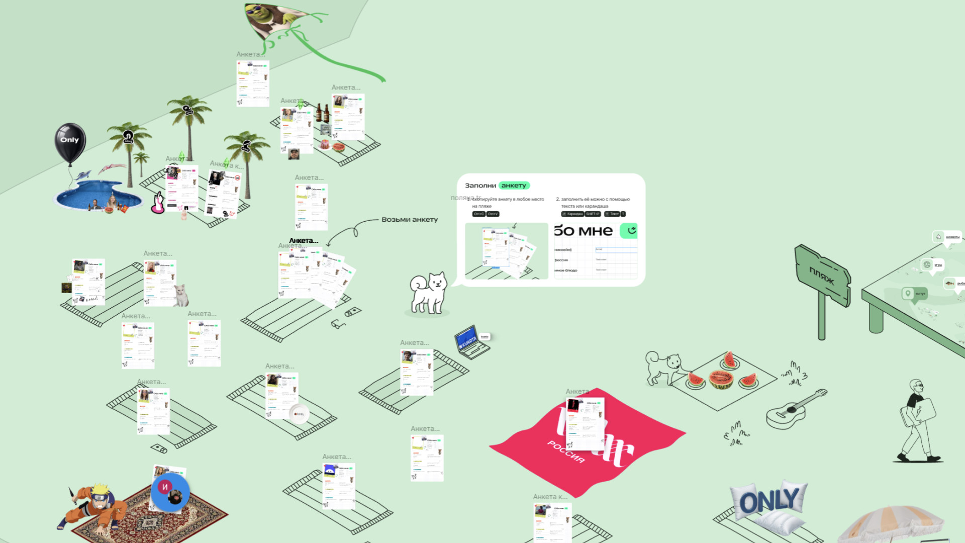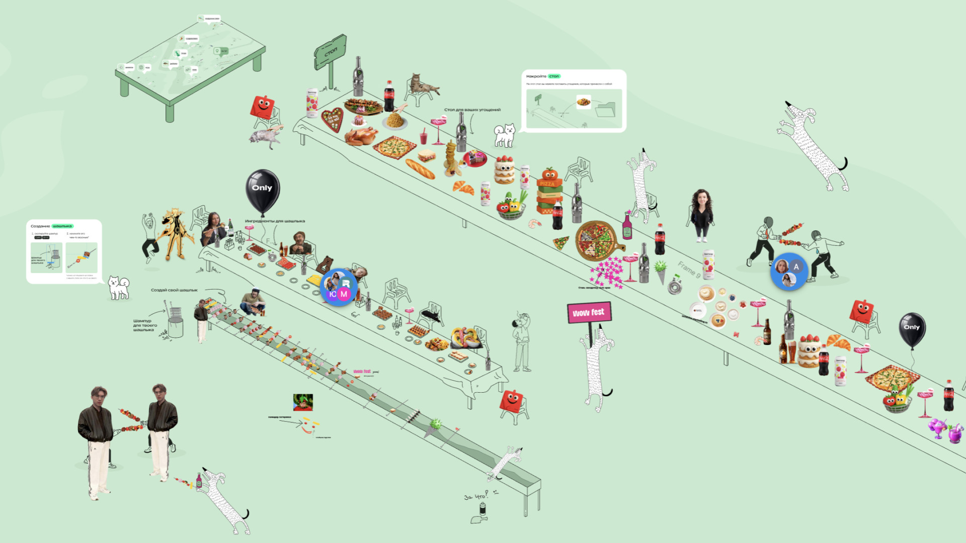 Для события команда Only подготовила специальное пространство в Figma, графическом редакторе для проектирования сайтов. В основу его дизайна легла идея пикника с шашлыками и активностями на природе, а также атмосфера наступающего лета.
