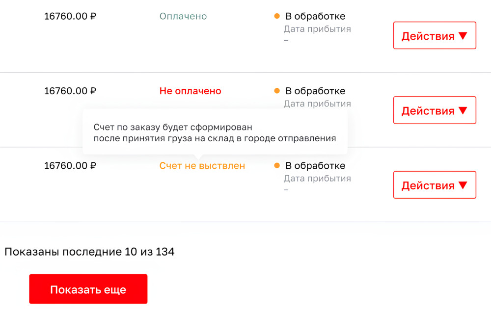 Новая функция позволяет видеть текущий статус оплаты своих заказов. Система включает три основных статуса, каждый из которых обозначен определенным цветом: зеленый для полностью оплаченных заказов, красный сигнализирует о необходимости оплаты или при поступлении частичной оплаты, а оранжевый указывает на то, что счет еще не был выставлен.