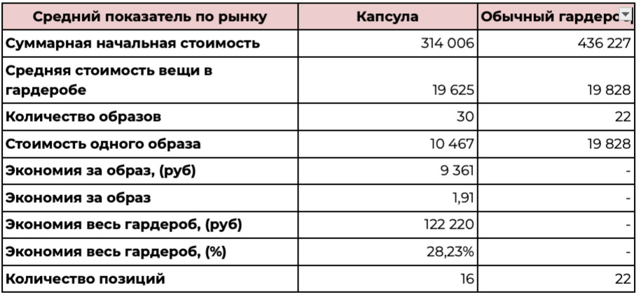 Капсула позволяет женщинам сократить расходы на одежду на 28% — до 122 тыс. рублей в год. Так, например, средняя стоимость одного образа составляет 10 тыс. рублей, что почти в 2 раза дешевле по сравнению с базовым гардеробом, включающем в себя трендовую сезонную одежду.
