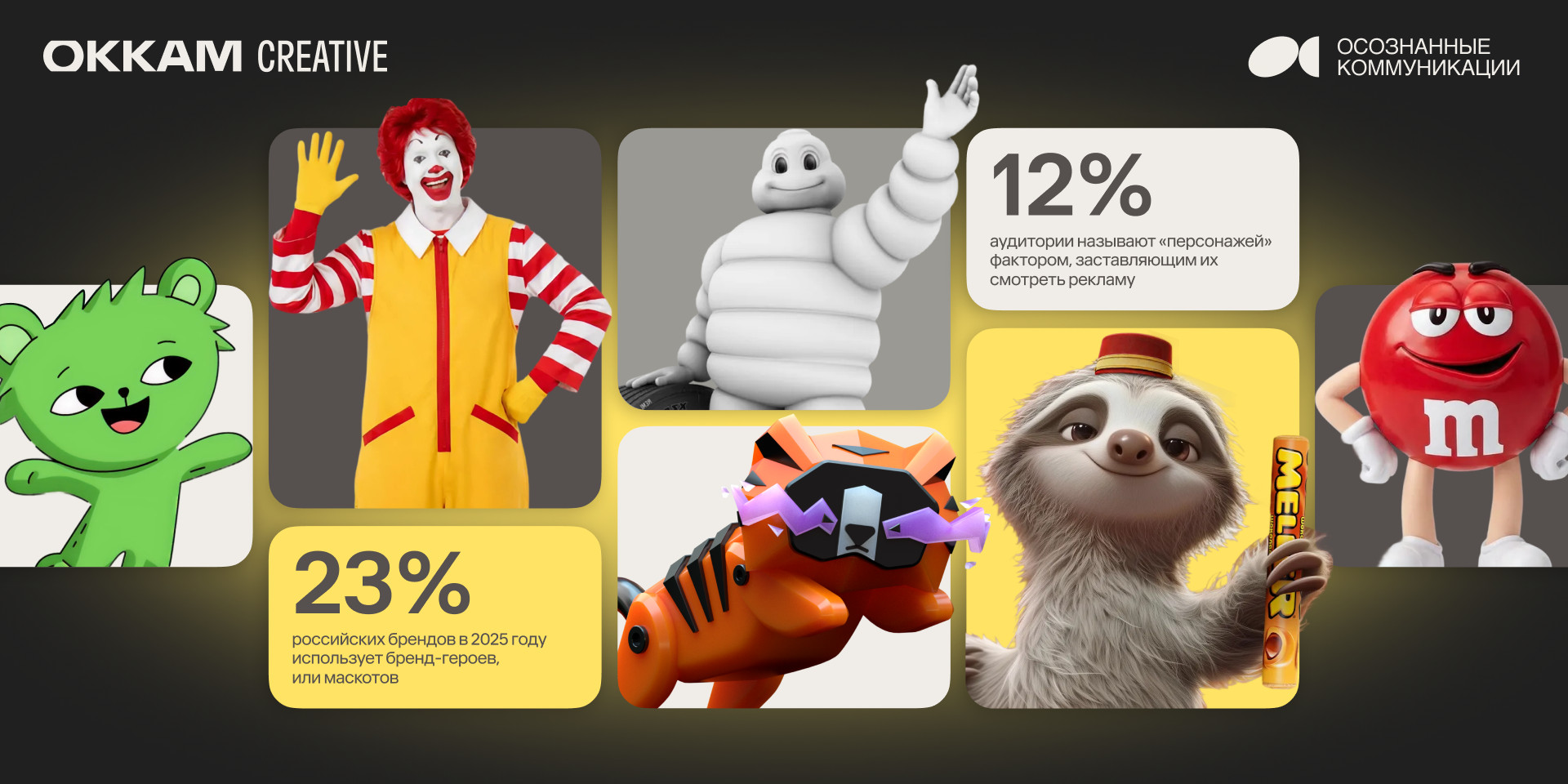 Сегодня персонажи остаются одним из самых популярных способов привлечь внимание к бренду. В Okkam Creative провели более 10 волн исследований ТВ- и OLV-рекламы и опросили свыше 5000 респондентов. В рамках этих исследований аналитики агентства выделили так называемые «триггеры внимания» — элементы, которые статистически повышают эффективность креатива. «Знаменитости и персонажи» вошли в топ-5 факторов, которые влияют на эффективность рекламы: они важны для 12% респондентов. Однако если про роль селебрити в креативах говорят довольно активно, то влияние вымышленных персонажей в России пока изучено слабо. Между тем в России каждый четвертый крупный бренд уже использует маскотов — 23% в 2025 году. Такой результат показало еще одно внутреннее исследование Okkam Creative. Анализировали топ-100 брендов по медиаинвестициям в России: их рекламу, сайты и соцсети. Применение маскотов на российском рынке очень широкое: от оживших упаковок до полноценных анимированных персонажей в digital-коммуникациях. Создают эмоциональную связь, повышают узнаваемость бренда (об этом писал The Branding Journal). Культовые примеры — Рональд Макдональд, M&M’s персонажи (Red и Yellow) или кролик Nesquik. Повышают запоминаемость рекламы. Это следует из результатов исследования EMAC Proceeding: мозговая активность потребителей показывает, что они узнают анимированных персонажей бренда, при этом есть разница в реакции потребителей на релевантных бренду и нерелевантных анимационных персонажей. Маскот помогает лучше транслировать миссию и ценности бренда и, как следствие, «очеловечивает» бренд. Это говорится в исследовании ResearchGate: человекоподобные вымышленные персонажи позволяют потребителю соотнести себя с компанией («бренд для таких, как я») и позитивно влияют на намерение совершить покупку (это данные опросов, проведенных в Турции). Маскоты влияют на продажи и долю рынка. Как выяснили в The Moving Picture Company (MPC), долгосрочная кампания с использованием персонажей в среднем увеличит прирост доли рынка на 41% ( vs 29,7% — без маскотов). Аналогично долгосрочные кампании с поддержкой персонажей увеличивают прирост прибыли на 34,1% (vs 26,2% у кампаний без маскотов). Персонажи усиливают узнаваемость при длительном использовании: долгосрочные кампании с маскотами опережают другие по росту доли рынка на 37%, также подсчитали в DigitalHumans. Эксперты Okkam Creative сформулировали критерии, опираясь на которые можно грамотно встроить маскота в стратегию бренда и при этом не навредить ему. Правило 1: Маскот должен соответствовать ДНК бренда и контексту «Маскот — это точно такой же бренд-ассет, как логотип, слоган или фирменный звук. И как слоган решает коммуникационную задачу бренда или иллюстрирует миссию, точно так же это должен делать и персонаж, — говорит Андрей Стифеев, креативный директор Okkam Creative. — Таким образом, мало просто сгенерировать милого персонажа с помощью нейросетей, даже если вы уверены, что он понравится вашей семье и вашей аудитории. Маскот — инструмент, который решает конкретную задачу, и подход к проектированию такого инструмента должен быть максимально осознанным». По словам Андрея Стифеева, в процессе создания маскота важно ответить на вопросы: Например, тигр Яков — талисман агентства Traffic by Okkam, символ креативной смелости и внутренней энергии. Яков визуализирует принципы компании, среди которых упор на эффе