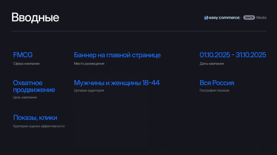 Крупный FMCG-производитель провел масштабную охватную кампанию в октябре 2025 года. Ее цель — увеличить узнаваемость и привлечь качественный трафик на свой сайт через размещение в слайдере Wildberries. Эксперты Easy Commerce, технологического партнера Okkam, реализовали проект и параллельно запустили аналогичную кампанию на другой площадке для сравнения.