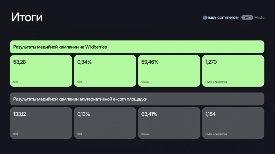 Нашей целью было не просто достижение высоких метрик, а создание убедительного кейса, который доказывает эффективность. Запустив идентичную кампанию параллельно на двух площадках, мы получили чистые данные для сравнения — Wildberries превзошел альтернативу по всем параметрам. Теперь у нашего клиента есть не только трафик, но и алгоритм для распределения будущих бюджетов.