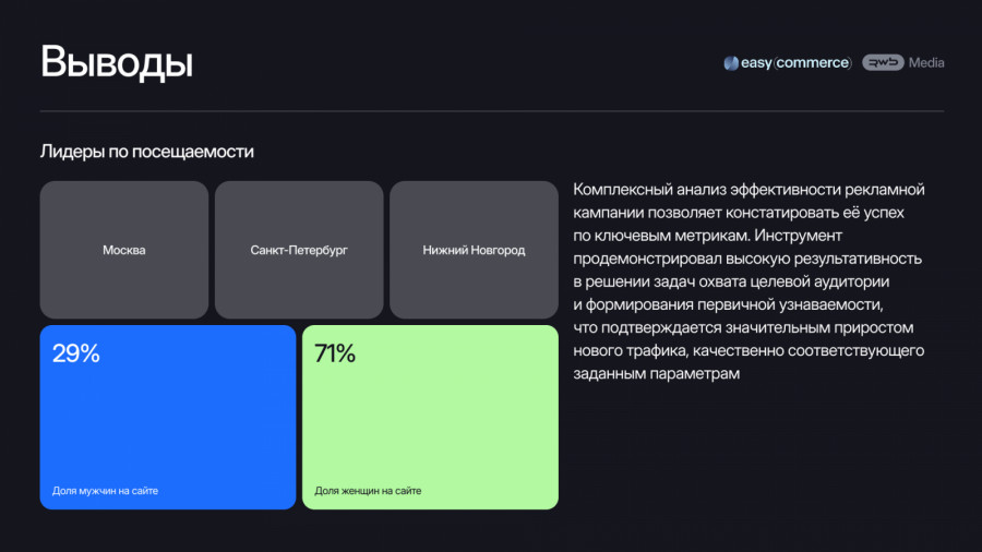 Стояла задача массового охвата аудитории. Бренду было необходимо не только достичь максимального количества показов, но и убедиться, что кампания генерирует реальный интерес — переходы на сайт релевантной целевой аудитории. Дополнительной целью было получить объективные данные для оценки Wildberries как медийной площадки в сравнении с другими e-com платформами, чтобы в будущем обоснованно распределять рекламные бюджеты. Для достижения максимального охвата эксперты Easy Commerce предложили выбрать формат статичного баннера на одном из самых заметных мест — в слайдере на главной странице Wildberries. Кампания проходила в период с 1 по 31 октября 2025 года. Чтобы получить чистые данные для сравнения, кампания одновременно прошла на альтернативной e-com площадке. Глубокая аналитика позволила детально оценить как медийную эффективность (показы, клики, стоимость), так и посткликовое поведение пользователей на сайте бренда. Итоги кампании превзошли ожидания и продемонстрировали преимущество Wildberries как медийной площадки. Так, по ключевым показателям размещение на Wildberries оказалось самым эффективным, значительно опередив другие каналы: количество показов достигло 21,4 миллиона. Кликабельность баннера также была исключительно высокой — было зафиксировано более 72,5 тысяч кликов, что, по данным Easy Commerce, в 17,5 раз больше, чем на второй площадке. При этом стоимость клика (CPC) на Wildberries составила 53,28 рубля, оказавшись в 2,5 раза ниже. Кроме того, важным бизнес-результатом стал приток качественного трафика с Wildberries на сайт. Благодаря кампании на Wildberries сайт бренда посетили почти 42 тысячи уникальных пользователей. Аудитория идеально соответствовала целевой: 71% посетителей составили женщины в возрасте от 35 до 44 лет и 29% мужчин в той же возрастной категории. Несмотря на охватный характер кампании, вовлеченность аудитории была хорошей: среднее время, проведенное на сайте, составило 32 секунды. Подавляющая часть трафика (90,8%) пришла с мобильных устройств, а география визитов охватила всю страну, однако лидерами стали Москва, Санкт-Петербург и Нижний Новгород.