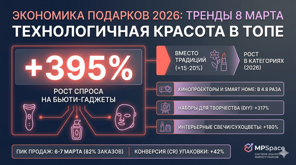 Рынок e-commerce в 2026 году окончательно перешел в стадию зрелости. Потребитель стал более избирательным, а борьба за его внимание теперь ведется не только ценой, но и точностью попадания в запрос. Анализ данных системы MPSpace показывает: традиционные представления о «женских подарках» стремительно устаревают, уступая место технологичности и функциональности.