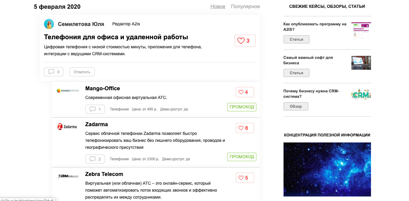 Для самостоятельного размещения сервиса сделали ЛК разработчика и отдельный кабинет для пользователя, чтобы на этого разработчика и сервис оставлял отзывы. В перспективе, с точки зрения прибыли и количества рекламодателей, мы смотрим в сторону таргетированной рекламы с оплатой по CPC или CPM. Это выгодно, поскольку дает возможность рекламодателям промоутить себя с 500 руб. Сейчас мы идем по стандартному пути, когда продаем место под баннер или первые места в каталоге на 1 мес и более. Гипотеза монетизации Недавно узнали о сайте Appsumo — известный зарубежный сайт с большими скидками на сервисы. В принципе, для запуска подобной инициативы наша площадка готова: есть большая база сервисов и раздел с промокодами. Проблема в небольшом размере аудитории и неуверенности смогут ли разработчики дать скидку в 80%. В представлении пользователей мы один из сотни похожих агрегатор в интернете. И даже симпатичный дизайн — не залог успеха. Поэтому первой попыткой повысить ценность и уникальность сайта стал запуск ленты новостей с подборками программ и промокодами. Примеры таких подборок: Гипотезу, что наша подача контента оказалась эффективной, мы проверяли через G. Analytics. Подборки публиковались весь январь и февраль. В аналитике в этот период увидели рост просмотра страниц. Мы поняли, что раздел оказался самым популярным, поэтому в ближайшее время вернемся к его наполнению. Мы площадка, где свободно выражают свое мнение о софте. Главное — в соответствии с законами РФ. Пользователи пишут много отзывов и позднее мы столкнулись с проблемой — часть отзывов о разработчиках были сильно негативными и даже оскорбительными. Отзывы из примера мы пока не размещаем на сервисе. Это может привести к судебным разбирательствам. Но надеемся в ближайшее время научиться отрабатывать такой негатив и привлекать к этому процессу разработчиков программ. Сейчас мы заполняем сервис новыми категориями, программами, учимся генерировать регулярный и полезный контент. Поисковой трафик растет каждый месяц и мы ставим задачу выйти в топ-5 по SEO. В завершение Пока писал статью придумал миссию стартапа. Непонятно как мы жили без нее: