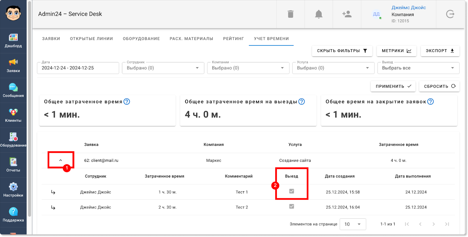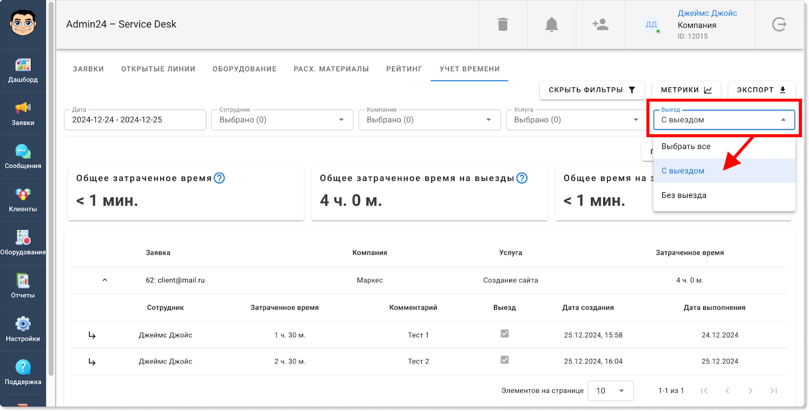 Теперь внутри заявок в Admin24 при добавлении времени можно помечать, что оно задано для выездных работ.