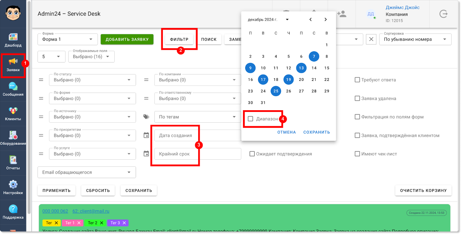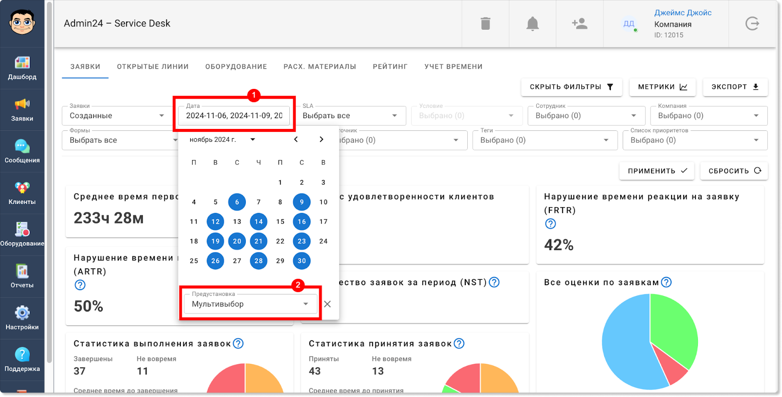 Добавлена возможность мультивыбора дат в фильтре в разделах «Заявки» и «Отчеты»