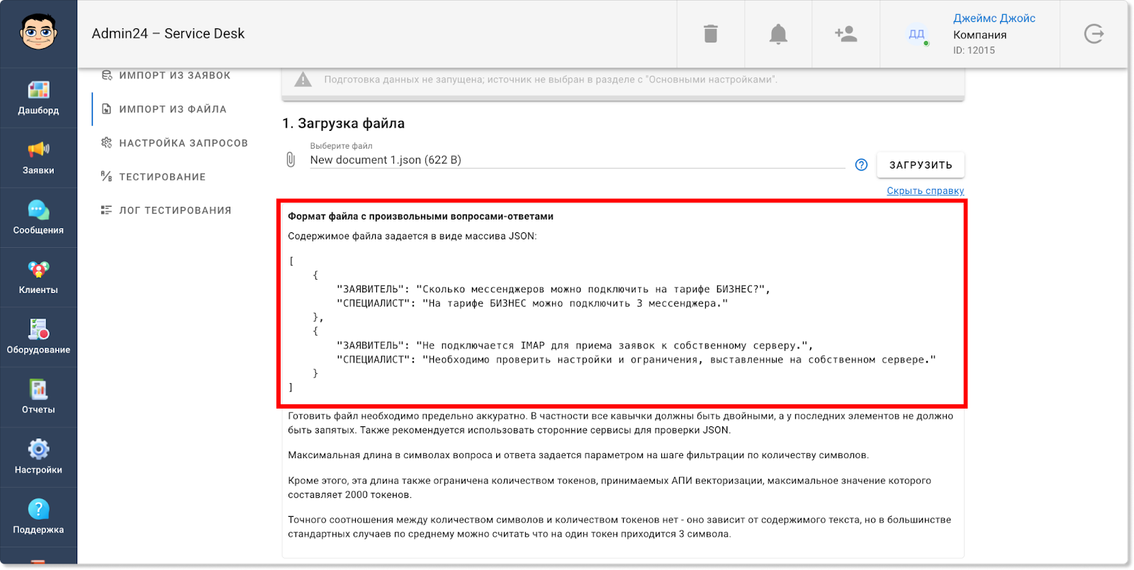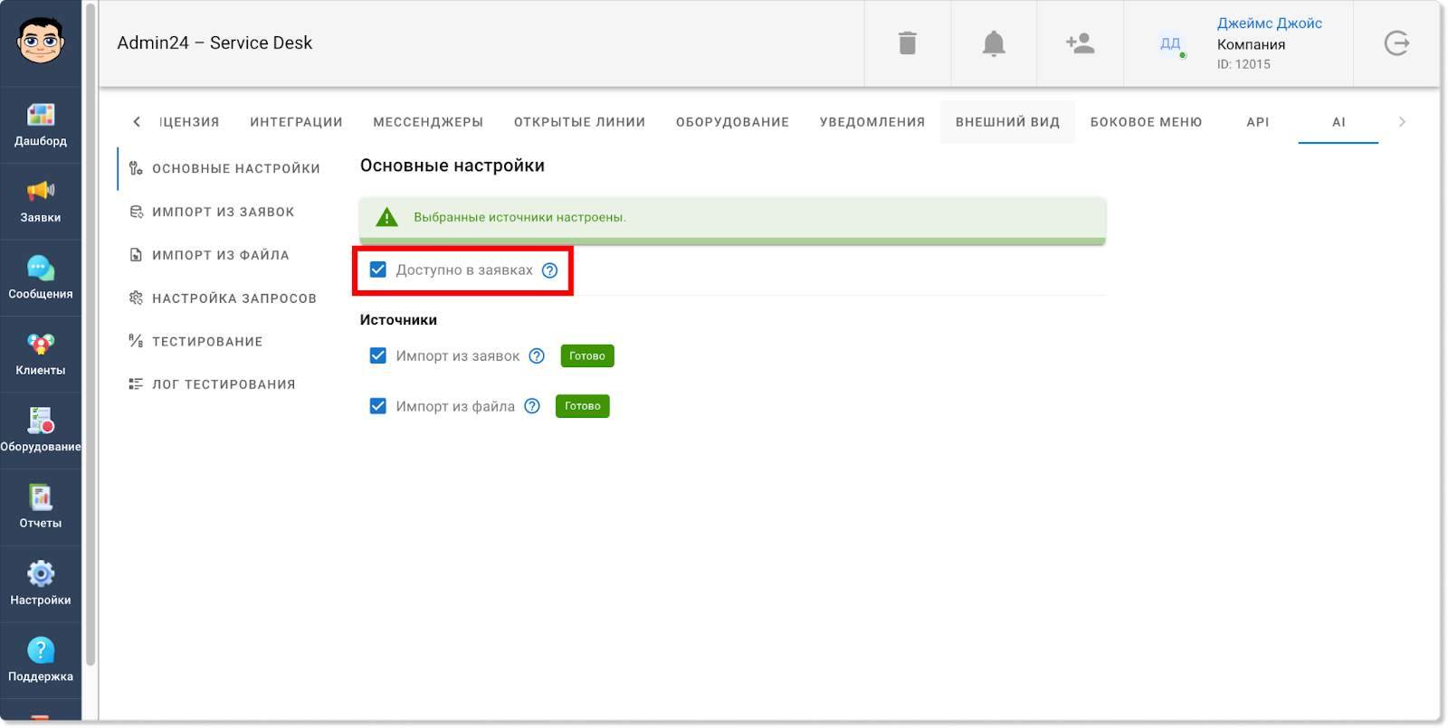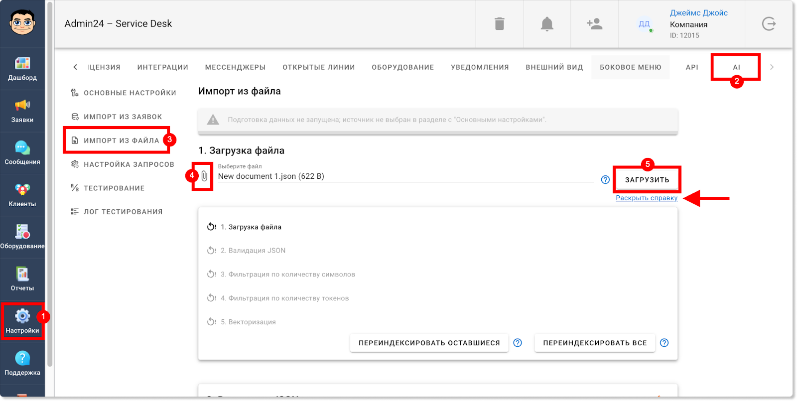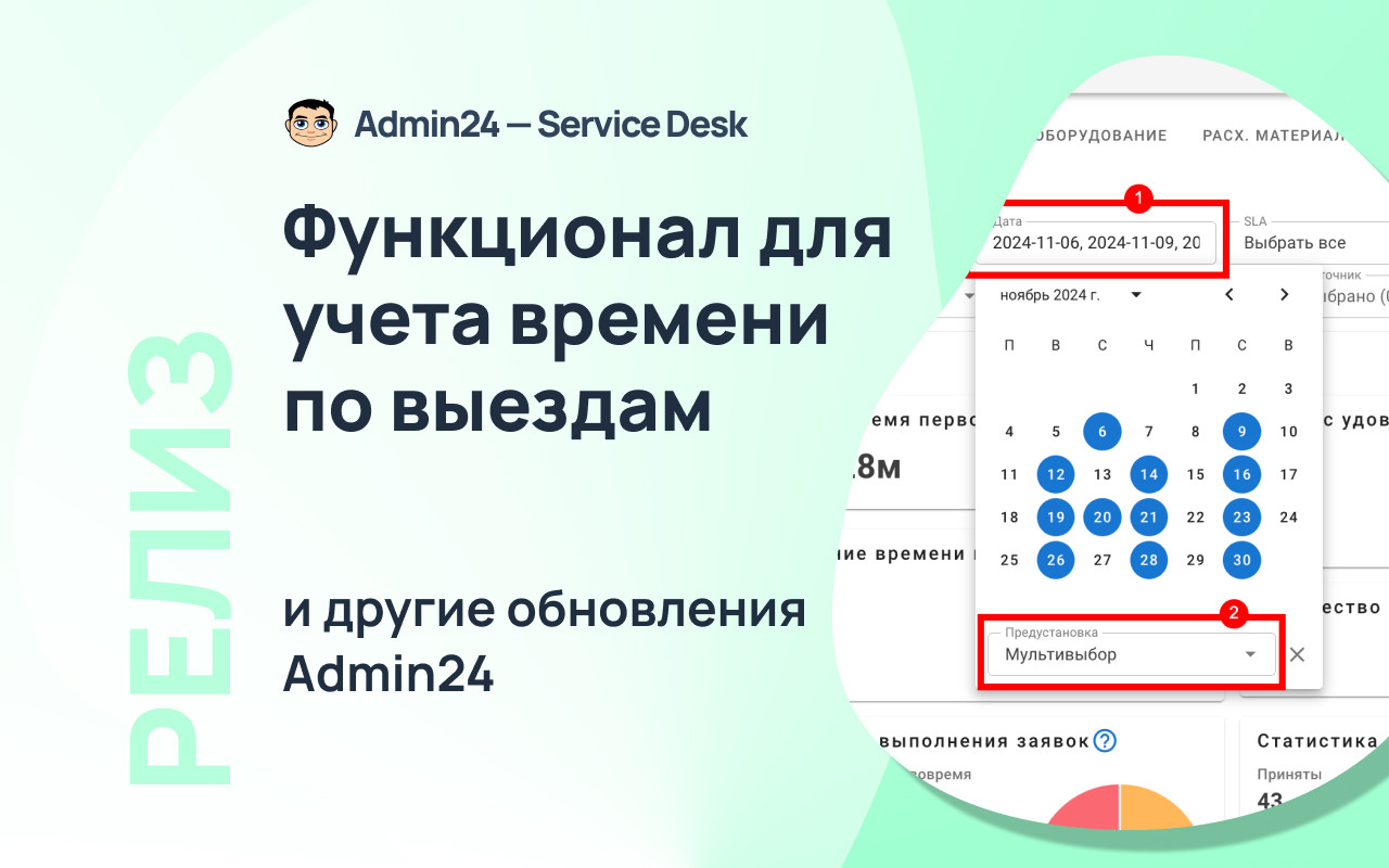 Информация по работам на выезде будет отображаться также и в разделе «Отчеты» → «Учет времени». Так, появилась отдельная метрика, которая показывает общее затраченное время на выезды. Также в таблице ниже у обращений, в которых задано время для выездных работ, в столбце «Выезд» будет стоять галочка: Кроме того, соответствующая графа появилась и в блоке «Фильтры». Чтобы задать фильтр для отображения заявок только с выездными работами или, наоборот, без них, нажмите кнопку «Показать фильтры» и в поле «Выезд» выберите пункт «С выездом» или «Без выезда». Теперь в разделах «Заявки» и «Отчеты» в фильтре можно выбирать не только одну конкретную дату или их диапазон, но также и множество разных дат. Так, чтобы выбрать несколько дат в разделе «Заявки», нажмите на кнопку «Фильтр», далее — на поле «Дата создания» или «Крайний срок» и уберите флажок в чекбоксе «Диапазон». После этого вы сможете выбрать нужные даты. Для мультивыбора дат в разделе «Отчеты» также сначала откройте фильтр, нажав кнопку «Показать фильтры». Затем нажмите на поле «Дата», в графе «Предустановка» выберите «Мультивыбор» и кликните на нужные даты. Прежде в разделе «Отчеты» в блоке «Отчеты по заявкам» теги у обращений отображались в скрытом виде. Чтобы их увидеть, нужно было нажать на знак решетки. Однако теперь можно настроить, чтобы теги по умолчанию отображались в развернутом виде. Чтобы это сделать, в разделе «Настройки» перейдите во вкладку «Внешний вид», далее — в «Отчеты». И в поле «Выберите внешний вид для страницы отчетов» нажмите на пункт «Отображать все теги». Сохраните изменения. После этого теги будут отображаться в развернутом виде. В этом релизе Admin24 появилось также нововведение для тех, кто тестирует AI-агента. Так, мы добавили возможность самостоятельно наполнять контекст искусственного интеллекта разными вопросами. Это позволит повысить качество его ответов. Чтобы добавить свои вопросы и ответы, в настройках сервис-деска перейдите во вкладку «AI» → «Импорт файлов». Далее — нажмите на значок скрепки, выберите файл в формате .json и нажмите кнопку «Загрузить». Важно! Обратите внимание на то, в каком виде должно быть содержимое файла. Для этого нажмите «Раскрыть справку» (на скриншоте выше указано стрелкой) и внимательно изучите требования. Когда файл будет загружен, нажмите кнопку «Проиндексировать все», чтобы разом запустить выполнение всех шагов индексации. Отметим, что есть возможность запускать и перезапускать отдельные шаги, например, после изменения настроек фильтрации. Это можно сделать, нажав на кнопку «Запустить» рядом с конкретным шагом. Однако стоит учитывать, что в таком случае шаги нужно запускать по одному после того, как полностью выполнится предыдущий шаг. Если необходимо повторно запустить шаги после изменения настроек фильтрации, можно также воспользоваться кнопкой «Проиндексировать оставшиеся» — в этом случае система самостоятельно по очереди перезапустит каждый шаг. Чтобы после индексации ИИ для ответов на запросы использовал информацию из импортированного файла, необходимо активировать соответствующий источник данных в новой вкладке «Основные настройки»: Здесь вы можете выбрать, какие в принципе источники будут использоваться при формировании контекста нейросети: информация из заявок, информация из файла с вопроса
