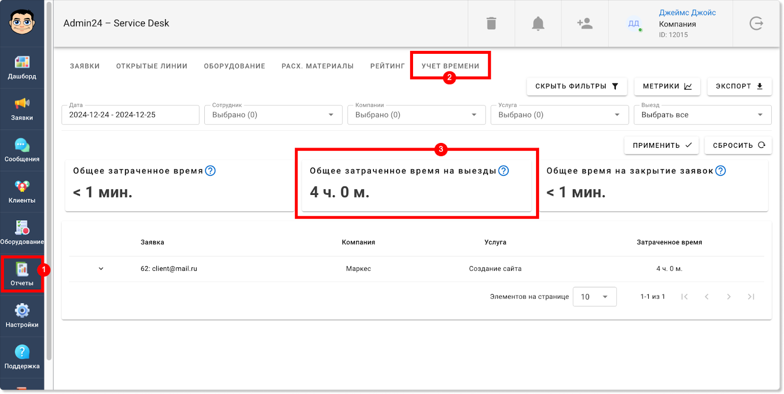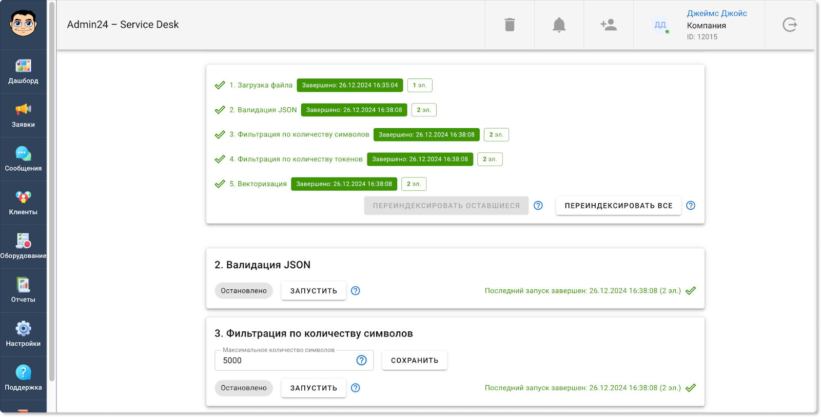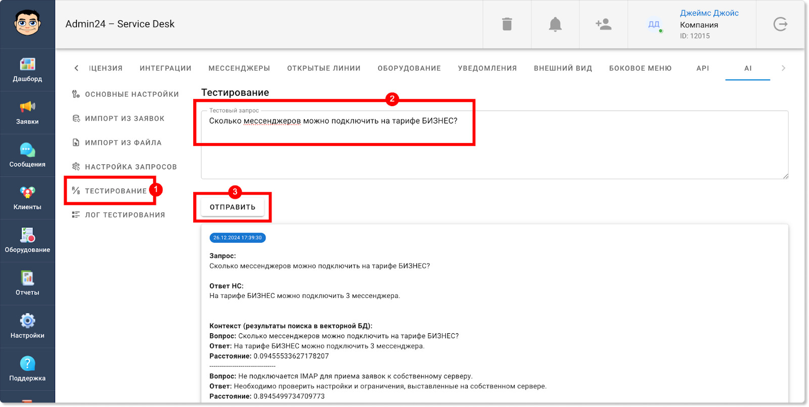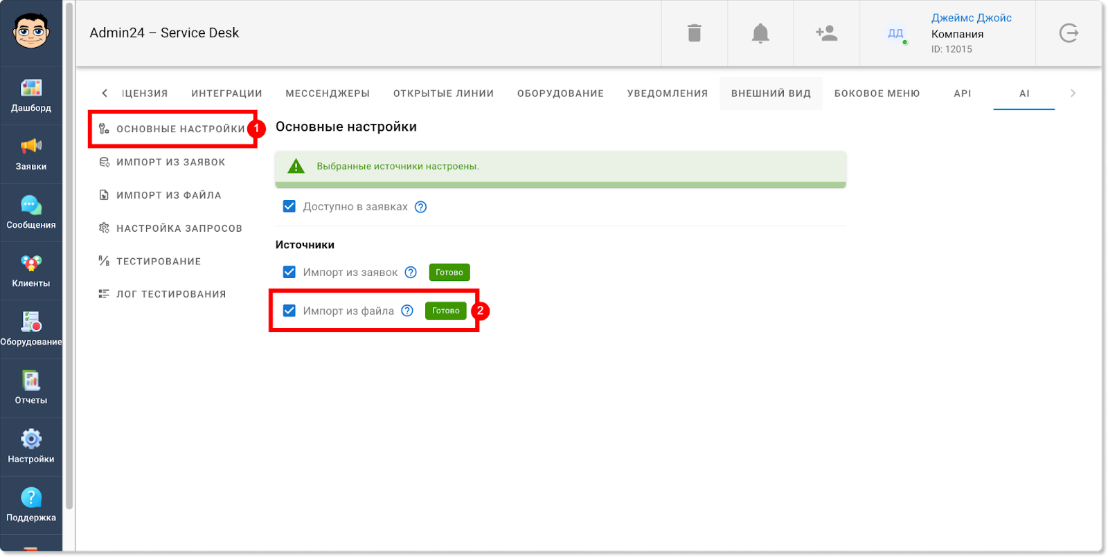 Информация по работам на выезде будет отображаться также и в разделе «Отчеты» → «Учет времени». Так, появилась отдельная метрика, которая показывает общее затраченное время на выезды. Также в таблице ниже у обращений, в которых задано время для выездных работ, в столбце «Выезд» будет стоять галочка: Кроме того, соответствующая графа появилась и в блоке «Фильтры». Чтобы задать фильтр для отображения заявок только с выездными работами или, наоборот, без них, нажмите кнопку «Показать фильтры» и в поле «Выезд» выберите пункт «С выездом» или «Без выезда». Теперь в разделах «Заявки» и «Отчеты» в фильтре можно выбирать не только одну конкретную дату или их диапазон, но также и множество разных дат. Так, чтобы выбрать несколько дат в разделе «Заявки», нажмите на кнопку «Фильтр», далее — на поле «Дата создания» или «Крайний срок» и уберите флажок в чекбоксе «Диапазон». После этого вы сможете выбрать нужные даты. Для мультивыбора дат в разделе «Отчеты» также сначала откройте фильтр, нажав кнопку «Показать фильтры». Затем нажмите на поле «Дата», в графе «Предустановка» выберите «Мультивыбор» и кликните на нужные даты. Прежде в разделе «Отчеты» в блоке «Отчеты по заявкам» теги у обращений отображались в скрытом виде. Чтобы их увидеть, нужно было нажать на знак решетки. Однако теперь можно настроить, чтобы теги по умолчанию отображались в развернутом виде. Чтобы это сделать, в разделе «Настройки» перейдите во вкладку «Внешний вид», далее — в «Отчеты». И в поле «Выберите внешний вид для страницы отчетов» нажмите на пункт «Отображать все теги». Сохраните изменения. После этого теги будут отображаться в развернутом виде. В этом релизе Admin24 появилось также нововведение для тех, кто тестирует AI-агента. Так, мы добавили возможность самостоятельно наполнять контекст искусственного интеллекта разными вопросами. Это позволит повысить качество его ответов. Чтобы добавить свои вопросы и ответы, в настройках сервис-деска перейдите во вкладку «AI» → «Импорт файлов». Далее — нажмите на значок скрепки, выберите файл в формате .json и нажмите кнопку «Загрузить». Важно! Обратите внимание на то, в каком виде должно быть содержимое файла. Для этого нажмите «Раскрыть справку» (на скриншоте выше указано стрелкой) и внимательно изучите требования. Когда файл будет загружен, нажмите кнопку «Проиндексировать все», чтобы разом запустить выполнение всех шагов индексации. Отметим, что есть возможность запускать и перезапускать отдельные шаги, например, после изменения настроек фильтрации. Это можно сделать, нажав на кнопку «Запустить» рядом с конкретным шагом. Однако стоит учитывать, что в таком случае шаги нужно запускать по одному после того, как полностью выполнится предыдущий шаг. Если необходимо повторно запустить шаги после изменения настроек фильтрации, можно также воспользоваться кнопкой «Проиндексировать оставшиеся» — в этом случае система самостоятельно по очереди перезапустит каждый шаг. Чтобы после индексации ИИ для ответов на запросы использовал информацию из импортированного файла, необходимо активировать соответствующий источник данных в новой вкладке «Основные настройки»: Здесь вы можете выбрать, какие в принципе источники будут использоваться при формировании контекста нейросети: информация из заявок, информация из файла с вопроса