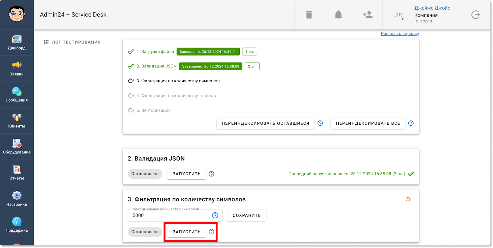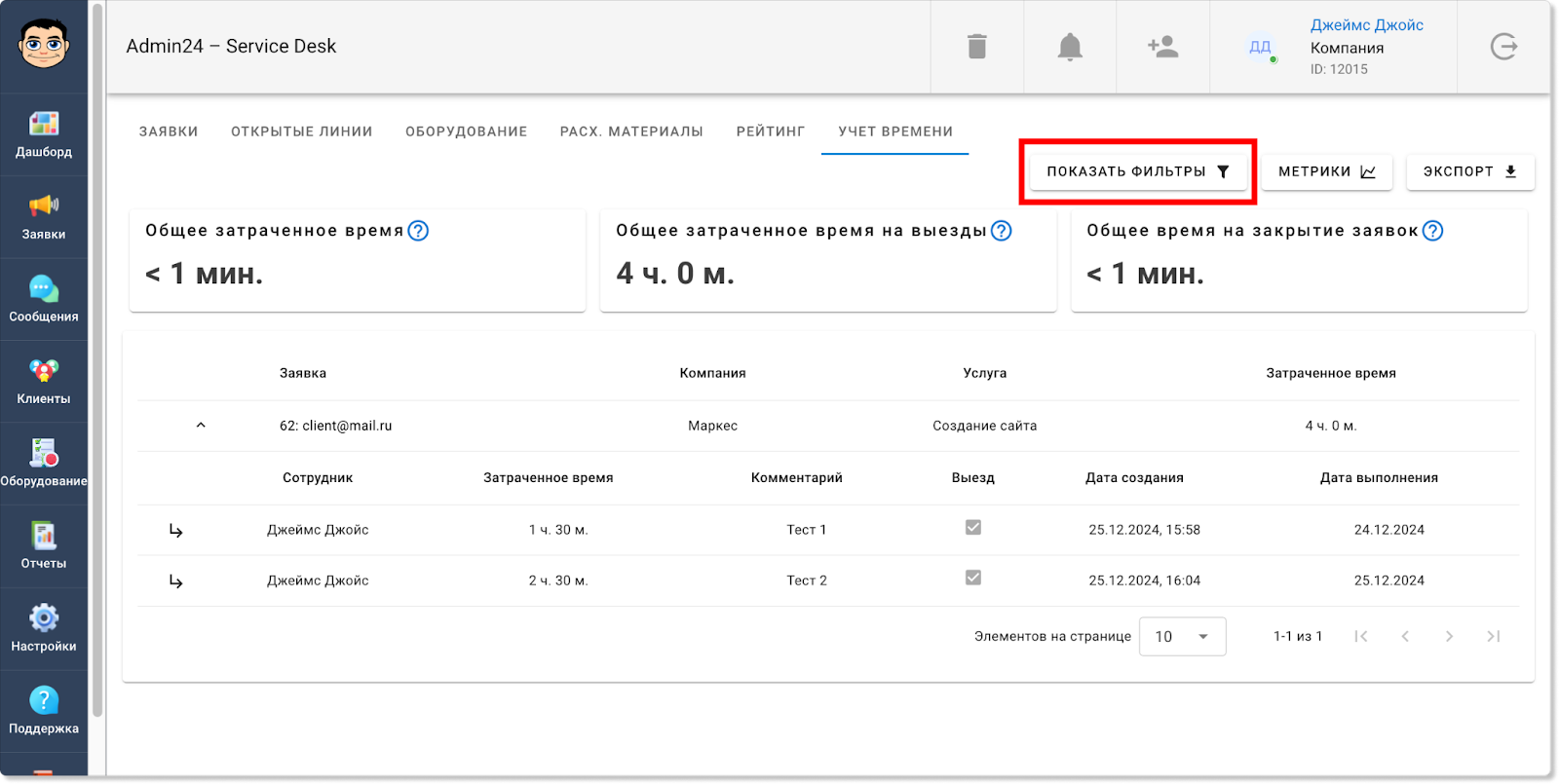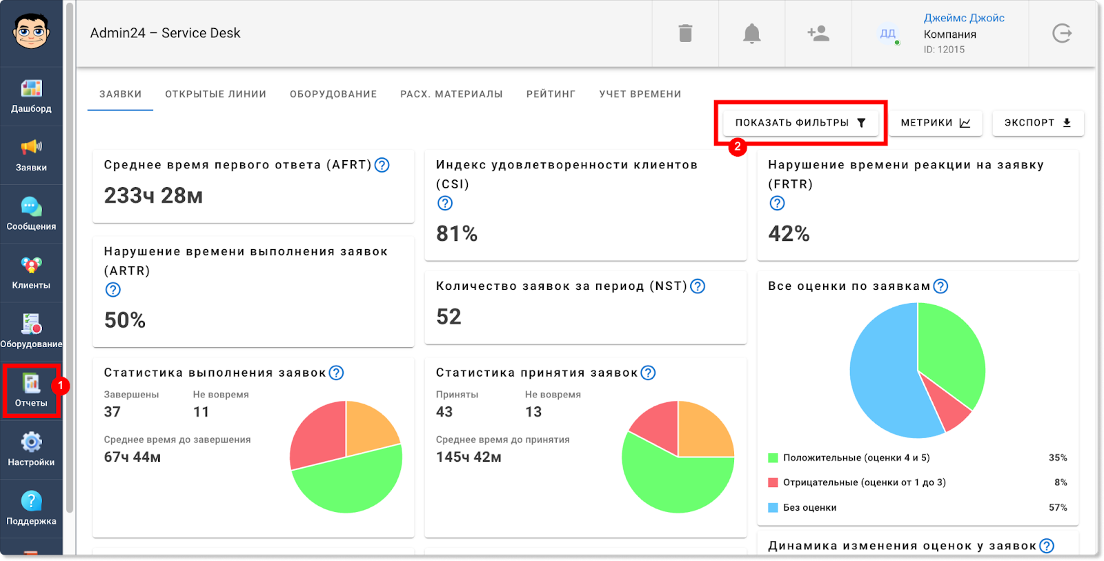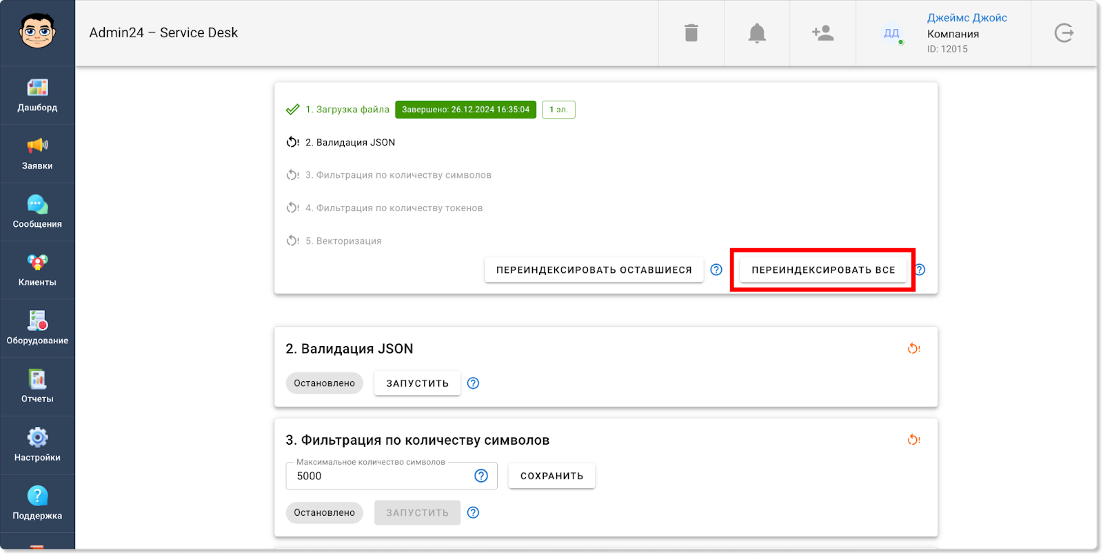 Информация по работам на выезде будет отображаться также и в разделе «Отчеты» → «Учет времени». Так, появилась отдельная метрика, которая показывает общее затраченное время на выезды. Также в таблице ниже у обращений, в которых задано время для выездных работ, в столбце «Выезд» будет стоять галочка: Кроме того, соответствующая графа появилась и в блоке «Фильтры». Чтобы задать фильтр для отображения заявок только с выездными работами или, наоборот, без них, нажмите кнопку «Показать фильтры» и в поле «Выезд» выберите пункт «С выездом» или «Без выезда». Теперь в разделах «Заявки» и «Отчеты» в фильтре можно выбирать не только одну конкретную дату или их диапазон, но также и множество разных дат. Так, чтобы выбрать несколько дат в разделе «Заявки», нажмите на кнопку «Фильтр», далее — на поле «Дата создания» или «Крайний срок» и уберите флажок в чекбоксе «Диапазон». После этого вы сможете выбрать нужные даты. Для мультивыбора дат в разделе «Отчеты» также сначала откройте фильтр, нажав кнопку «Показать фильтры». Затем нажмите на поле «Дата», в графе «Предустановка» выберите «Мультивыбор» и кликните на нужные даты. Прежде в разделе «Отчеты» в блоке «Отчеты по заявкам» теги у обращений отображались в скрытом виде. Чтобы их увидеть, нужно было нажать на знак решетки. Однако теперь можно настроить, чтобы теги по умолчанию отображались в развернутом виде. Чтобы это сделать, в разделе «Настройки» перейдите во вкладку «Внешний вид», далее — в «Отчеты». И в поле «Выберите внешний вид для страницы отчетов» нажмите на пункт «Отображать все теги». Сохраните изменения. После этого теги будут отображаться в развернутом виде. В этом релизе Admin24 появилось также нововведение для тех, кто тестирует AI-агента. Так, мы добавили возможность самостоятельно наполнять контекст искусственного интеллекта разными вопросами. Это позволит повысить качество его ответов. Чтобы добавить свои вопросы и ответы, в настройках сервис-деска перейдите во вкладку «AI» → «Импорт файлов». Далее — нажмите на значок скрепки, выберите файл в формате .json и нажмите кнопку «Загрузить». Важно! Обратите внимание на то, в каком виде должно быть содержимое файла. Для этого нажмите «Раскрыть справку» (на скриншоте выше указано стрелкой) и внимательно изучите требования. Когда файл будет загружен, нажмите кнопку «Проиндексировать все», чтобы разом запустить выполнение всех шагов индексации. Отметим, что есть возможность запускать и перезапускать отдельные шаги, например, после изменения настроек фильтрации. Это можно сделать, нажав на кнопку «Запустить» рядом с конкретным шагом. Однако стоит учитывать, что в таком случае шаги нужно запускать по одному после того, как полностью выполнится предыдущий шаг. Если необходимо повторно запустить шаги после изменения настроек фильтрации, можно также воспользоваться кнопкой «Проиндексировать оставшиеся» — в этом случае система самостоятельно по очереди перезапустит каждый шаг. Чтобы после индексации ИИ для ответов на запросы использовал информацию из импортированного файла, необходимо активировать соответствующий источник данных в новой вкладке «Основные настройки»: Здесь вы можете выбрать, какие в принципе источники будут использоваться при формировании контекста нейросети: информация из заявок, информация из файла с вопроса