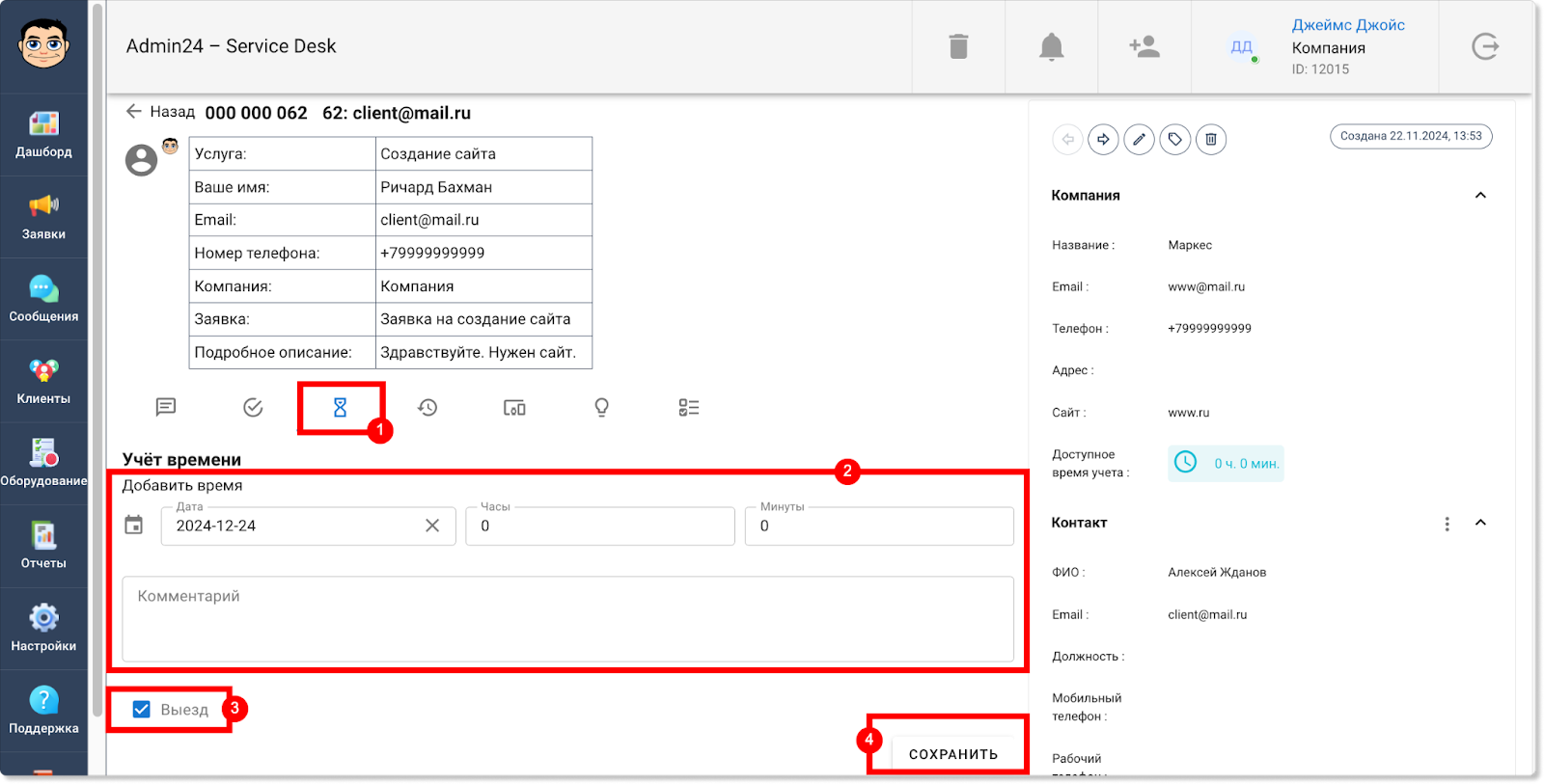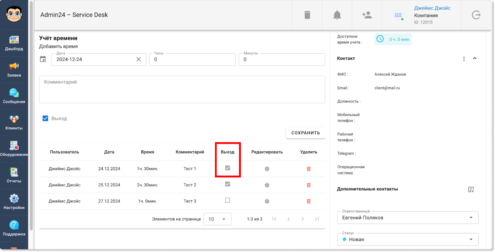 Перейдите во вкладку «Учет времени» с изображением песочных часов. Укажите дату, время и добавьте комментарий. Далее поставьте галочку в чекбоксе «Выезд» и нажмите кнопку «Сохранить».