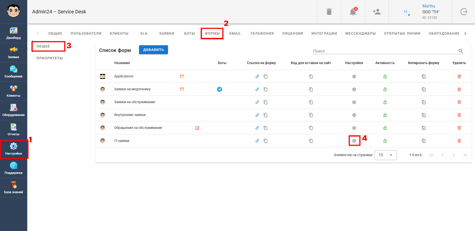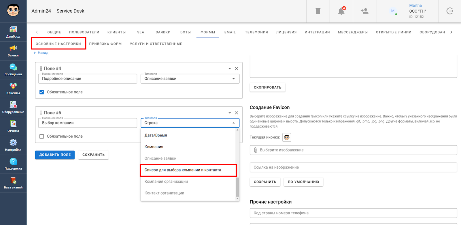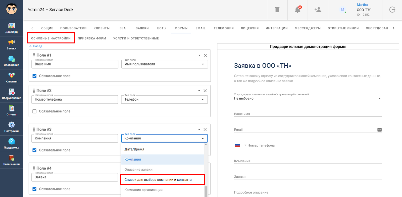 Теперь в настройках формы можно настроить возможность выбора компании и контакта из формы. Чтобы это сделать, перейдите в раздел «Настройки» на вкладку «Формы» и откройте настройки нужной вам формы: