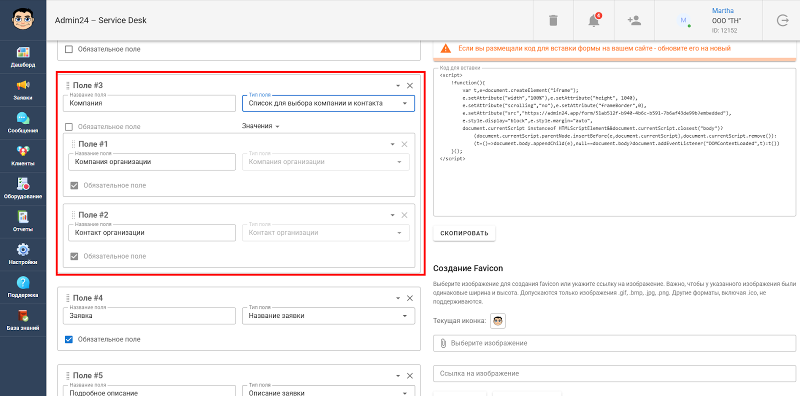Важно! Включить возможность выбора компании и контакта из формы можно только если в форме еще нет соответствующего поля или полей «Почта» или «Компания»