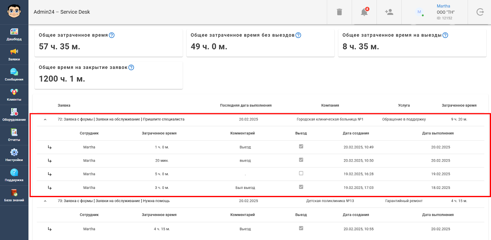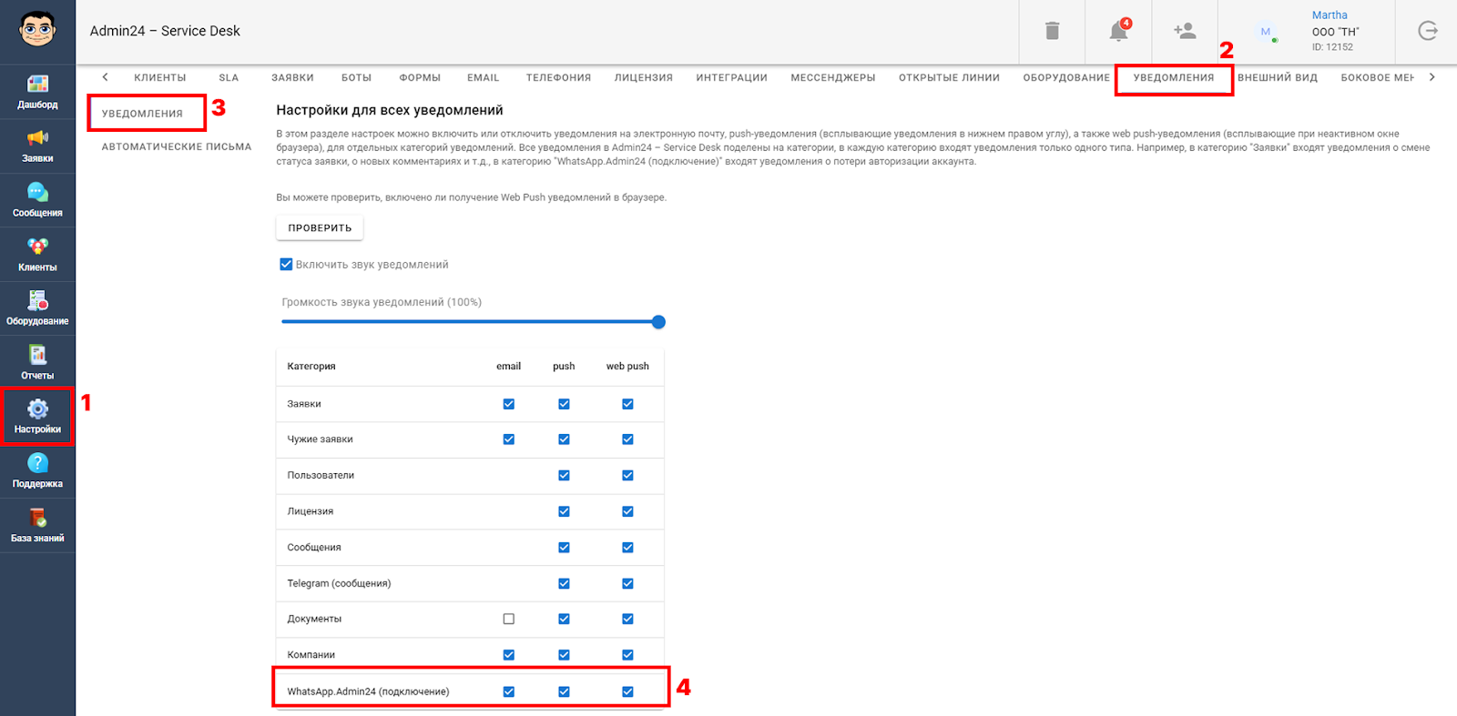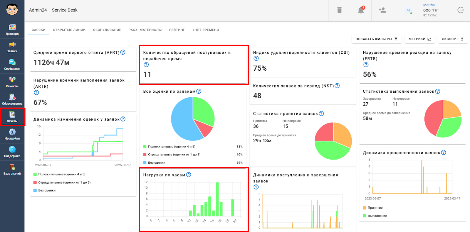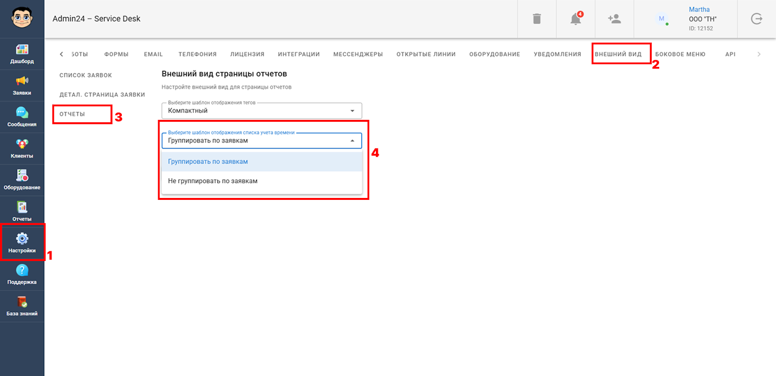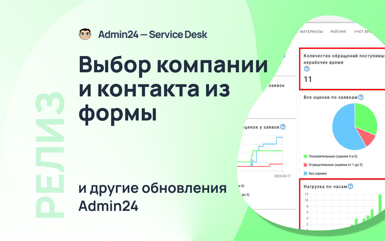 В форме появятся поля «Компания организации» и «Контакт организации». В поле «Компания организации» будет отображаться список компаний, привязанных к данной форме: В поле «Контакт организации» после того, как будет выбрана компания, отобразится список контактов, привязанных к данной компании: Важно! Поля «Компания организации» и «Контакт организации» обязательны для заполнения по умолчанию. В карточке заявки все данные о компании и контакте будут заполнены автоматически: Если в настройках формы был настроен выбор компании и контакта из формы, то появится возможность настроить ответственного для конкретной компании. Чтобы это сделать, перейдите в раздел «Настройки» на вкладку «Формы» и откройте настройки нужной вам формы: В настройках формы перейдите в подраздел «Услуги и ответственные». Внизу в нем появится блок «Назначить ответственного для компаний» с соответствующим функционалом. Настройка определяет назначение ответственного по заявке для компании, выбранной при подаче заявки Теперь вы можете изменить внешний вид отчета по учету времени. Сделать это можно в разделе «Настройки», перейдя на вкладку «Внешний вид» → «Отчеты». В блоке «Выберите шаблон отображения списка учета времени» можно выбрать настройку «Группировать» или «Не группировать» отчеты по заявкам. Вот так выглядит отчет с группировкой по заявкам: Сгруппированный отчет можно раскрыть и посмотреть подробности: Если выбрать пункт «Не группировать отчеты по заявкам», то учет времени будет отображаться подряд, в зависимости от даты создания: В разделе «Отчеты» появились 2 новые метрики: Обе эти метрики позволят вам скорректировать график работы сотрудников и более грамотно распределять трудовые ресурсы. Добавлены настраиваемые уведомления о потере авторизации аккаунта WhatsApp*. Настроить их можно в разделе «Настройки», перейдя на вкладку «Уведомления» → «Уведомления». Можно включить или отключить уведомления на электронную почту, push-уведомления (всплывающие уведомления в нижнем правом углу), а также web push-уведомления (всплывающие при неактивном окне браузера). *Деятельность компании Meta, владеющей WhatsApp и Facebook, запрещена на территории РФ.