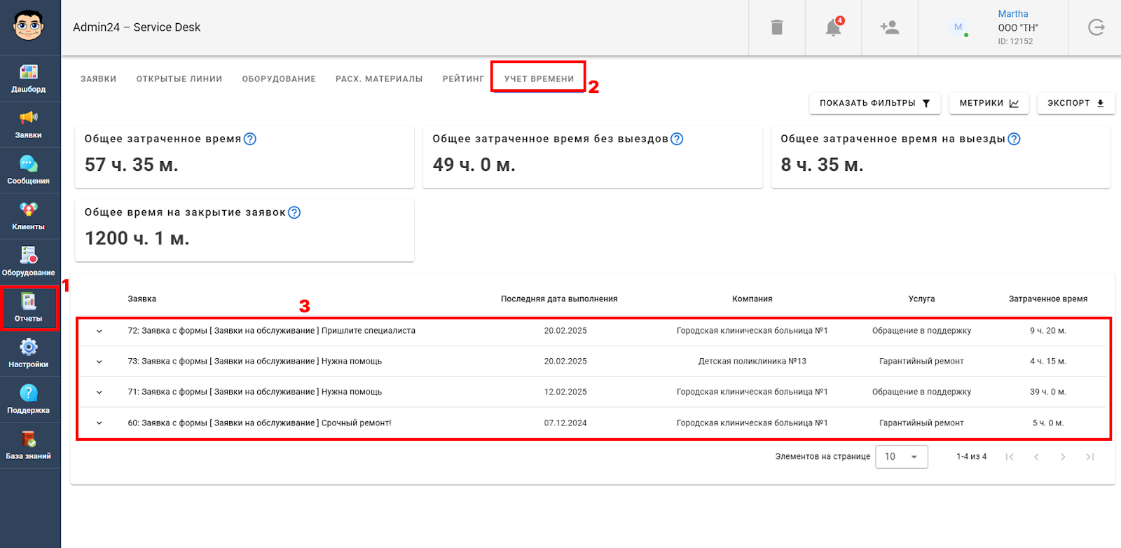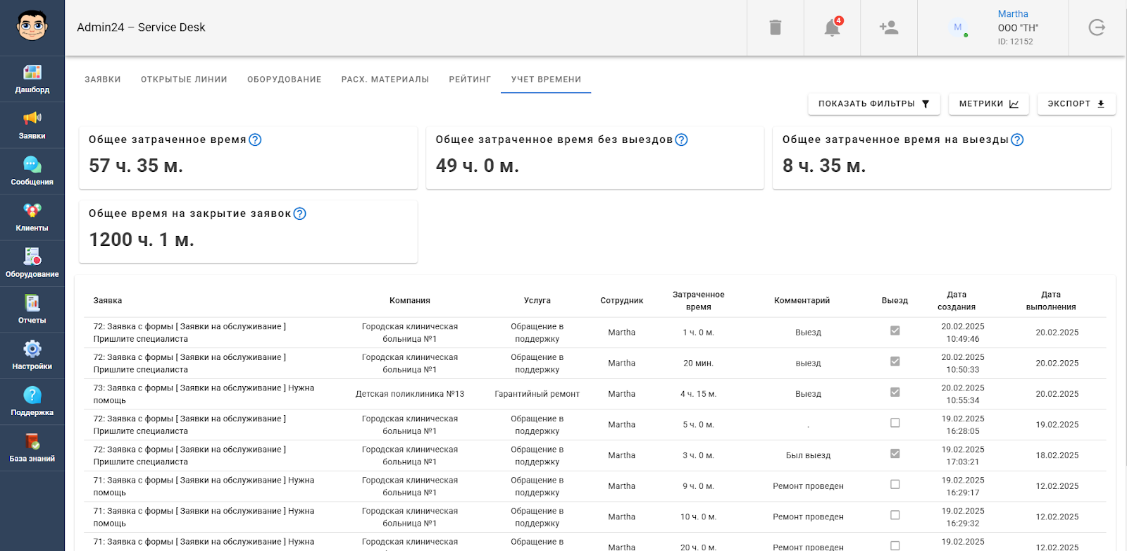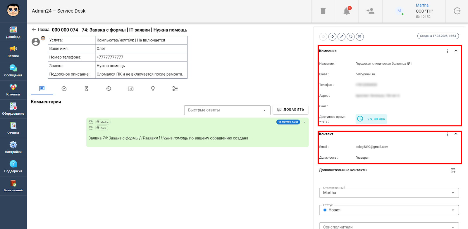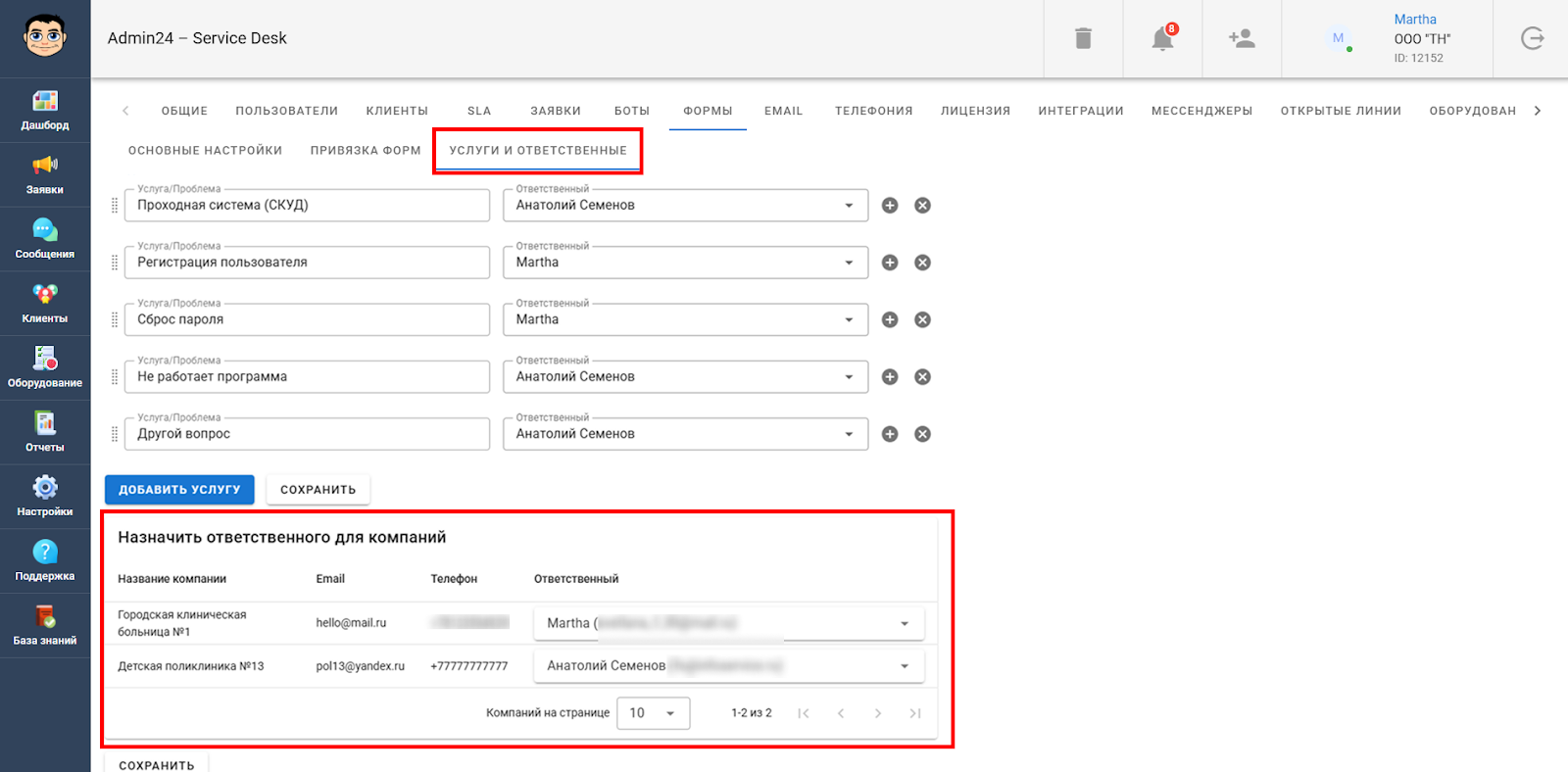 В форме появятся поля «Компания организации» и «Контакт организации». В поле «Компания организации» будет отображаться список компаний, привязанных к данной форме: В поле «Контакт организации» после того, как будет выбрана компания, отобразится список контактов, привязанных к данной компании: Важно! Поля «Компания организации» и «Контакт организации» обязательны для заполнения по умолчанию. В карточке заявки все данные о компании и контакте будут заполнены автоматически: Если в настройках формы был настроен выбор компании и контакта из формы, то появится возможность настроить ответственного для конкретной компании. Чтобы это сделать, перейдите в раздел «Настройки» на вкладку «Формы» и откройте настройки нужной вам формы: В настройках формы перейдите в подраздел «Услуги и ответственные». Внизу в нем появится блок «Назначить ответственного для компаний» с соответствующим функционалом. Настройка определяет назначение ответственного по заявке для компании, выбранной при подаче заявки Теперь вы можете изменить внешний вид отчета по учету времени. Сделать это можно в разделе «Настройки», перейдя на вкладку «Внешний вид» → «Отчеты». В блоке «Выберите шаблон отображения списка учета времени» можно выбрать настройку «Группировать» или «Не группировать» отчеты по заявкам. Вот так выглядит отчет с группировкой по заявкам: Сгруппированный отчет можно раскрыть и посмотреть подробности: Если выбрать пункт «Не группировать отчеты по заявкам», то учет времени будет отображаться подряд, в зависимости от даты создания: В разделе «Отчеты» появились 2 новые метрики: Обе эти метрики позволят вам скорректировать график работы сотрудников и более грамотно распределять трудовые ресурсы. Добавлены настраиваемые уведомления о потере авторизации аккаунта WhatsApp*. Настроить их можно в разделе «Настройки», перейдя на вкладку «Уведомления» → «Уведомления». Можно включить или отключить уведомления на электронную почту, push-уведомления (всплывающие уведомления в нижнем правом углу), а также web push-уведомления (всплывающие при неактивном окне браузера). *Деятельность компании Meta, владеющей WhatsApp и Facebook, запрещена на территории РФ.